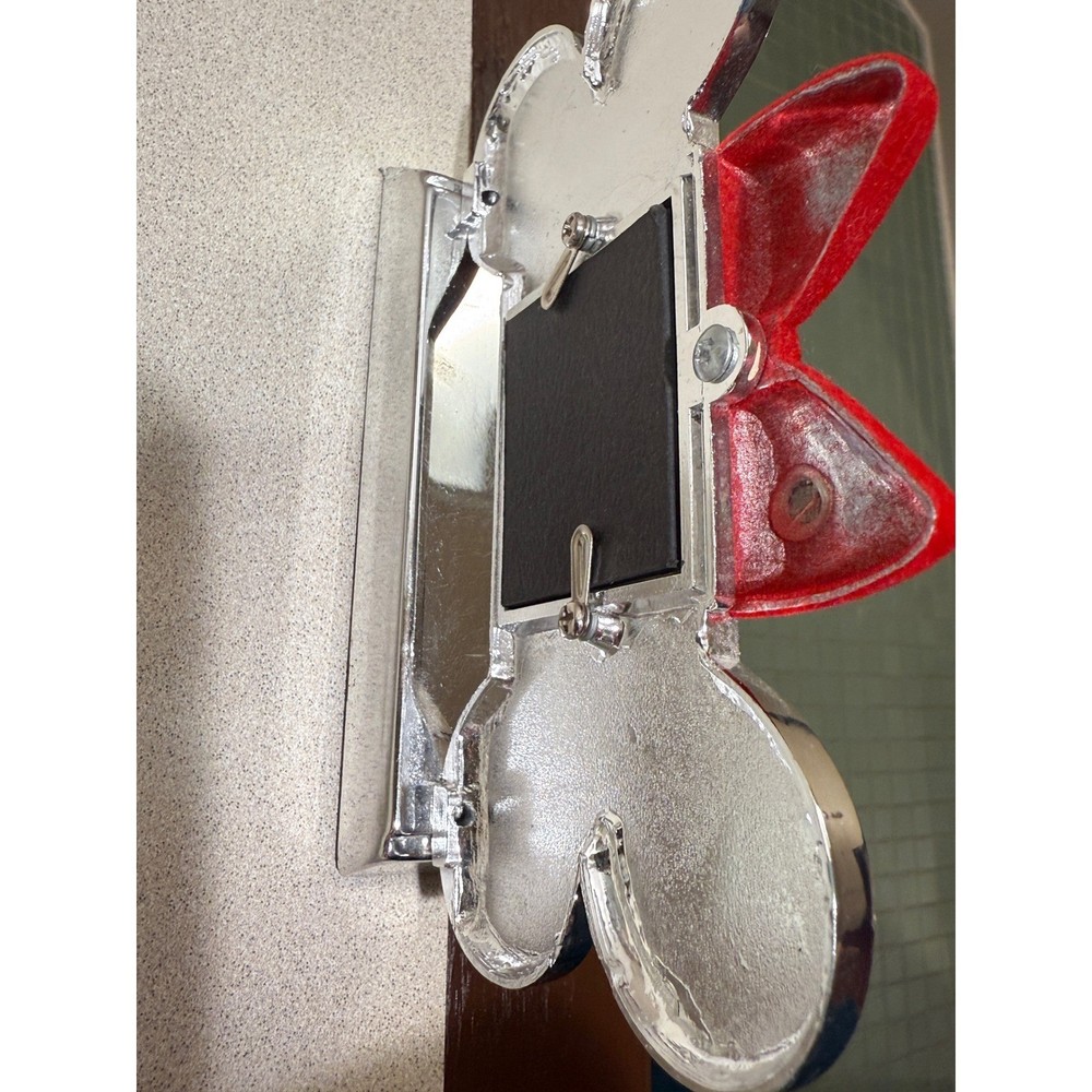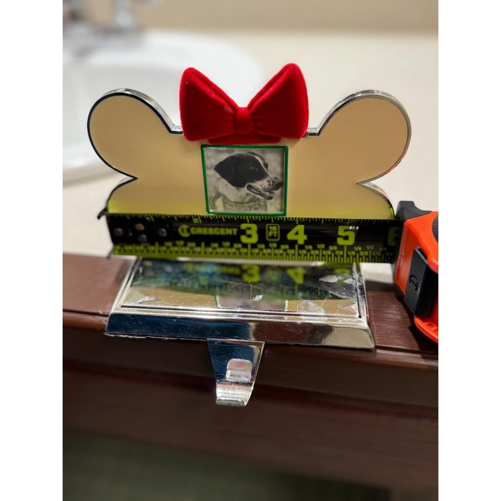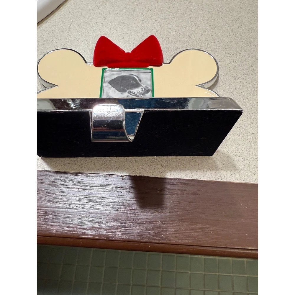 Dog bone Christmas stocking holder features a polished silver-tone base with a cream-colored bone-shaped topper. A festive red velvet bow sits atop a small square photo frame, allowing for a personalized touch with a picture of a beloved pet. The weighted design ensures stability on a mantel or shelf, while the underside is felt-lined to protect surfaces from scratches. Measurements: • Width: 5" • Depth: 3.75" • Height: 5"