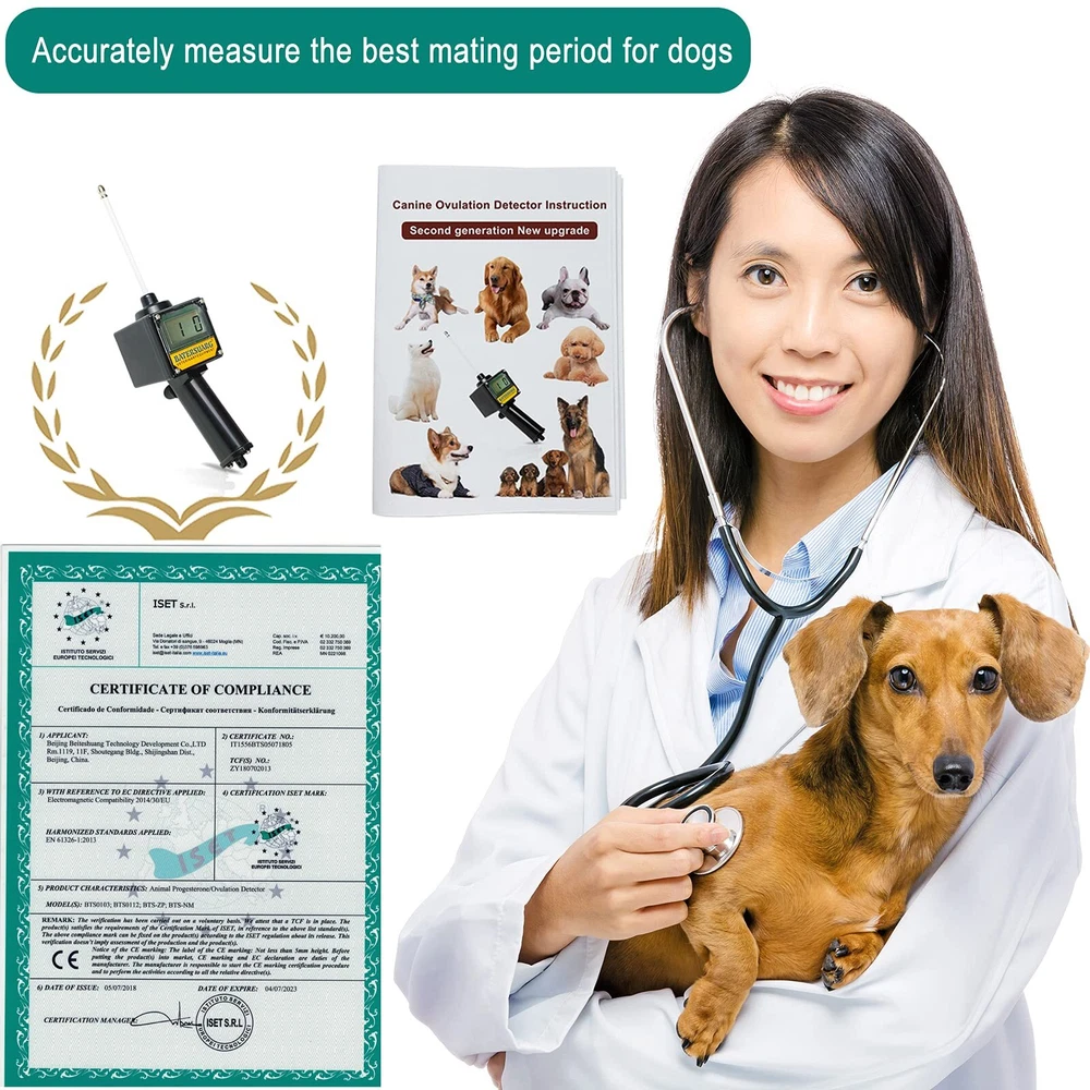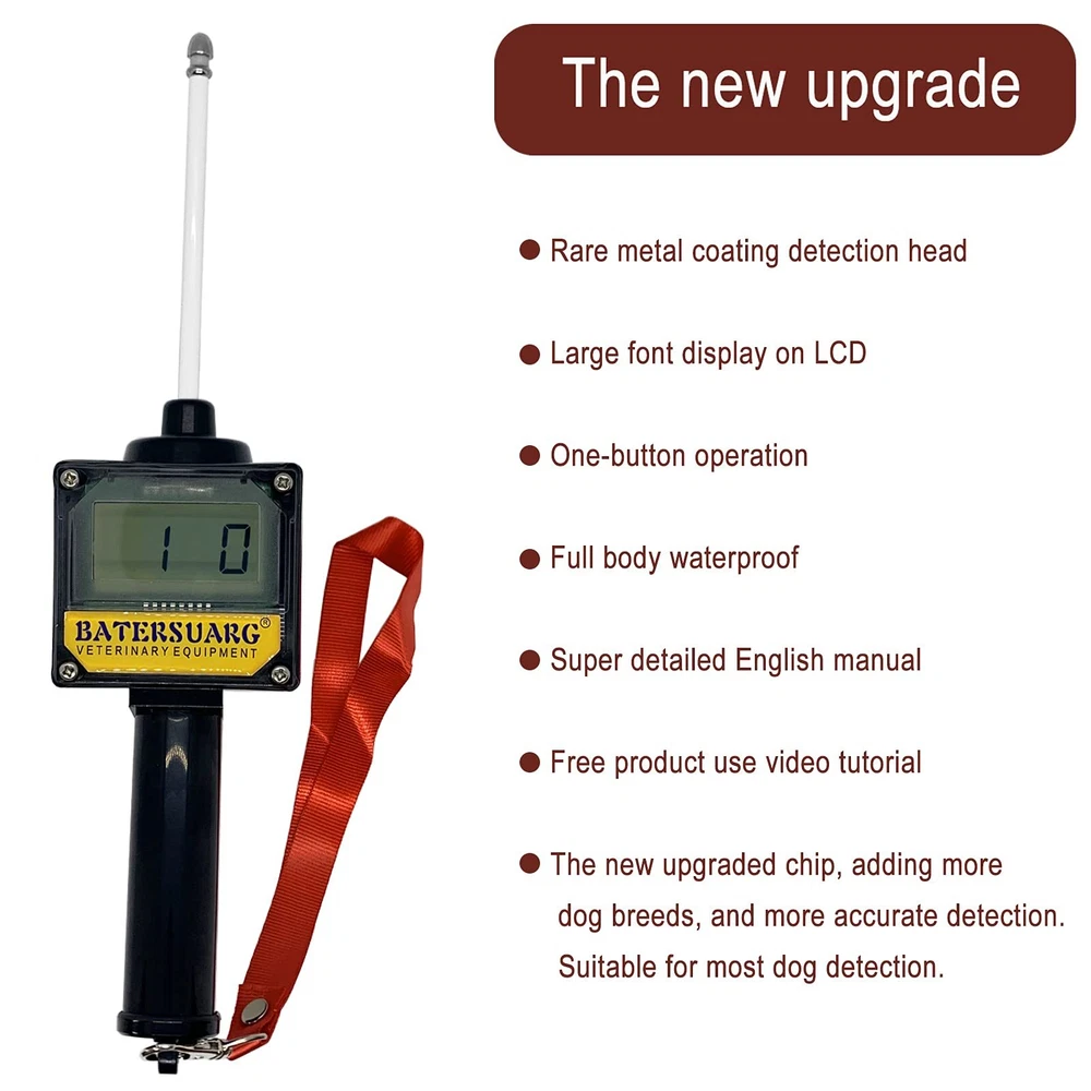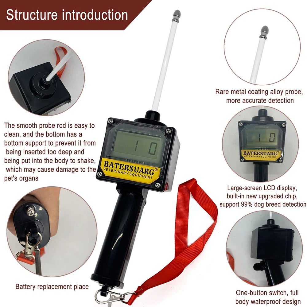 Package list: Heat detector x 1 Battery x 1 Detailed English manual x 1 Storage box x 1 ▶Simple to use:You only need to insert the instrument and press the button to get the data, equipped with a new detailed English manual, the detailed instructions with the data displayed on the screen, you can measure whether your pet is in estrus , Which stage is in the estrus, and the time when it enters the ovulation period, and the best mating time. Help eliminate the cost and time of repeated mating, as well as reduce the cost of expensive veterinary visits. ▶New upgrades: 1. Using alloy probes, the data is more accurate. 2. Equipped with more detailed English instructions, which explain in detail the different periods corresponding to different data. 3. The newly upgraded chip is suitable for 99% of pet dogs. 4. Special materials are used at the probe rod to facilitate cleaning. ▶How to use: Put the dog in a standing state before use, insert the probe diagonally upward, insert 4 cm for small dogs, 6-8 cm for medium dogs, and 10 cm for large dogs. After inserting, keep the instrument still, click the button after rotating for weeks, the data will appear, measure the data three times, take the closest sets of data as the basis, the data on the instructions for use, and get the result. ▶Note: In order to obtain accurate data, please use a cotton cloth dipped in appropriate water to wipe the probe and probe rod before use. Wipe thoroughly and rinse with water. Do not wipe off the water after rinsing, and use it directly. When using, be sure to insert it diagonally upward to avoid hurting the dog. Please clean the probe and probe rod again after use. Please return the instrument to the box after each use. ▶High quality: Made of polyethylene with good stability and insulation, the whole instrument is waterproof, so the whole body of the instrument can be cleaned. The handle adopts ergonomic design, which is more convenient when using the instrument.