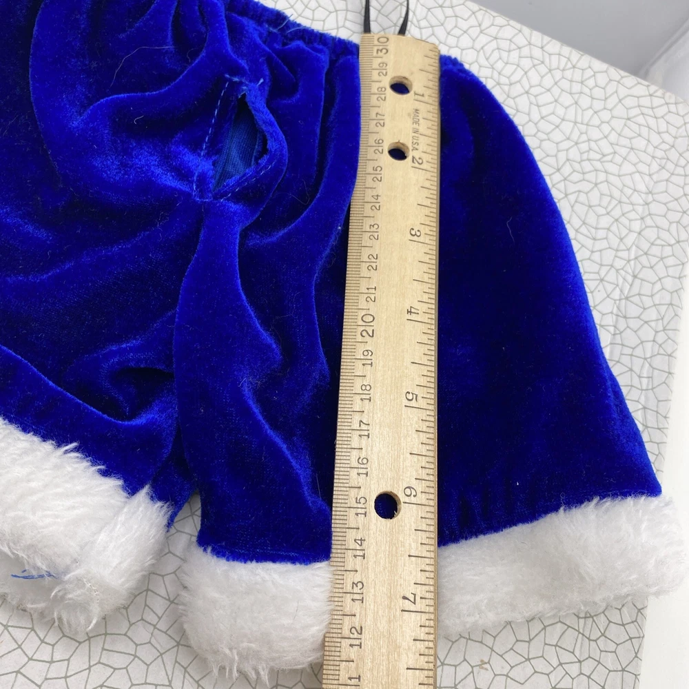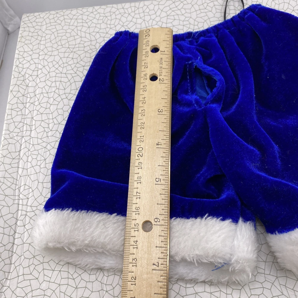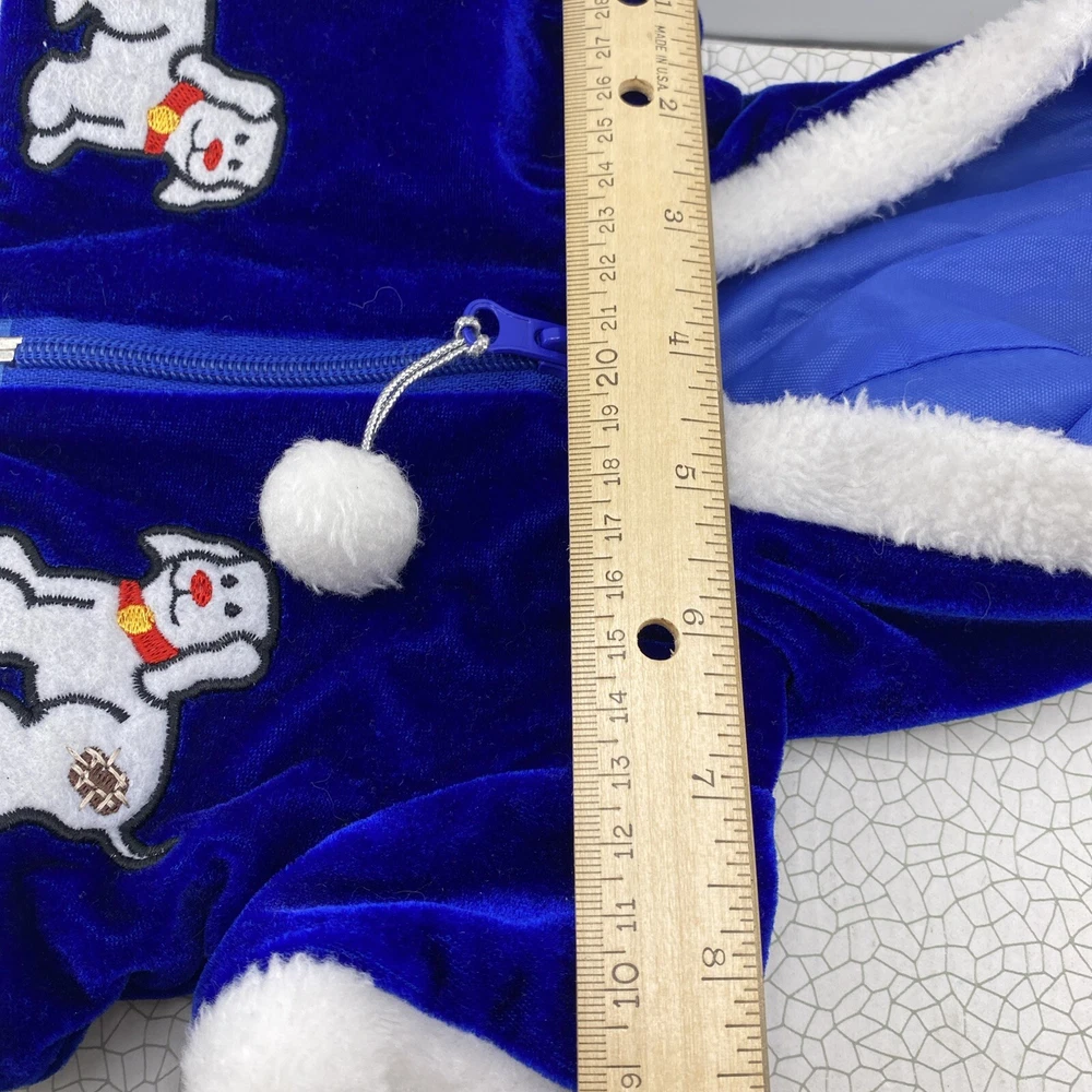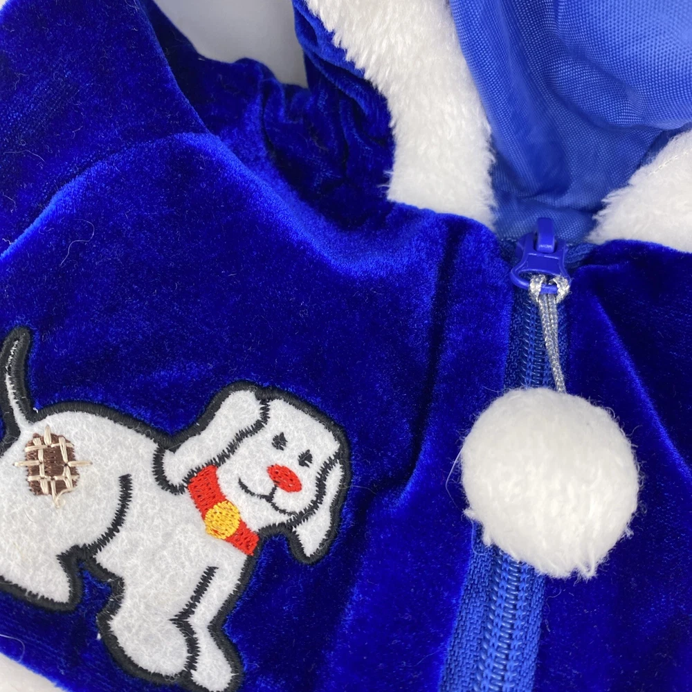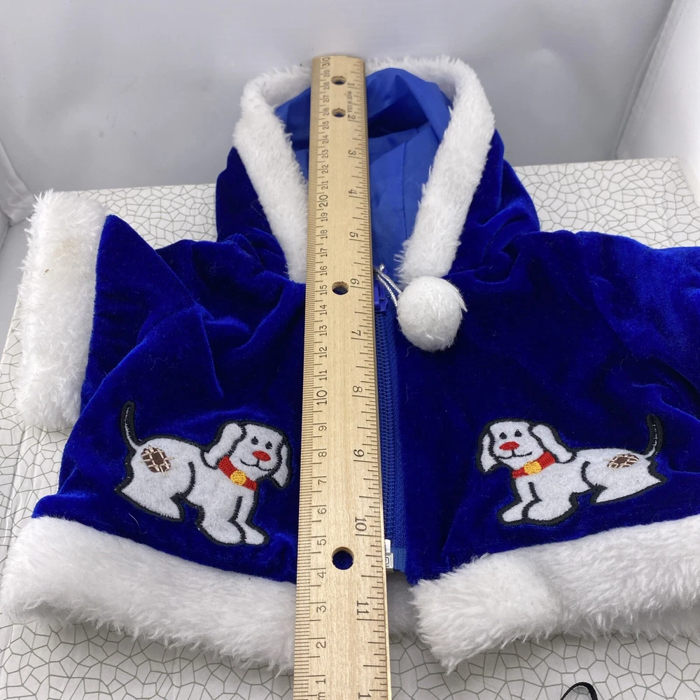 Cute little Santa costume for your sweet little doggie. Blue furry costume with white fur trim and embroidered dogs on the jacket. Measurements through the photos. No rips, tears or stains.