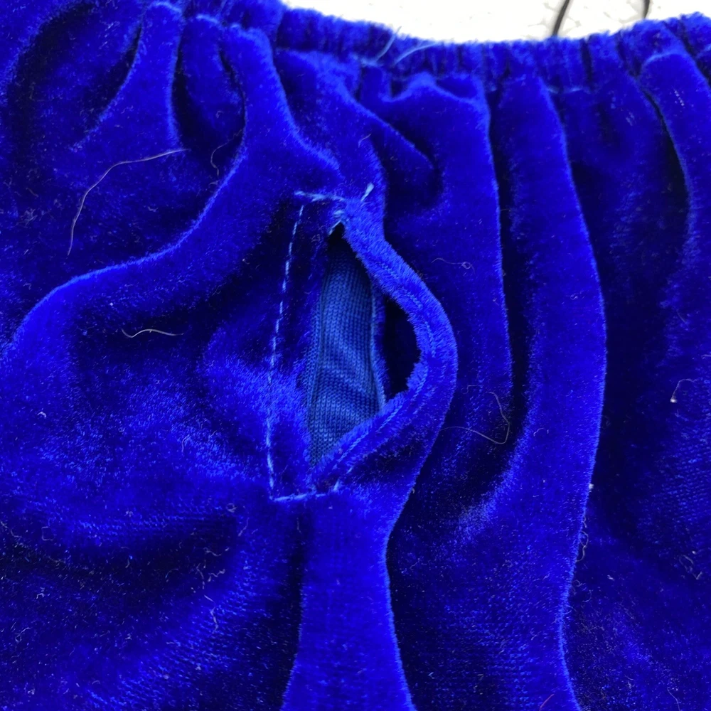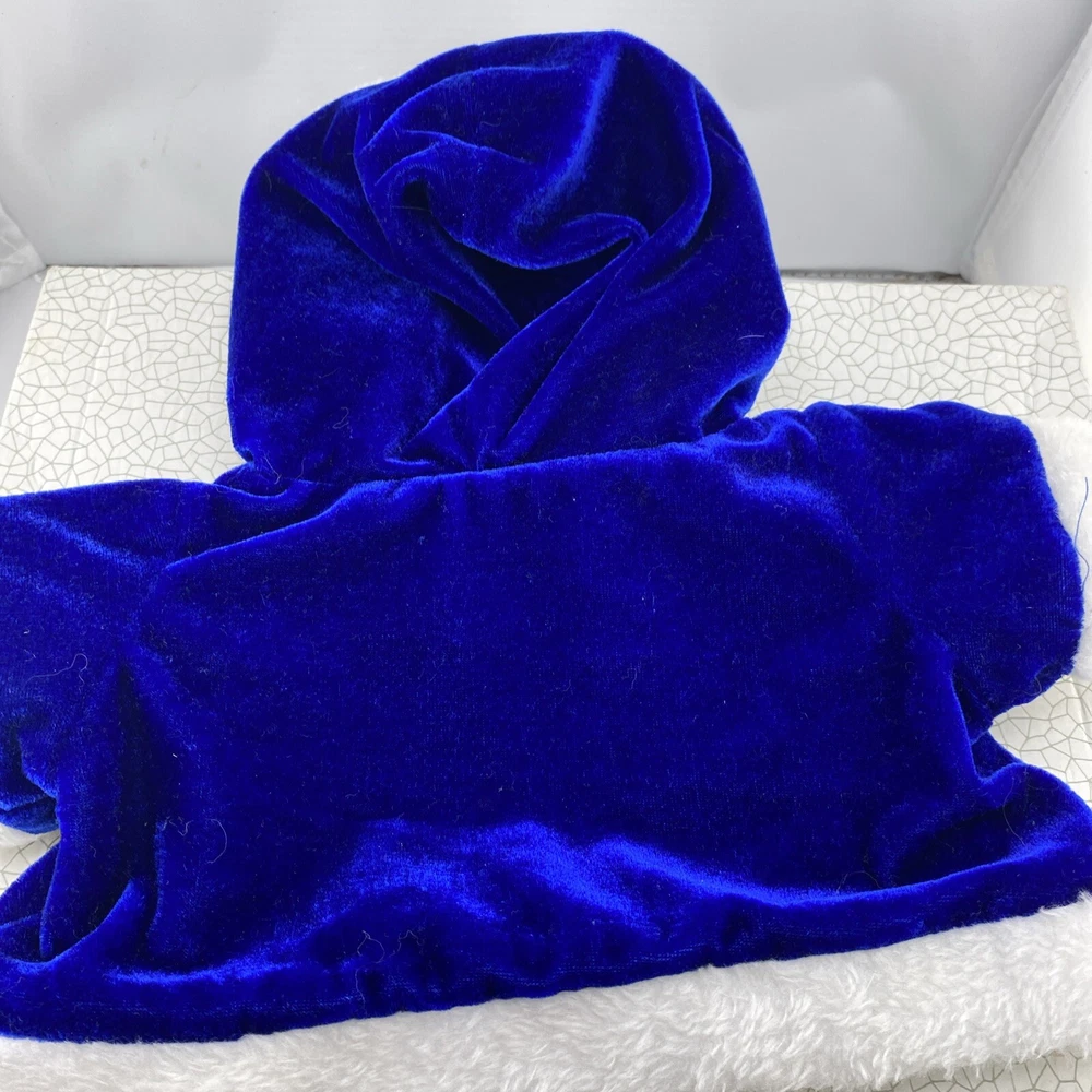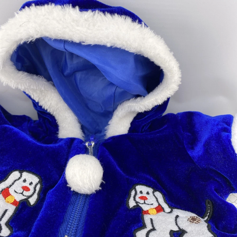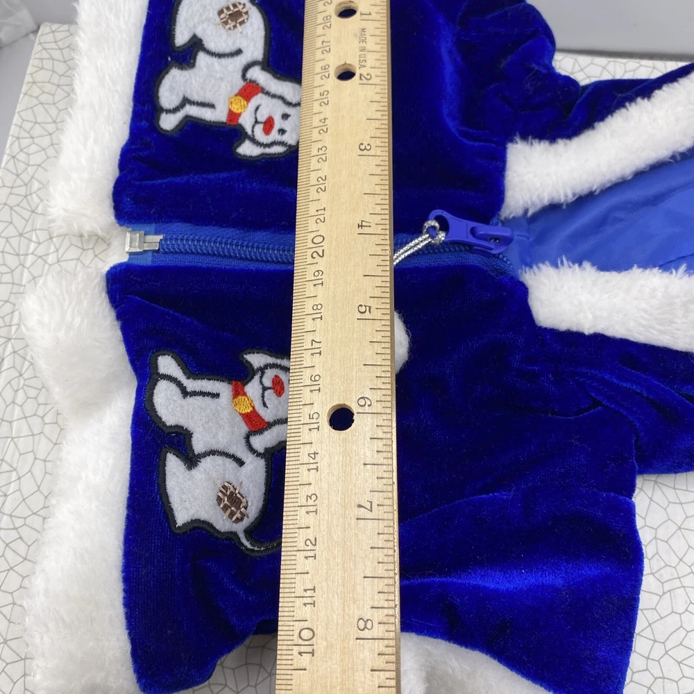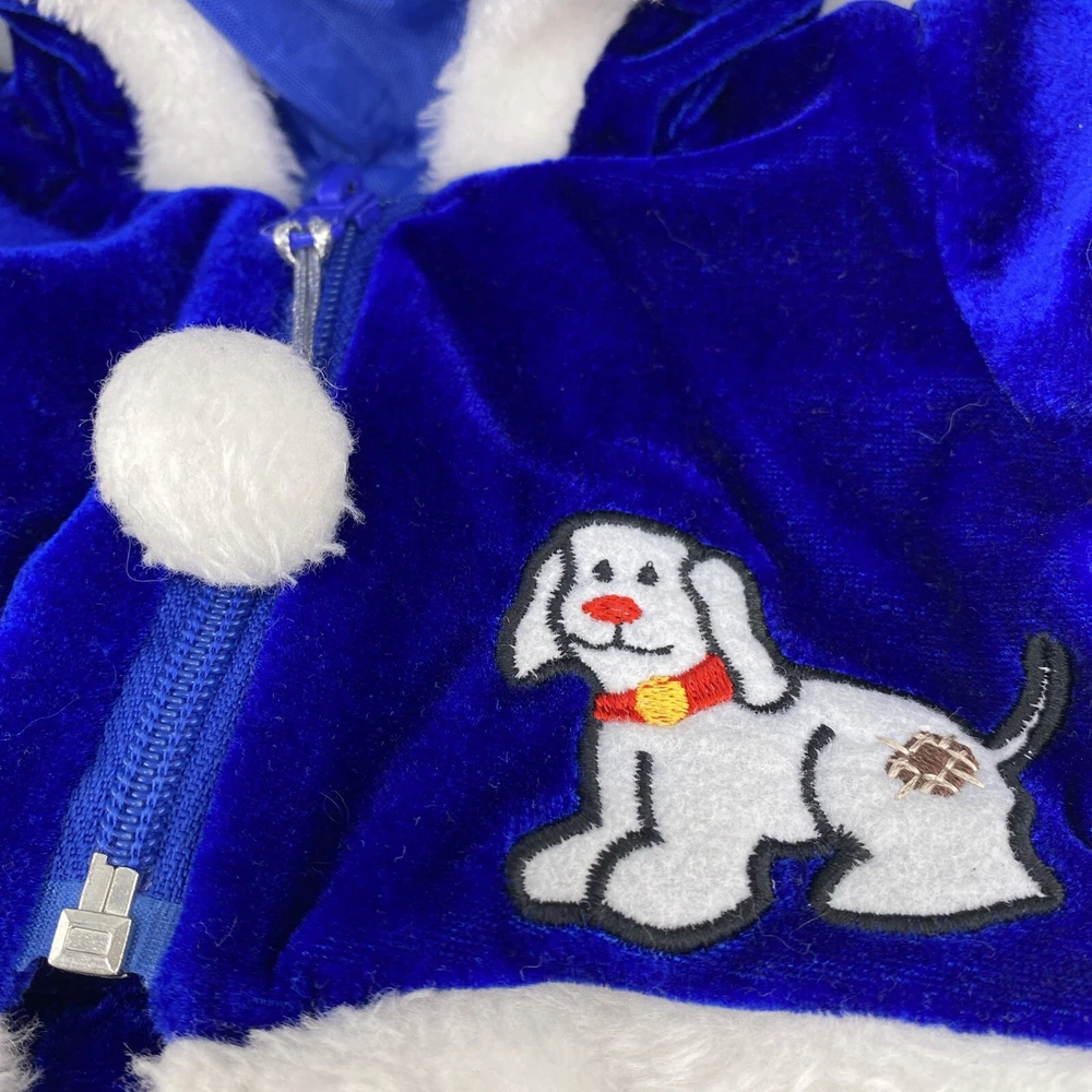 Cute little Santa costume for your sweet little doggie. Blue furry costume with white fur trim and embroidered dogs on the jacket. Measurements through the photos. No rips, tears or stains.