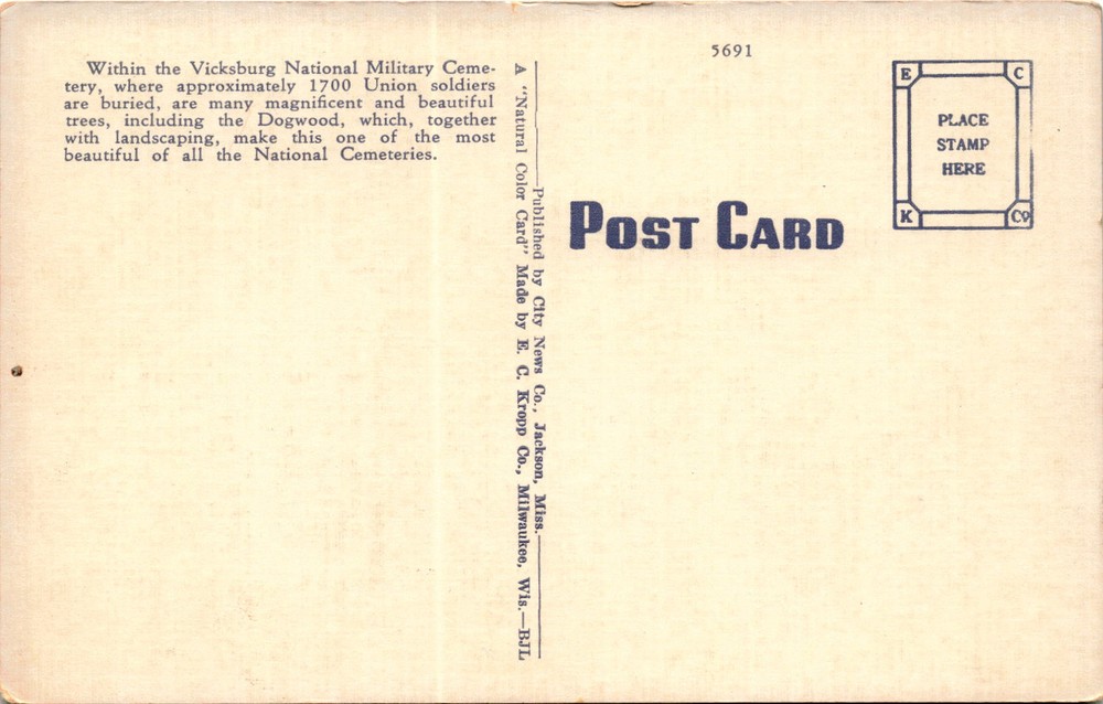 MAKE AN OFFER. THE MORE YOU BUY THE BETTER DEAL I WILL ACCEPT The postcard features a Dogwood tree in bloom at the National Military Cemetery in Vicksburg, Mississippi. This cemetery is the final resting place for around 1700 Union soldiers. The cemetery is known for its stunning landscaping and beautiful trees, with the Dogwood being a standout feature.