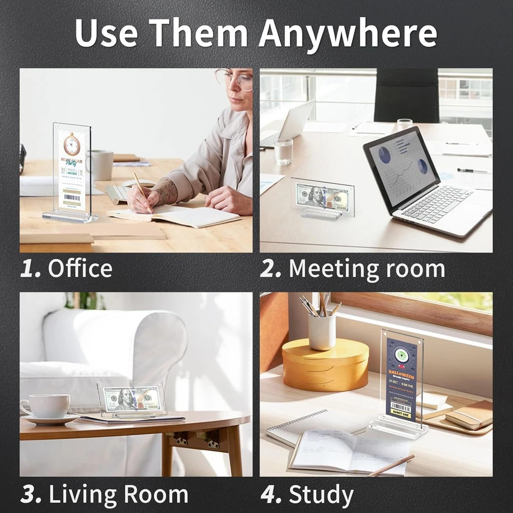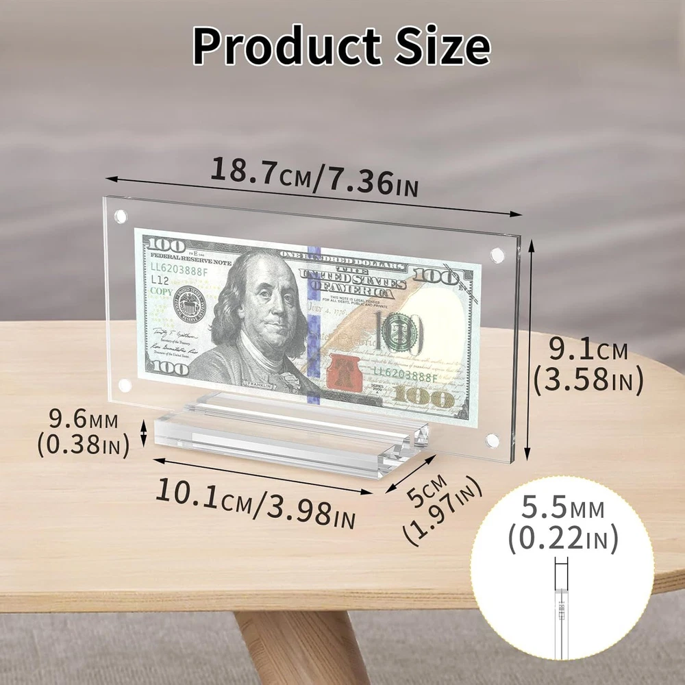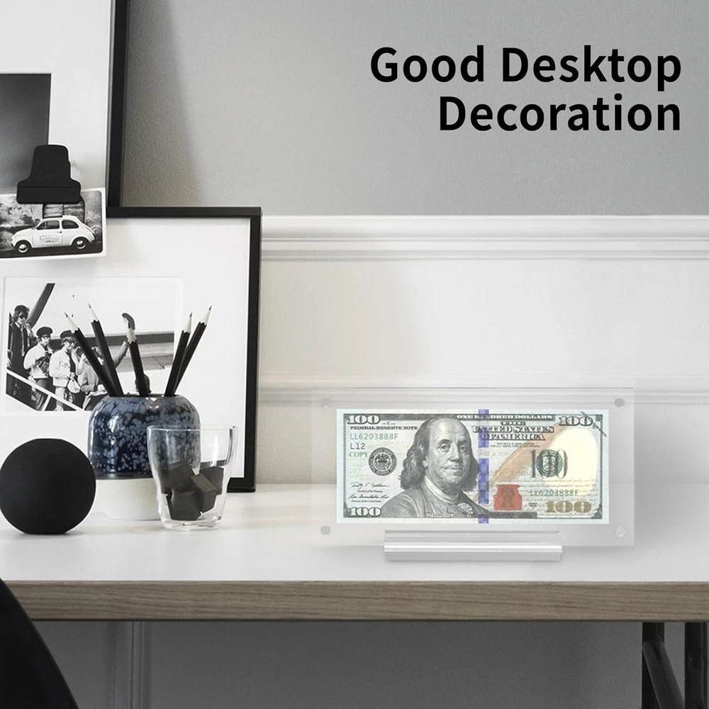 Clear dollar bill frame with base supports, designed for displaying photos, paper curre ncy, pictures, stamps, paintings, or other paper items and arts. Also suitable for real estate licenses and bank checks. This money frame enhances the visibility of your bills and is intended for tabletop or desktop display only. We have created vertical and slanted card slots for the display's base, providing you with additional angles to display your certificates, commemorative coins, and other items. Whether placed in a room or office corner, it will exude an exquisite and tasteful appearance. Our acrylic money holders have a practical magnetic design, making installation effortless and tool-free. Just align the panels and let the magnets handle the rest, saving you time and effort during assembly. This acrylic paper money display case features a double sided transparent window design, allowing for clear visibility from both sides. The case has smooth edges, excellent transparency, and clarity. It is ideal for storing banknotes, commemorative coins, and other items, while also providing an elegant and classic feel.