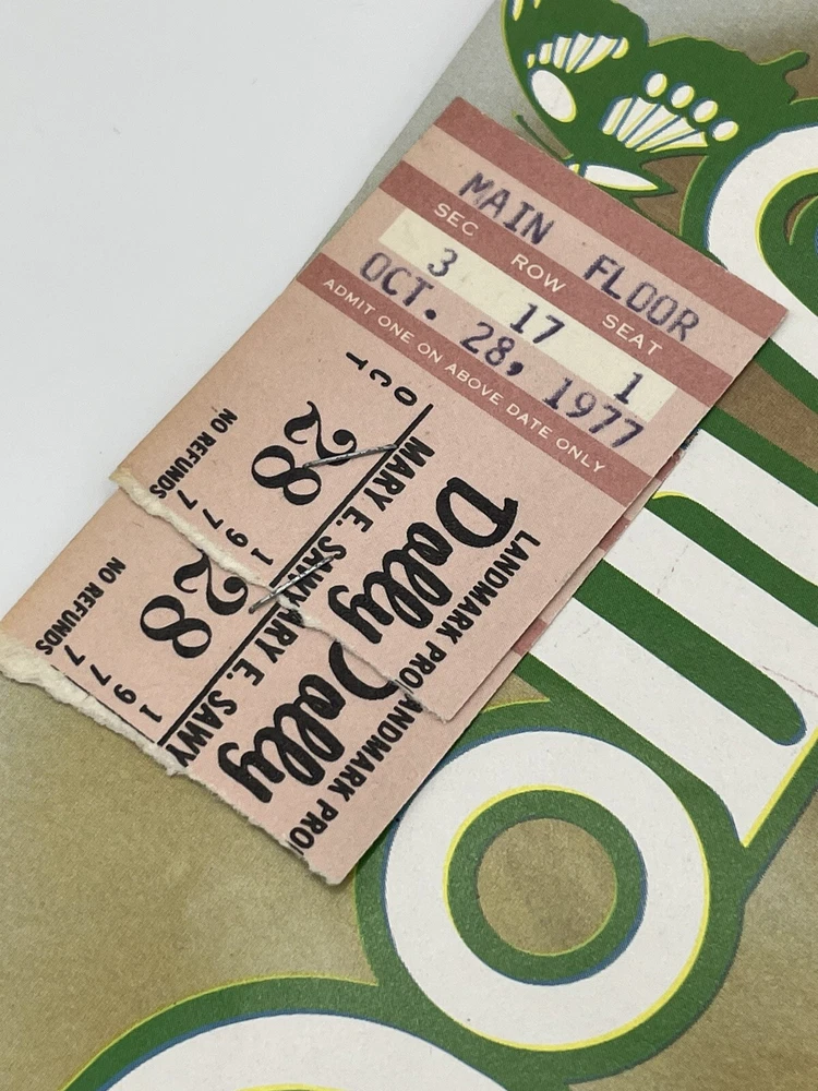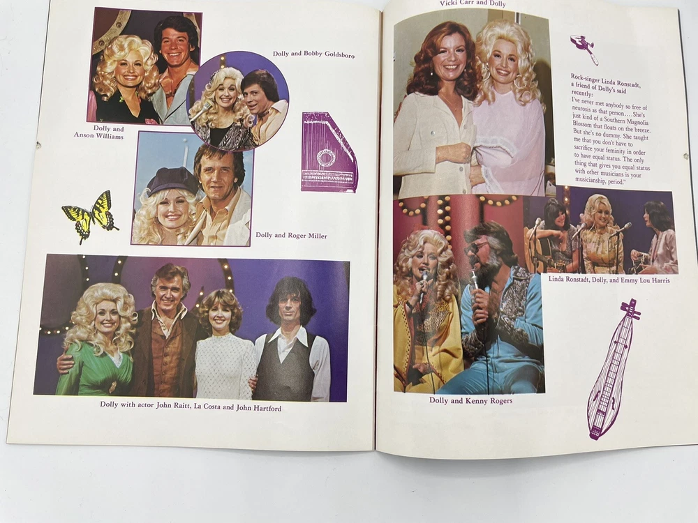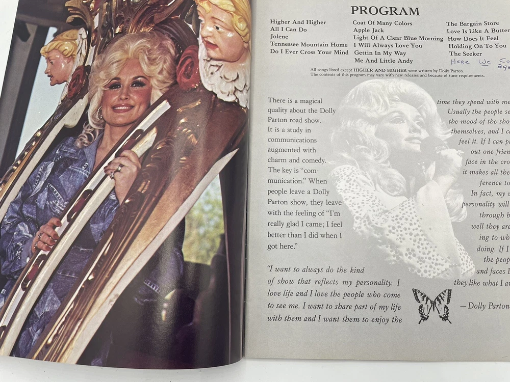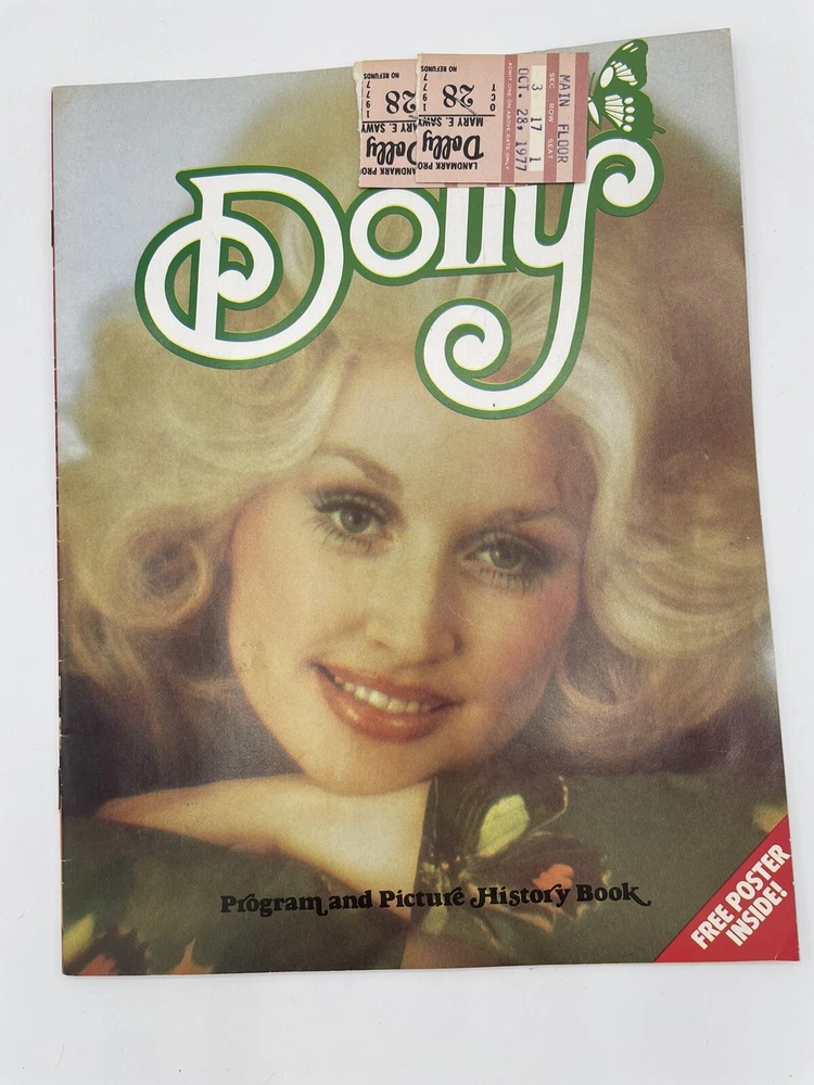 This very clean, like new piece of Dolly memorabilia from her tour in 1977 is a wonderful snapshot of the legendary performer from that time. Two ticket stubs are stapled to the front of the program which took place October 28, 1977 in La Crosse, WI at the Mary E. Sawyer Auditorium (1954-1988). No wrinkles, creases, or stains. There is a centerfold poster inside and more fun photographs throughout. 8” x 11”.