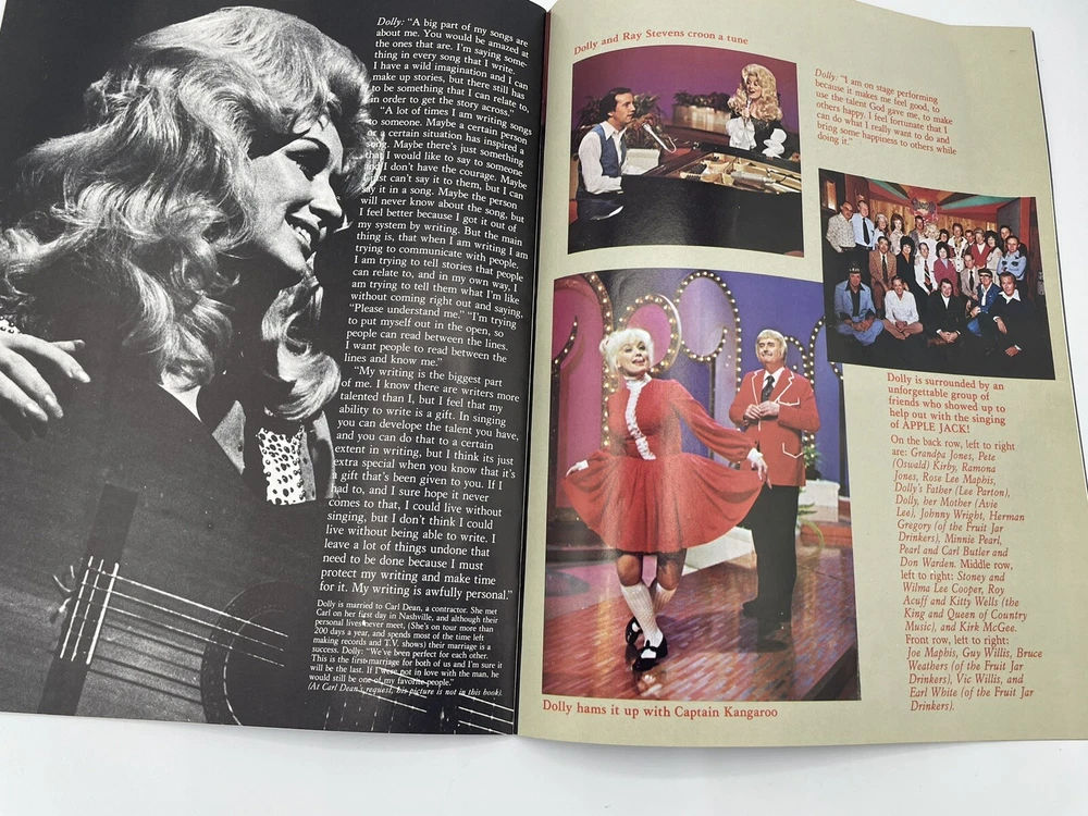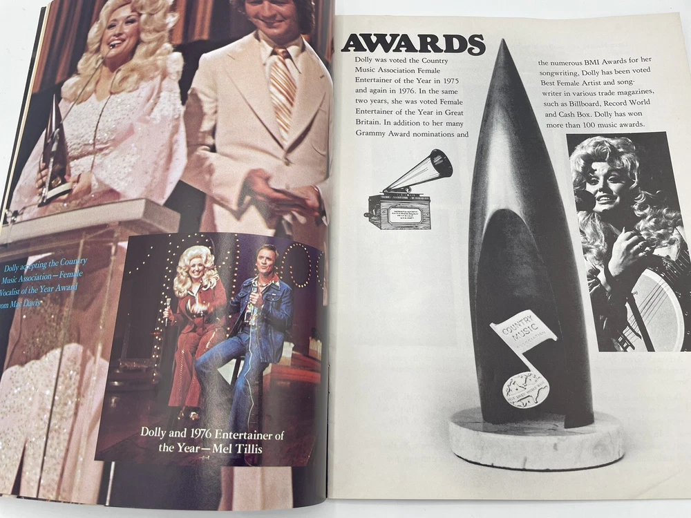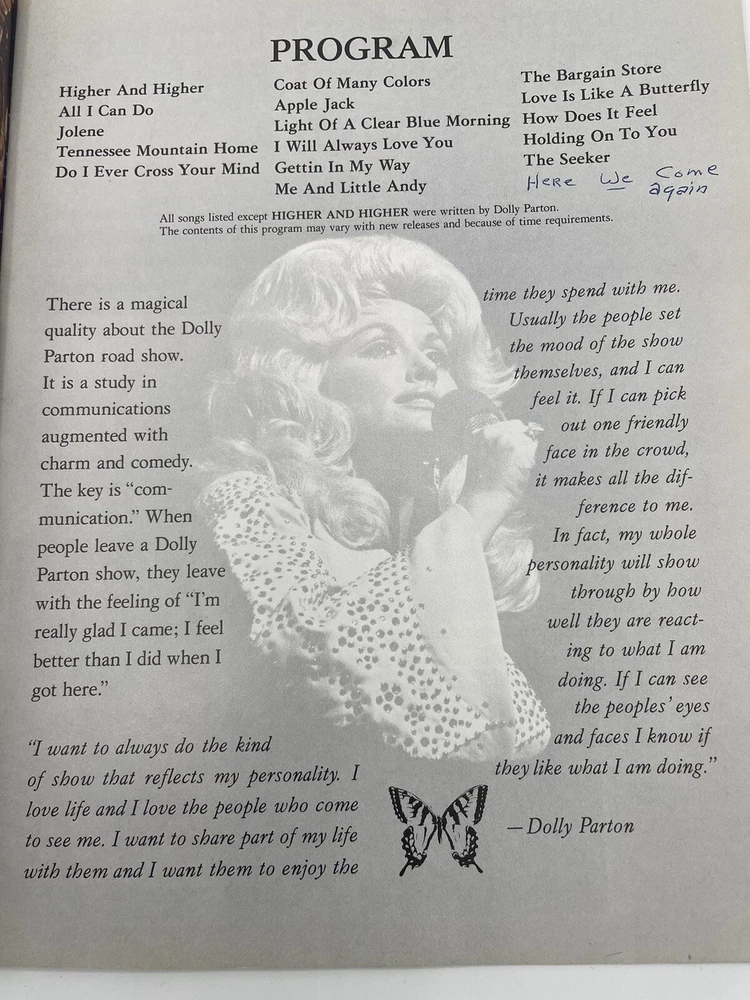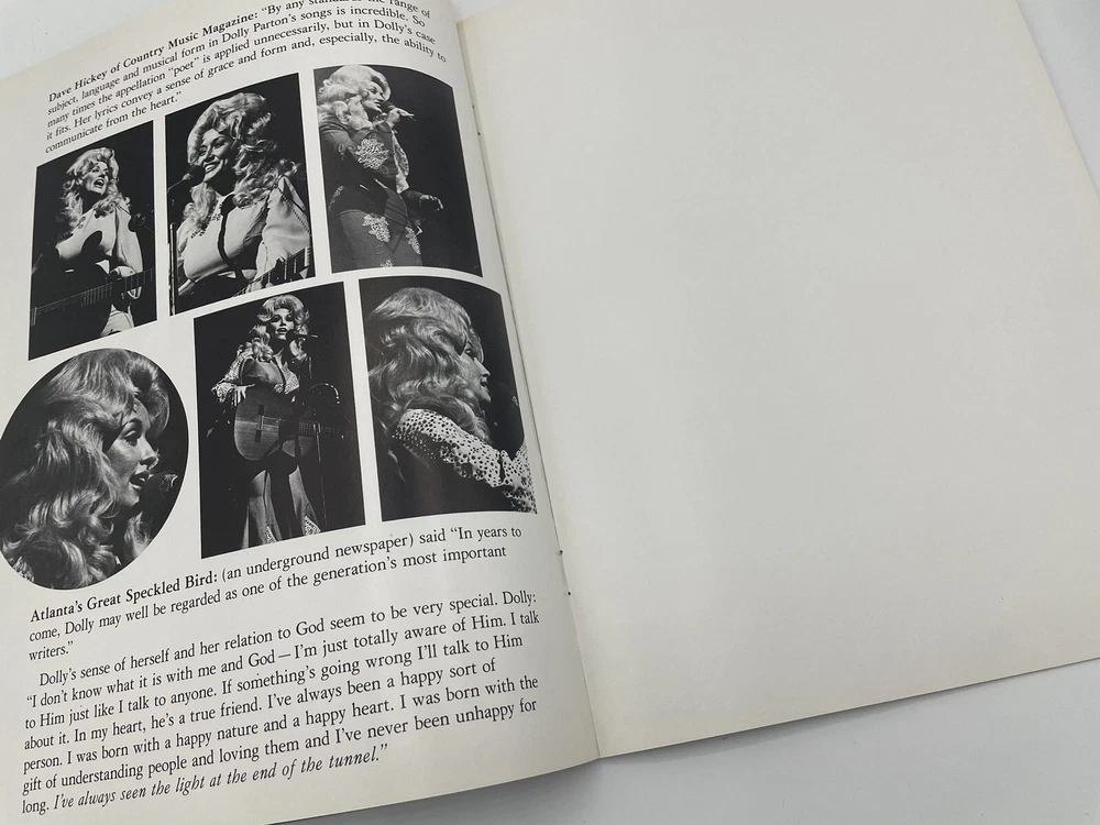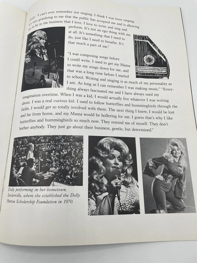 This very clean, like new piece of Dolly memorabilia from her tour in 1977 is a wonderful snapshot of the legendary performer from that time. Two ticket stubs are stapled to the front of the program which took place October 28, 1977 in La Crosse, WI at the Mary E. Sawyer Auditorium (1954-1988). No wrinkles, creases, or stains. There is a centerfold poster inside and more fun photographs throughout. 8” x 11”.