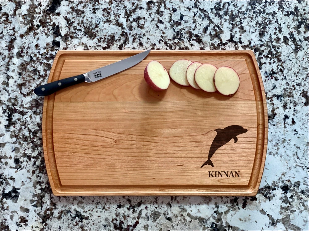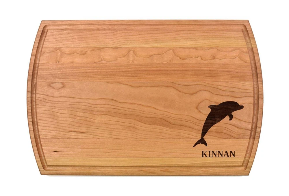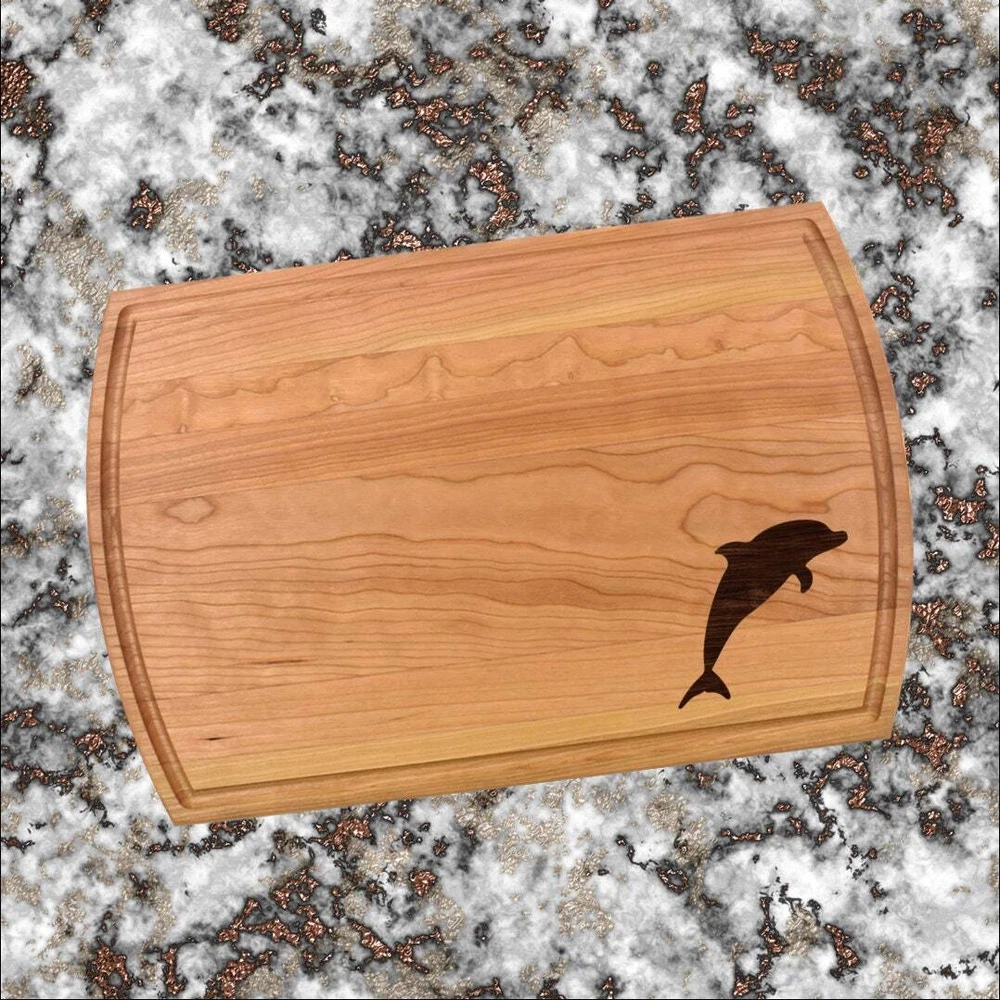 Design: Personalized Dolphin Cutting Board or Charcuterie Serving Tray All items ship via USPS - please make sure your address is correct :-) Whether used as a charcuterie serving tray for snacks or cutting board, our bamboo, walnut and cherry custom boards are the perfect addition for the home and make the perfect gift for your loved one celebrating a birthday, anniversary, new home, wedding, etc! *** FEATURES *** • SIZES: We have multiple styles and sizes available. To see our current sizes available, click the drop-down menu. The photo slide contains a photo showing each side by side. Please note, the board with the juice groove only has the groove on the front side of the board. • THICKNESS: Bamboo Boards - Approximately 1/2" Thick; Walnut & Cherry Boards - Approximately 3/4” Thick • UNIQUE: Every board is unique with the grain and coloring varying throughout - no board is the same! • CARE INSTRUCTIONS: Hand wash only with warm water. Do not soak. Please apply mineral oil throughout the board’s life. • PERSONALIZATION/CUSTIMIZATION: Do you want the text placed differently on the board? Please don’t hesitate to contact us. All personalization notes can be entered in the personalization box when checking out. • SHIPPING: All cutting boards ship within 2 to 5 business days. • WHOLESALE ORDERS: Please don’t hesitate to contact us for information about wholesale orders. Processing times for larger orders may change. • NOTE: Colors can vary a bit on different monitors and screens. Any props included in photos are not included. Please be sure to double-check your address to make sure it is accurate for USPS delivery. If a package is returned to us due to an invalid address, the buyer is responsible for all additional shipping charges. We appreciate you supporting small business – best wishes! For items ordered with simple edits, we do not send proofs since the layout doesn't change from the example(s). However, in the event there are requests that change the layout from the example(s), we do send proofs for approval before making the product. If you'd like a proof before we make the product, please note so in the personalization box.