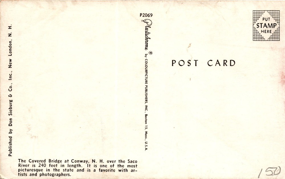 MAKE AN OFFER. THE MORE YOU BUY THE BETTER DEAL I WILL ACCEPT The postcard features a Plastichrome image of the Covered Bridge at Conway, New Hampshire, which spans the Saco River and is 240 feet long. This historic bridge is known for its picturesque setting and is a popular subject for artists and photographers.