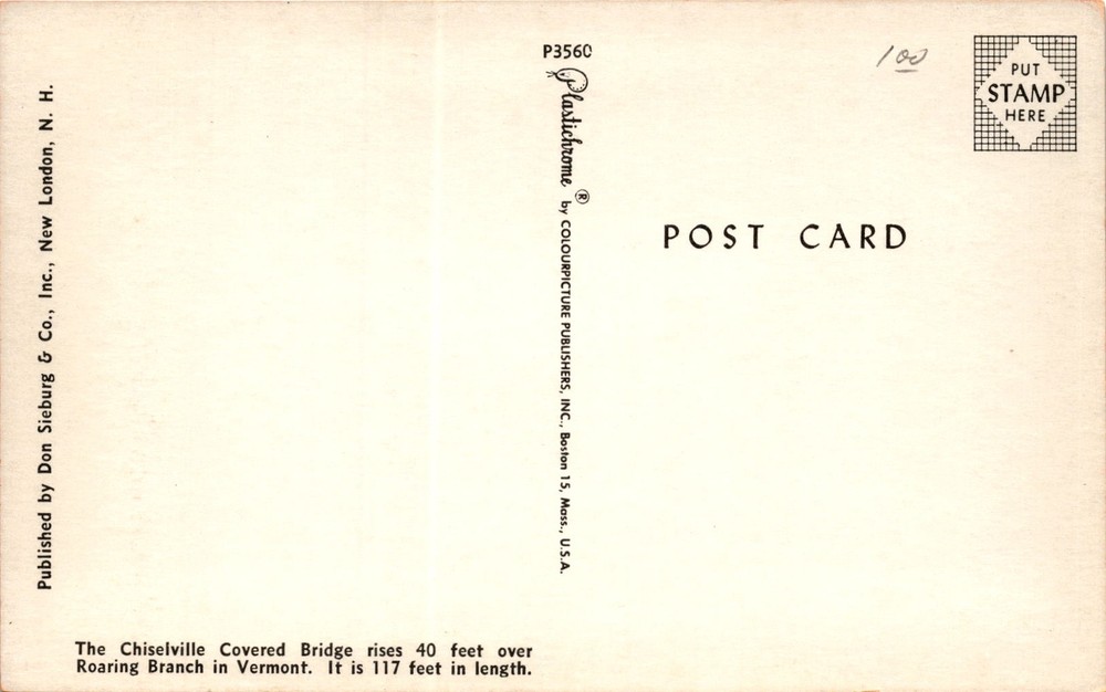 MAKE AN OFFER. THE MORE YOU BUY THE BETTER DEAL I WILL ACCEPT The postcard features the Chiselville Covered Bridge, located in Vermont, which spans over Roaring Branch. The bridge rises 40 feet and is 117 feet in length. The postcard was published by Don Sieburg & Co., Inc. in New London, N.H.