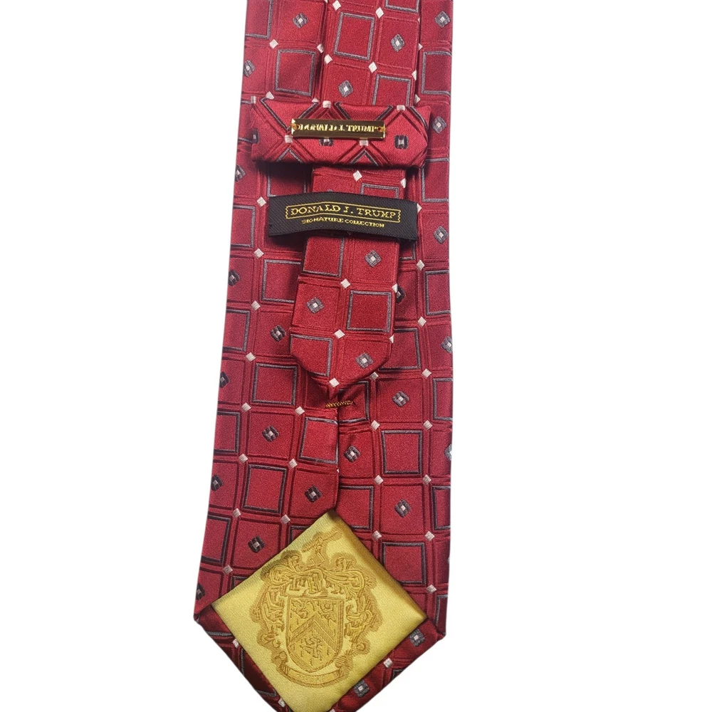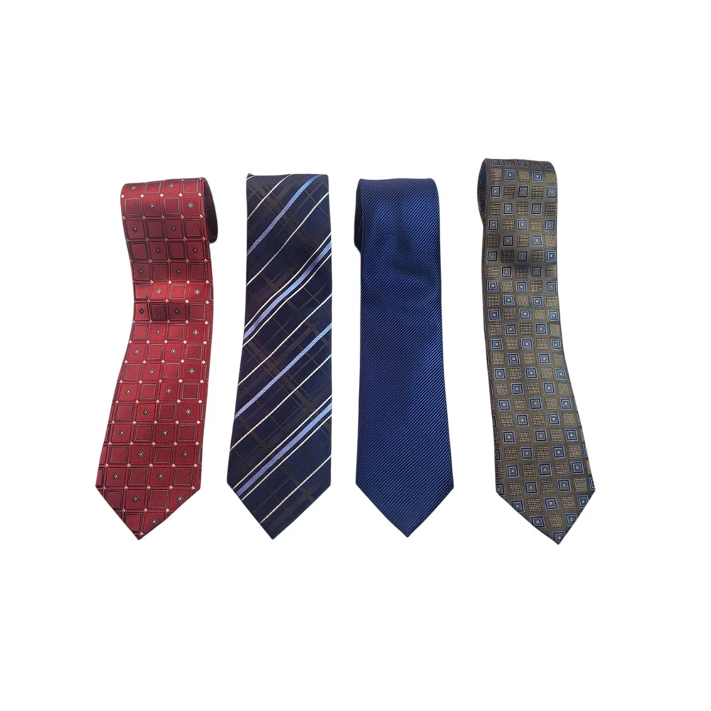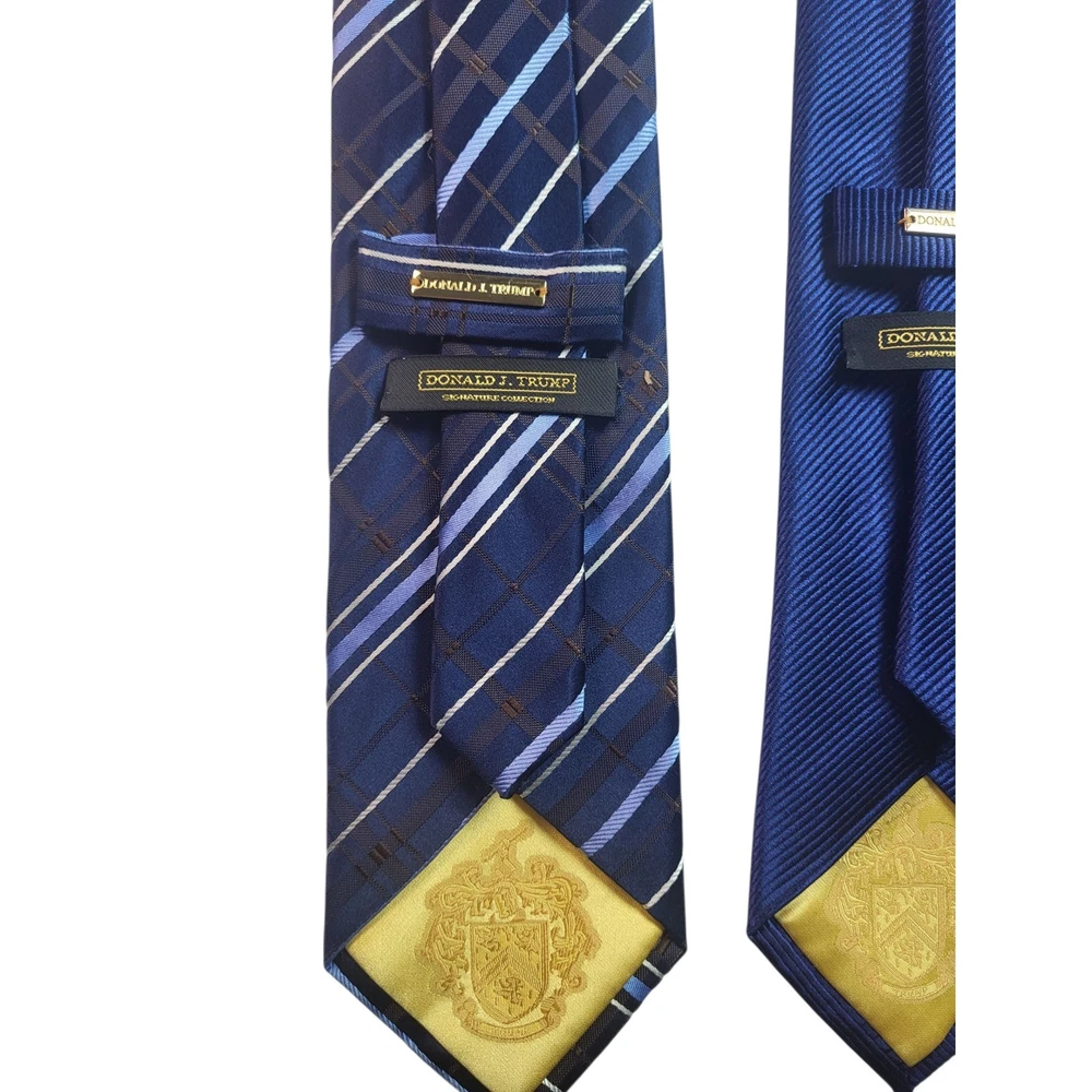 Elevate your professional wardrobe with this distinguished collection of Donald J. Trump neckties. Each tie exudes sophistication and confidence, making a statement in any setting. The set includes four unique designs: a classic red geometric pattern, a navy blue striped design, a solid navy blue tie, and a gray geometric pattern. These ties are perfect for adding a touch of elegance to your business attire or for making a lasting impression at formal events. Imagine yourself commanding attention in the boardroom or exuding charm at a wedding reception with these refined accessories. Color: Blue Department: Men Type: Tie Material: Silk, 100% Silk Style: Designer Pattern: Striped Character: Career, Business, Sophisticated, Elegant, Classic Accents: Logo, Geometric, Striped Fabric Type: Silk Blend Keywords: Donald J. Trump, necktie, tie, silk tie, mens tie, dress tie, business tie, career tie, formal tie, geometric, striped, navy blue, red, gray, lot of ties