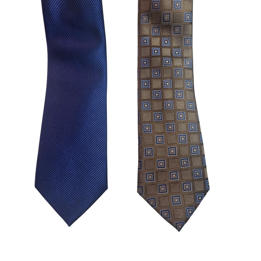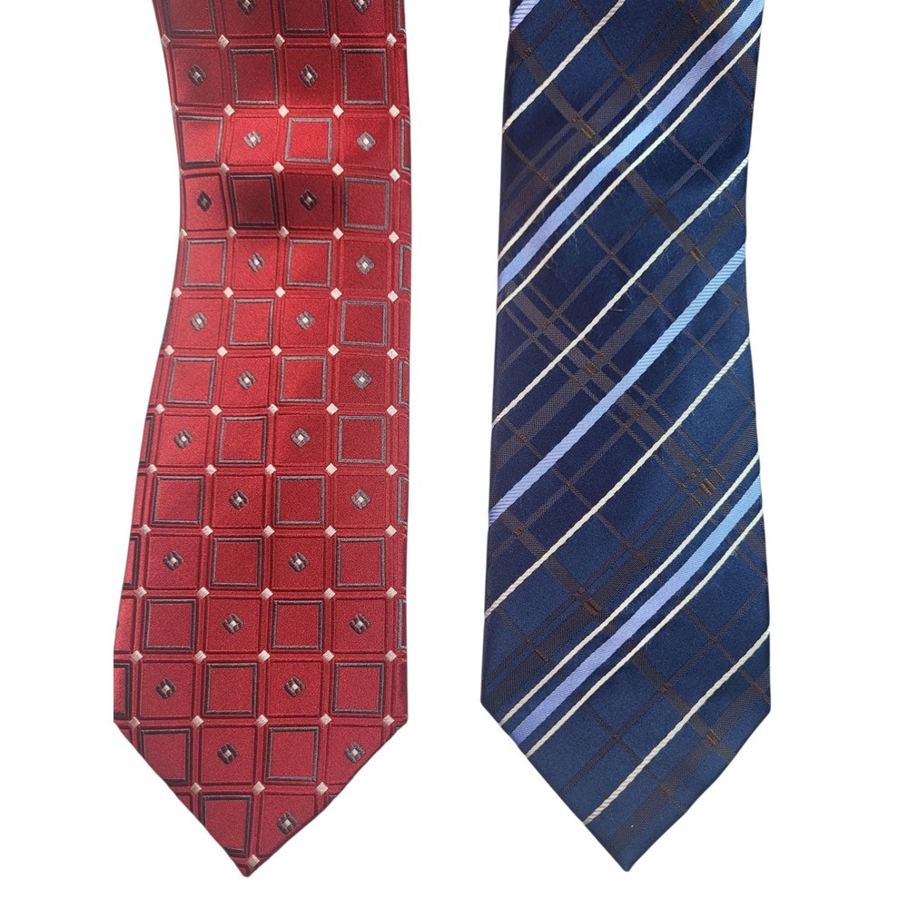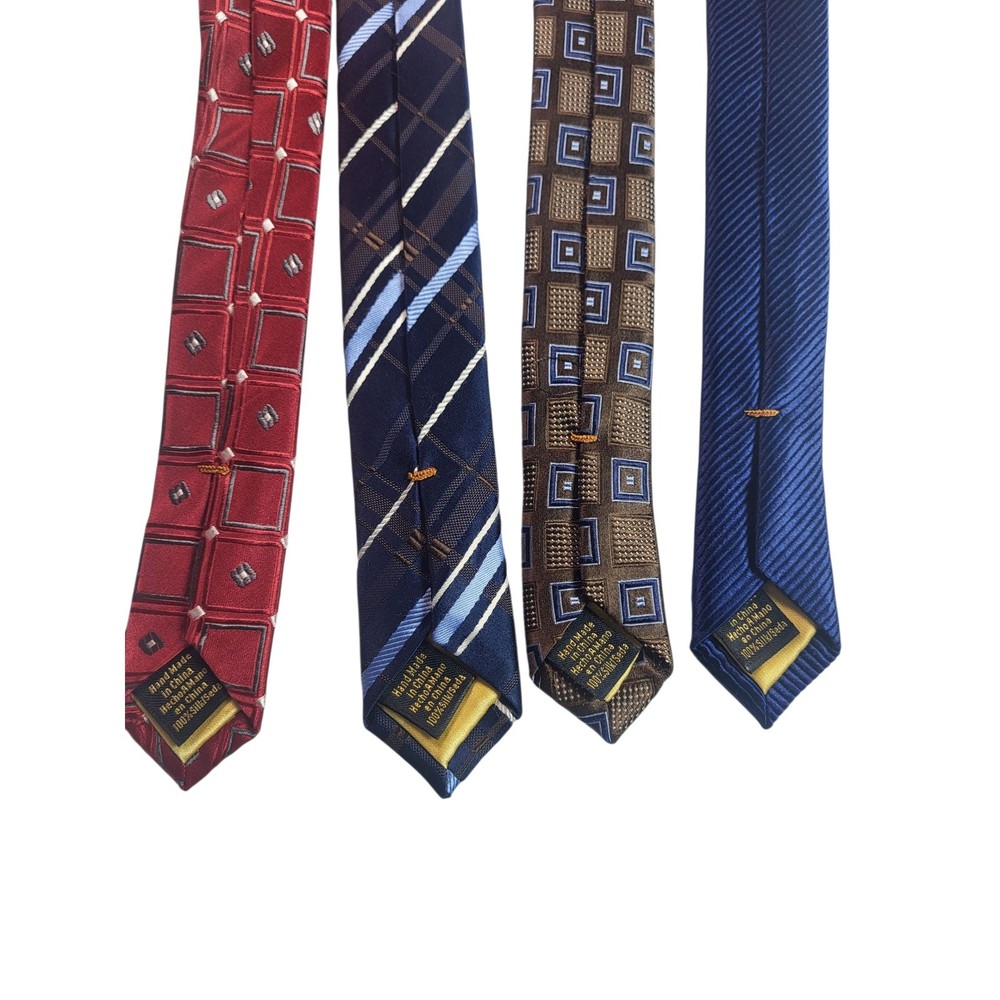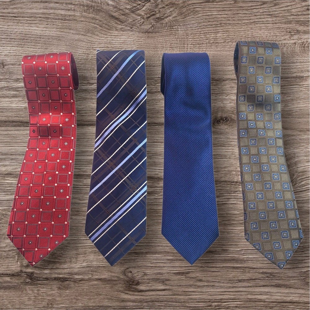 Elevate your professional wardrobe with this distinguished collection of Donald J. Trump neckties. Each tie exudes sophistication and confidence, making a statement in any setting. The set includes four unique designs: a classic red geometric pattern, a navy blue striped design, a solid navy blue tie, and a gray geometric pattern. These ties are perfect for adding a touch of elegance to your business attire or for making a lasting impression at formal events. Imagine yourself commanding attention in the boardroom or exuding charm at a wedding reception with these refined accessories. Color: Blue Department: Men Type: Tie Material: Silk, 100% Silk Style: Designer Pattern: Striped Character: Career, Business, Sophisticated, Elegant, Classic Accents: Logo, Geometric, Striped Fabric Type: Silk Blend Keywords: Donald J. Trump, necktie, tie, silk tie, mens tie, dress tie, business tie, career tie, formal tie, geometric, striped, navy blue, red, gray, lot of ties