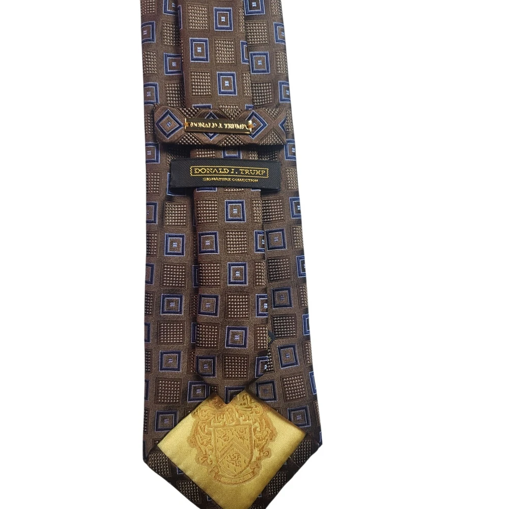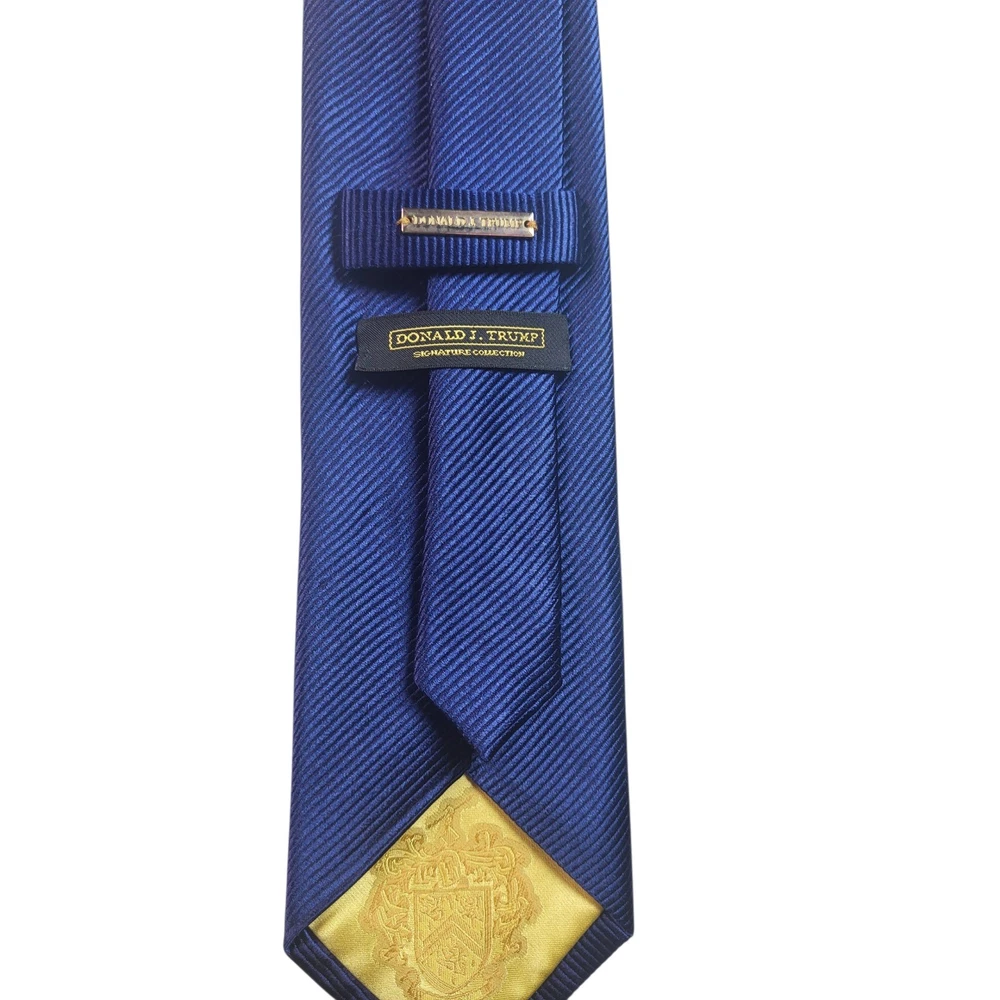 Fabric Type: Silk Blend Style: Designer Character: Career, Business, Sophisticated, Elegant, Classic Accents: Logo, Geometric, Striped Material: Silk, 100% Silk Size: One Size Pattern: Striped Department: Men Color: Blue Type: Tie Brand: Donald J. Trump