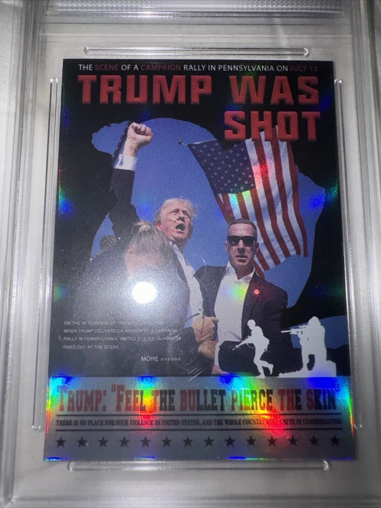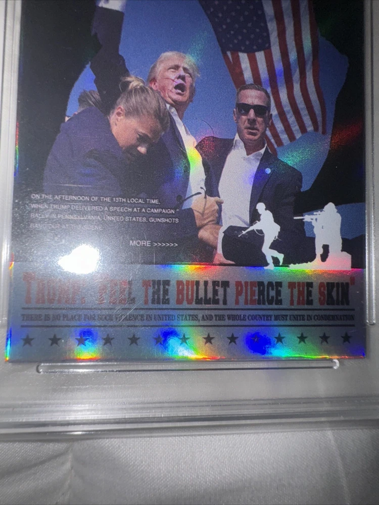 This Donald Trump 2024 Assassination Attempt Trading Card is a must-have for any collector. Graded GEM-MINT 10, this original card stock is of the highest quality and features the iconic former president in a thrilling action-packed design. With a card thickness of 35 Pt., this non-sport trading card is perfect for fans of superhero, action, adventure, crime, war, comedy, mystery, political, history, and military genres. The card is in standard size and is suitable for ages 8 and up. It is an original licensed reprint and was manufactured in the United States. The card features the assassination attempt on Donald Trump and is a perfect addition to any collection.