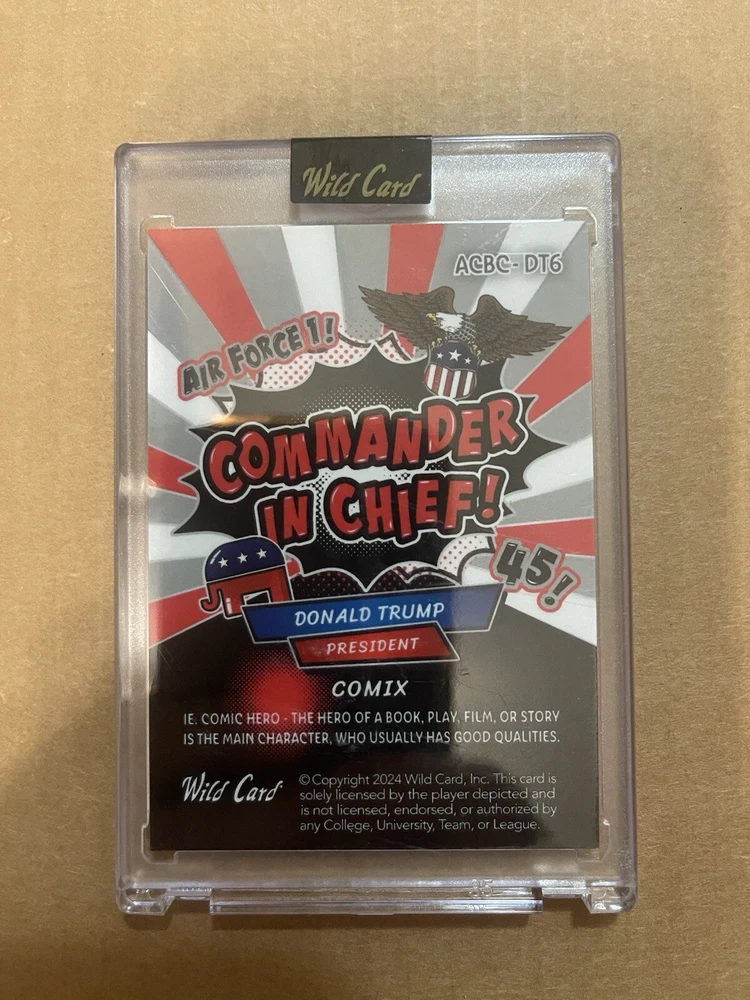 Franchise: US Presidents Type: Non-Sport Trading Card Graded: No Featured Person/Artist: Donald Trump Character: Donald Trump Autographed: No Features: Serial Numbered, Short Print Year Manufactured: 2024 Manufacturer: Wild Card Set: Election Parallel/Variety: Commander In Chief