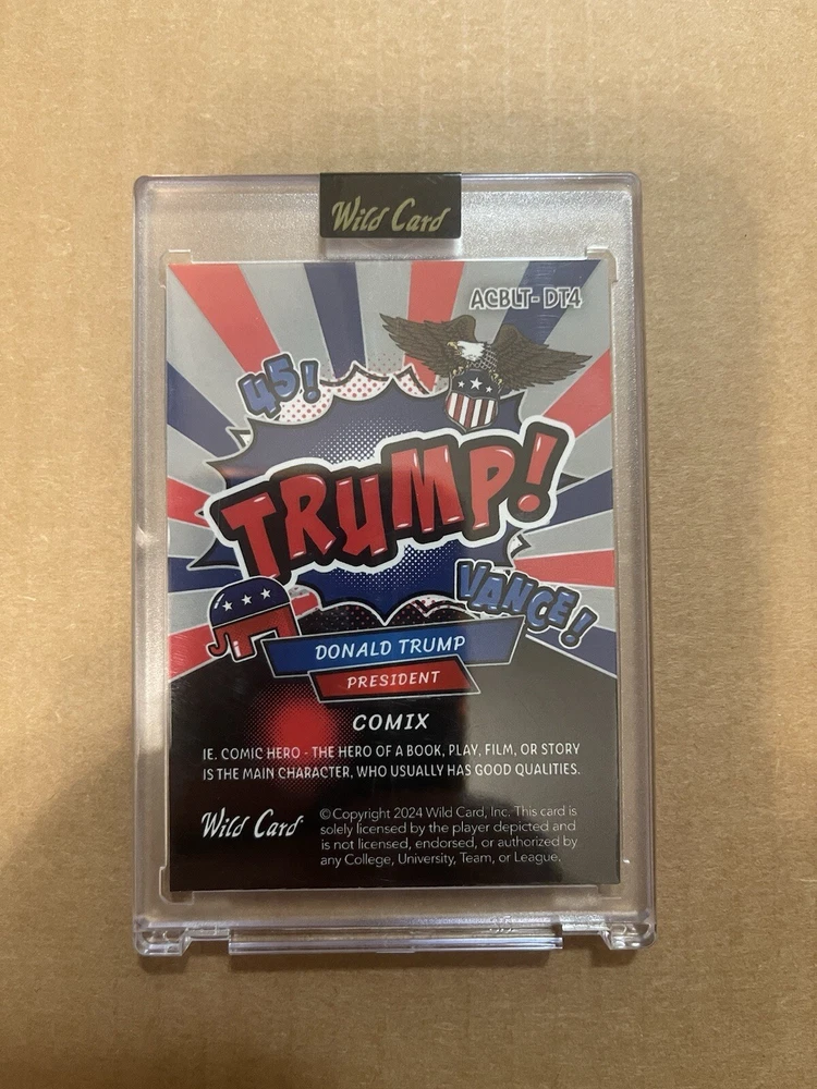 Type: Non-Sport Trading Card Features: Serial Numbered, Short Print Parallel/Variety: Commander In Chief Set: Election Graded: No Featured Person/Artist: Donald Trump Year Manufactured: 2024 Manufacturer: Wild Card Franchise: US Presidents Character: Donald Trump Autographed: No
