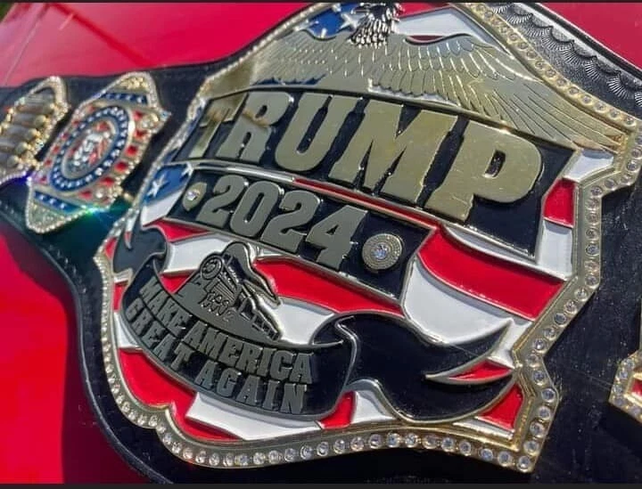 Donald Trump USA Presidential Election 2024 Championship Belt Features: 1. Brass metal plates 2. Real cowhide floppy leather strape in black colour 3. Gold plating 4. Golden tip on the end 5. Plates thickness 2mm Show your support for Donald Trump in the 2024 Presidential Election with this stylish Championship Belt. The belt is perfect for wrestling fans and collectors alike, and features the iconic "Make America Great Again" slogan. The belt is made in Pakistan and is 52 inches in size, with a sleek black color that will complement any outfit. This belt is a must-have for any fan of Donald Trump or wrestling, and is perfect for wearing to rallies or displaying in your collection. Don't miss out on the chance to own this unique and stylish belt that will showcase your support for one of the most iconic figures in American history.