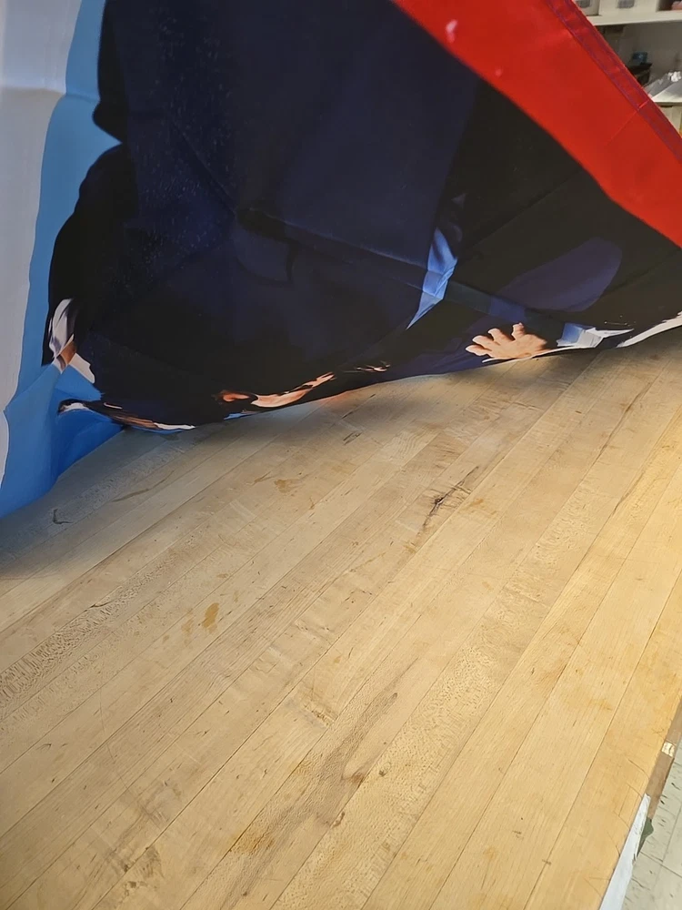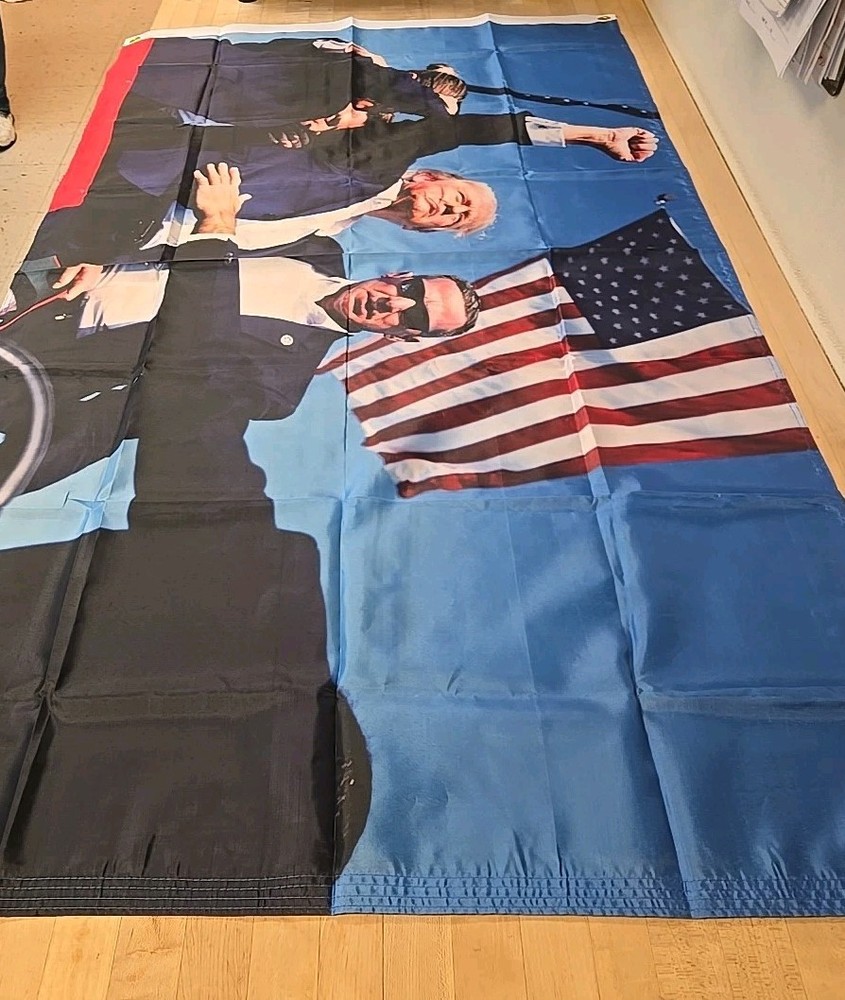 The product is a 3ft × 5ft American USA patriot hero flag featuring the likeness of Donold Trump. The flag is double-sided and has a patriotic theme, perfect for any occasion. Made in the United States, the multicolor flag showcases the day that President Trump was almost assassinated by being shot in the ear and afterwards standing strong by showing a fist to the crowd. The picture of President Trump on that day represents honor & American pride and values. The bag has been open but the flag has never been used.
