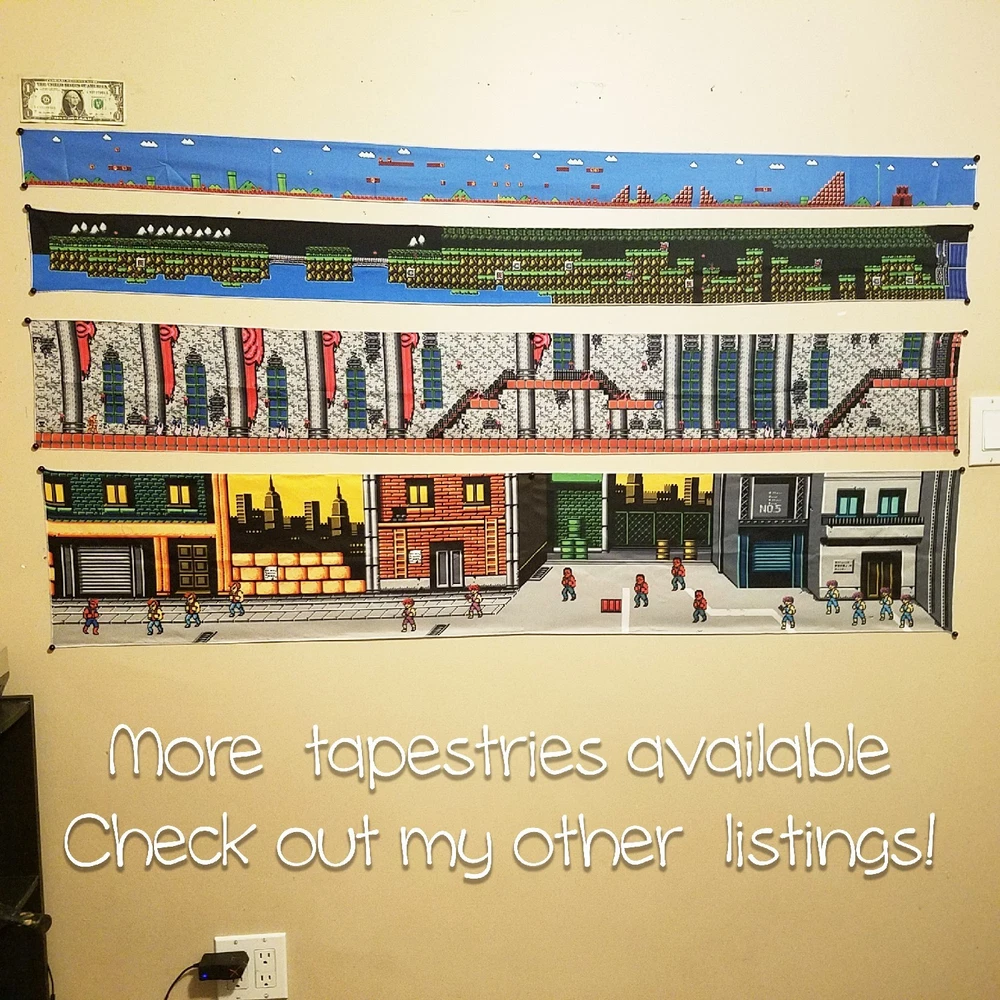 Stage 1 of Double Dragon for the Nintendo. Billy at the beginning of the stage and all the thugs and thugettes waiting for him π Pow! π₯ Tapestry measures approximately 60x12 inches. Printed with vibrant ink on quality medium-weight 100% polyester tapestry, easily hung to your wall with a few thumbtacks. Each tapestry is new and comes folded in a cellophane sleeve. Check out my other listings to see more custom video game banners and neat game room merch. Combined shipping available. πππ