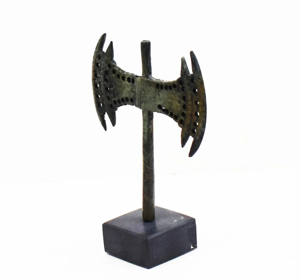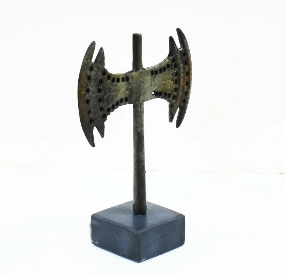 MINOAN PERIOD SMALL BRONZE LABRYS The labrys symbol was often found during the Bronze Age archaeological recovery at the Palace of Knossos on Crete. Of all the Minoan religious symbols the labrys was the holiest. It is known to have a strong religious significance, for specific use by Minoan priestesses as a ceremonial item, perhaps during the sacrifice of animals such as bulls. From around 2700 to 1450 BC, the Minoan civilization flourished as a seafaring and mercantile culture. The Minoan civilization developed and reached its Reyday on the Island of Crete. The center of this civilization was the palace of Knossos, which is one of the most important archaeological discoveries of the Greek history. All our bronze items, are cast in Greece, using the traditional 'lost wax' method. As nothing is mass-produced, there will inevitably be slight variations in patination and colouring. Each piece is, therefore, unique.(25-653-A) Details: Condition: New, Handmade in Greece Material: Pure Bronze Height: 13 cm(5.1 inches) Width : 9 cm(3.5 inches) Weight : 200 g