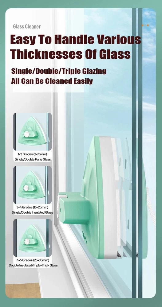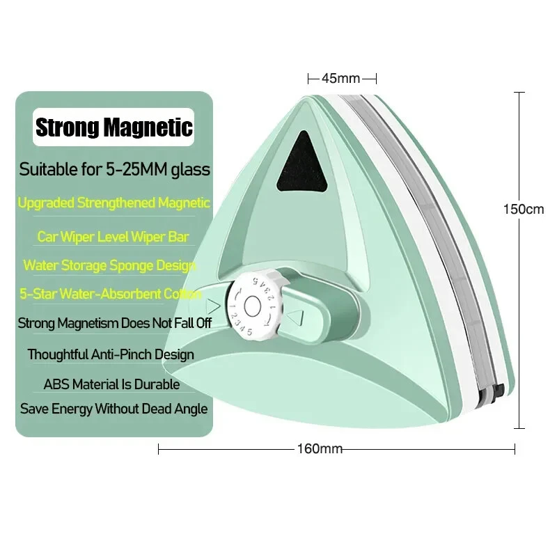 • Double-sided design for efficient cleaning : The double-sided design of this magnetic window cleaner ensures that you can clean your windows from both sides at once, saving time and effort. • Adjustable magnet for hard-to-reach areas : The adjustable magnet on this window cleaner allows you to easily clean those hard-to-reach areas that are difficult to access with traditional cleaning tools. • Magnetic glass cleaning wiper : This magnetic glass cleaning wiper is perfect for cleaning windows, doors, and other glass surfaces without leaving any streaks or smudges. • High-rise double glazing cleaning tool : With its high-rise design, this double glazing cleaning tool can easily reach tall windows and other hard-to-reach areas, making it a must-have for anyone who owns tall buildings or homes. Features: 1. Adjustable Magnetic Glider: With 5-files adjustable magnetic glider, this window cleaner ensures easy and safe cleaning without the need for a ladder or additional tools. 2. Efficient Cleaning: The double-sided window cleaner is designed to provide efficient cleaning for high-rise double glazed windows with a thickness of 0.2"-1.18". 3. Durable and Long-Lasting: Made of high-quality materials, this glass wiper is durable and long-lasting, ensuring that you get the best value for your money. 4. Time-Saving: The double-sided design of this window cleaner allows you to clean both sides of the window at the same time, saving you time and effort. 5. Easy to Use: The cleaning brush tool is easy to use and can be operated by anyone, making it a perfect addition to your cleaning supplies. Specification: Type: Double Faced Cleaner Color: Green Material: ABS Plastic Type of Magnet: Strong Neodymium Magnet Glass Thickness: Suitable for 5-25mm, Suitable for 5-30mm (option) Suitable: Hollow Glass, Glass Partition, Bathroom Glass Package Include: 1* Magnetic Window Cleaner Noted: 1. Do not use the product on cracked glass.Eliminate the solid material like cementbefore use. 2. Please check the safety thread is grip tighton the product before put it on the wrist. 3. While use eliminate impurity adsorbed atthe surface of the cleaner, or it scratchglass 4. Spray water on glass surface before start.it is easy help for cleaning It has strong magnet, improper use causedanger read the manual first. For it contains magnet, stay away fromwalch, televsion and so on. Stay awayfrom children.