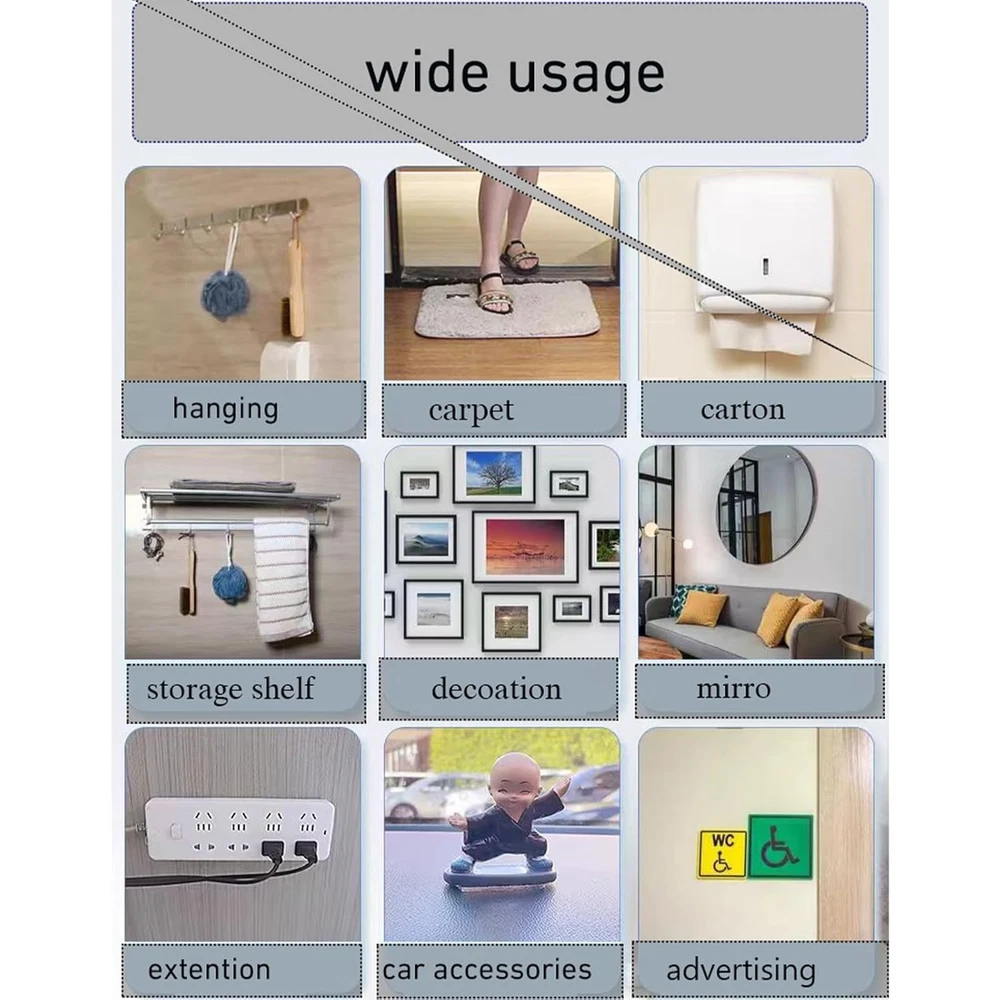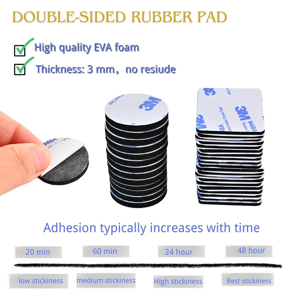 Multiple Dimensions: Moeey pre-cut the double sided foam pad. We have the Moeey logo on the package. The double sided wall tape includes two popular shapes. The package comprises 56 adhesive pads, with 36 each of square and 20 round shapes. You can also cut them into any shapes you need:) Strong and Durable Adhesive:Our double-sided pads are made of high-quality EVA foam (ethylene-vinyl acetate copolymer).These double face tapes carry excellent durability, resilience to varying temperatures and waterproof characteristics. However, because of their own foam materials, they may not be fit for sticking to foam sound insulation boards Dimensions: These square double-sided foam pads are 4 x 4 cm/1.57 x 1.57 inches (L x W), thickness: 3mm/0.1 inches.Round double-sided foam pads are diameter 30mm/1.18 inches, thickness 3 mm/ 0.1 inches. Durable and User Friendly: Wipe the surface, remove the backing paper, and firmly stick on the surface. Our two-sided mounting tapes don't damage the walls. Just enjoy the seamless application and remove it without any damage. Repositioning cannot compromise durability, feel free to reapply. Multipurpose use: This heavy duty mounting tape is ideal for a wide range of applications, including mounting car phone holders, kitchen utensils, LED lights, and more. Note: After applying the sticker, it gradually strengthens: reaching 20% bond strength in 4 hours, 70% in 24 hours, and 100% after 72 hours. For best results, it is advised to wait at least 24 hours before using the sticker to ensure optimal stickiness Product Description Welcome to Moeey, where we're dedicated to revolutionizing your hanging and mounting experience with our socially conscious approach. Our adhesive pads provide the ultimate solution for damage-free hanging. Discover the reliability of our black double-sided tape, the strength of thick foam mounting tape, and the precision of foam panel tape. With Moeey, your projects will reach new heights without leaving a mark. Square Foam Pads Sizes Dimension: 4 x 4 cm/1.57 x 1.57 inches Thickness: 3mm/0.1 inches Round Foam Pads Sizes: Dimension: diameter 30mm/1.18 inches, Thickness: 3 mm/ 0.1 inches Thickness All the square and rectangle strong tape pads have a thickness of 3mm Square&Round Adhesive Pads The color of all the square and rectangle mounting pads is black. Features Super sticky and durable Made of high quality EVA foam (ethylene-vinyl acetate copolymer), our adhesive 2 sided tape have super adhesion. No tools required Farewell to the need for drilling holes or resorting to nails, which could potentially harm your walls. Waterproof Experience superior durability, temperature resistance, and waterproof properties with our foam strips featuring adhesive. Backed by premium double-sided tape, they promise an extended service life, ensuring reliability for your projects. Diverse Application Spectrum Perfectly suited for bonding similar or dissimilar materials, including paper, wood, metal, glass, plastic, and more. Typically utilized for joining housings, panels, LCDs, LEDs, and other assorted components. How to use 1. Make sure the surfaces of both parts you want to bond together are flat and clean; 2. Peel the film from one side and stick to the chosen place, and then wait for about 30 minutes; 3. Peel the other side and then stick to the other chosen place. To ensure the most stickest you'd better wait for 2 to 4 hours before you hang other items. How to remove Just blow the double-sided pads with a common household hair dryer, no damage on the surface of every material they fit. Suitable and unsuitable surfaces for use