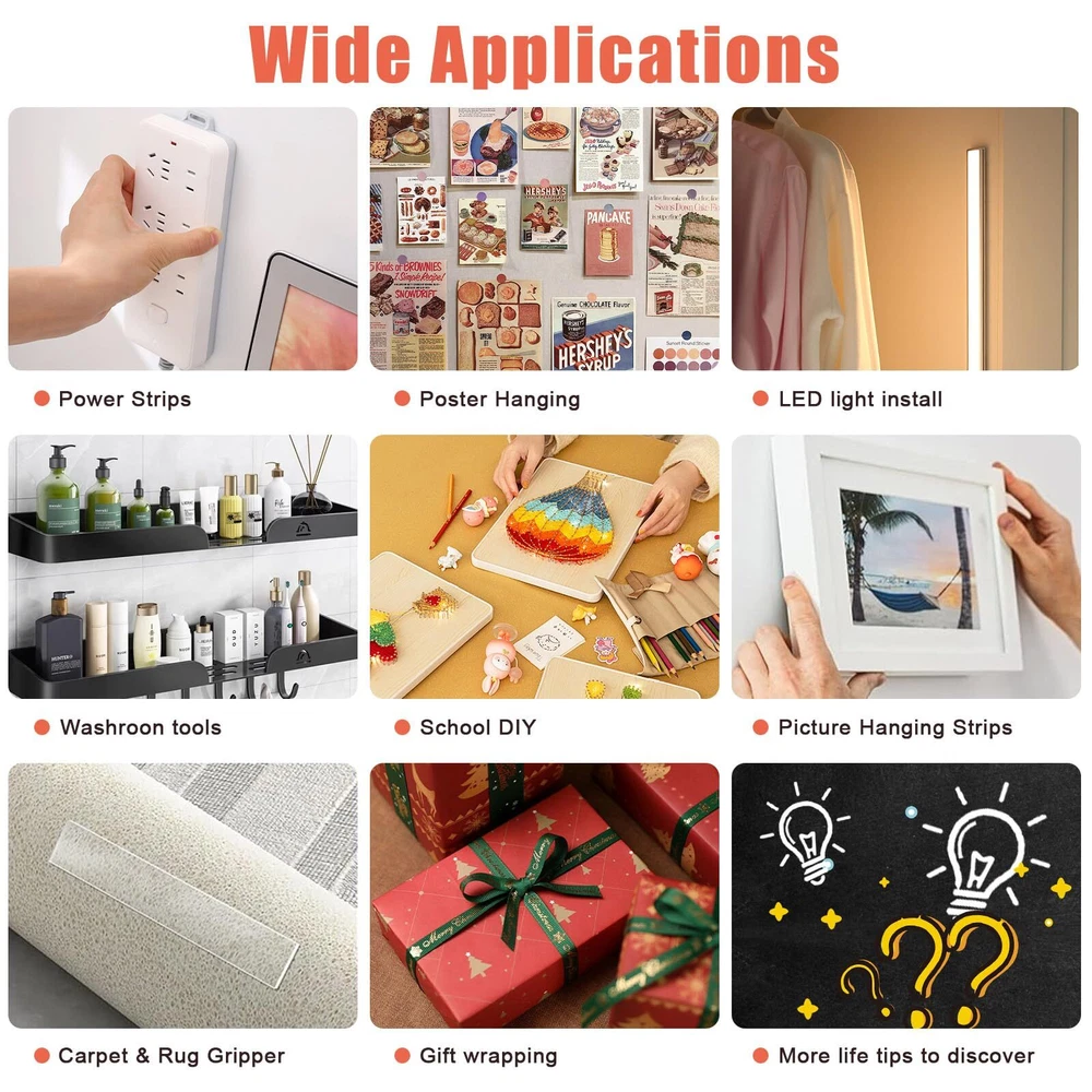 [Double Sided Tape Data]: This double sided tape for walls has a thickness of 1.5MM, width of 1in, length is 20ft and holds up to 70lbs(30mm*31mm sample) strong adhesion of our double sided tape. [Removable Mounting Tape]: The adhesive wall tape is easy to remove and will not damage surfaces. This heavy duty adhesive tape works on almost any smooth surface indoors or outdoors, such as wall, glass, plastic, metal, marble, ceramic, etc. [Reusable Adhesive tape]: Just rinse double sided heavy duty tape off in the sink and let it dry before applying it to a new surface. The adhesive mounting tape still has 70-80% of original adhesive strength. [Multipurpose Wall Tape for Hanging]: This double sided adhesive tape is both weatherproof and waterproof, making it suitable for indoor and outdoor use. You can use it as carpet tape, rug tape, picture hanging strips, wall decor [Easy to use]: This double sided adhesive tape can be easily cut to any size or length you need, stick the tape to the surface of the item, press 30 seconds after applying the double-sided heavy duty tape and wait 20 minutes to obtain 50% adhesion. After 24 hours ,the adhesion strength will grow up to 91%.