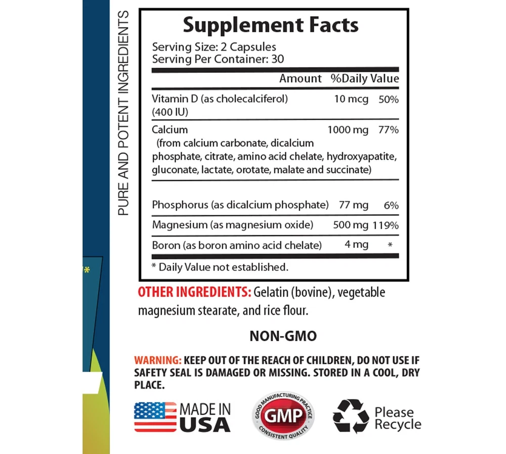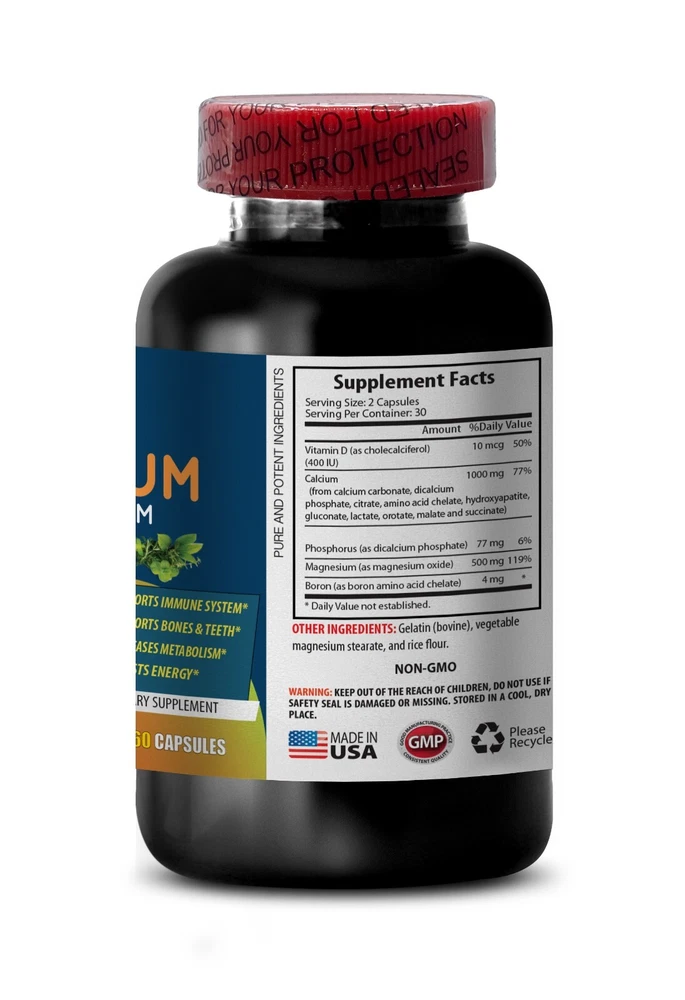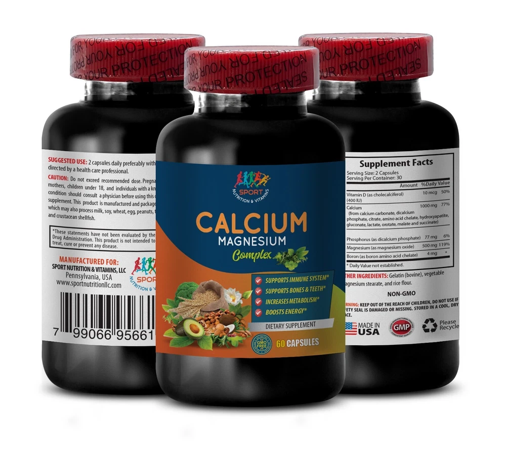 Double Vitality: CALCIUM MAGNESIUM COMPLEX - 2B 120 caps - Optimal Energy Levels CALCIUM MAGNESIUM COMPLEX SUPPORTS JOINT MOVEMENT PROMOTE BONE HEALTH ANTI-INFLAMMATORY SUPPORT RELIEVES PAIN Made In USA 2 Bottle 120 Capsules Discover our exceptional Calcium Magnesium Complex – a superior supplement crafted to elevate your overall health and enhance your well-being. Meticulously formulated, this blend harmoniously combines the vital minerals calcium and magnesium, each delivering distinct advantages to foster a healthier version of yourself. Unveiling the Power of Calcium: Celebrated for its pivotal role in fortifying bones and teeth, calcium stands as an indispensable mineral orchestrating various bodily functions. From blood clotting to nerve transmission and muscle function, calcium plays a multifaceted role. Irrespective of age, ensuring sufficient calcium intake becomes paramount to supporting optimal bone density and mitigating the risk of osteoporosis. Magnesium's Versatility: Magnesium, a mineral of remarkable versatility, participates in over 300 biochemical reactions within the body. Its influence spans energy production, muscle function, and nerve regulation. Noteworthy is magnesium's contribution to maintaining a normal heart rhythm and its facilitation of calcium absorption, amplifying its bone-supporting properties. Highlighting the Distinct Features of our Calcium Magnesium Complex: Bone Health: The dynamic interplay of calcium and magnesium promotes resilient bones, reducing the vulnerability to fractures and bone-related concerns. Muscle Function: Magnesium lends support to proper muscle contraction and relaxation, alleviating muscle cramps and enhancing overall muscle function. Heart Health: Magnesium's role in maintaining a normal heart rhythm contributes significantly to cardiovascular well-being. Nerve Transmission: Both minerals act synergistically in vital nerve functions, ensuring effective communication between nerve cells. Energy Production: Magnesium takes center stage in energy production and utilization, combating fatigue and fostering vitality Elevate your well-being with our premium Calcium Magnesium Complex, providing your body with the essential minerals it craves. Embrace a healthier lifestyle – order now and witness the transformative impact on your overall health and vitality! Supplement Facts Serving Size: 2 Capsules Serving Per Container: 30 Vitamin D (as cholecalciferol) 10mcg Calcium 1000 mg (from calcium carbonate, dicalcium phosphate, citrate, amino acid chelate, hydroxyapatite, gluconate, lactate, orotate, malate and succinate) Phosphorus (as dicalcium phosphate) 77 mg Magnesium (as magnesium oxide) 500mg Boron (as boron amino acid chelate) 4 mg OTHER INGREDIENTS: Gelatin (bovine), vegetable magnesium stearate, and rice flour.