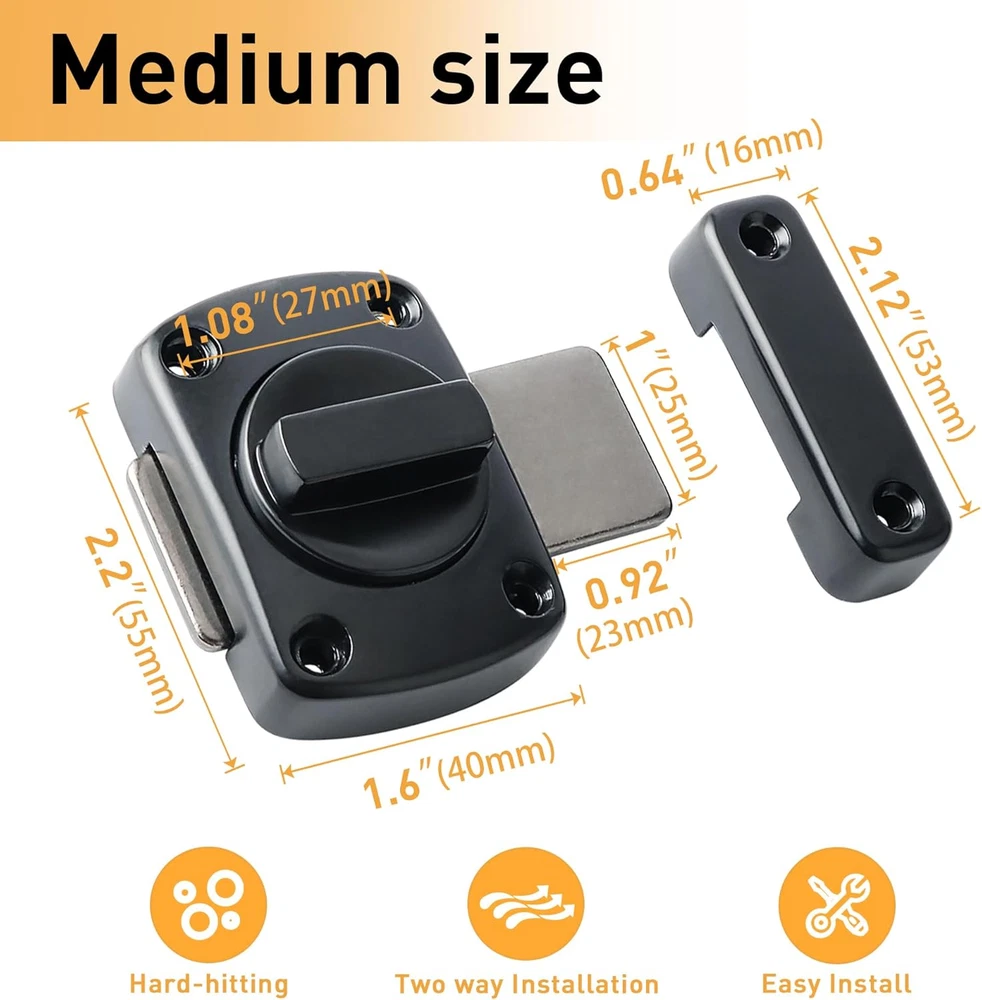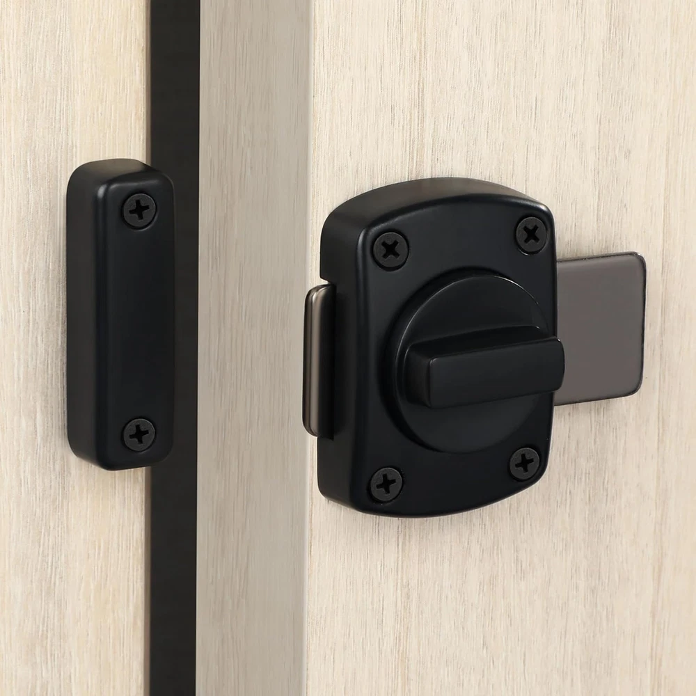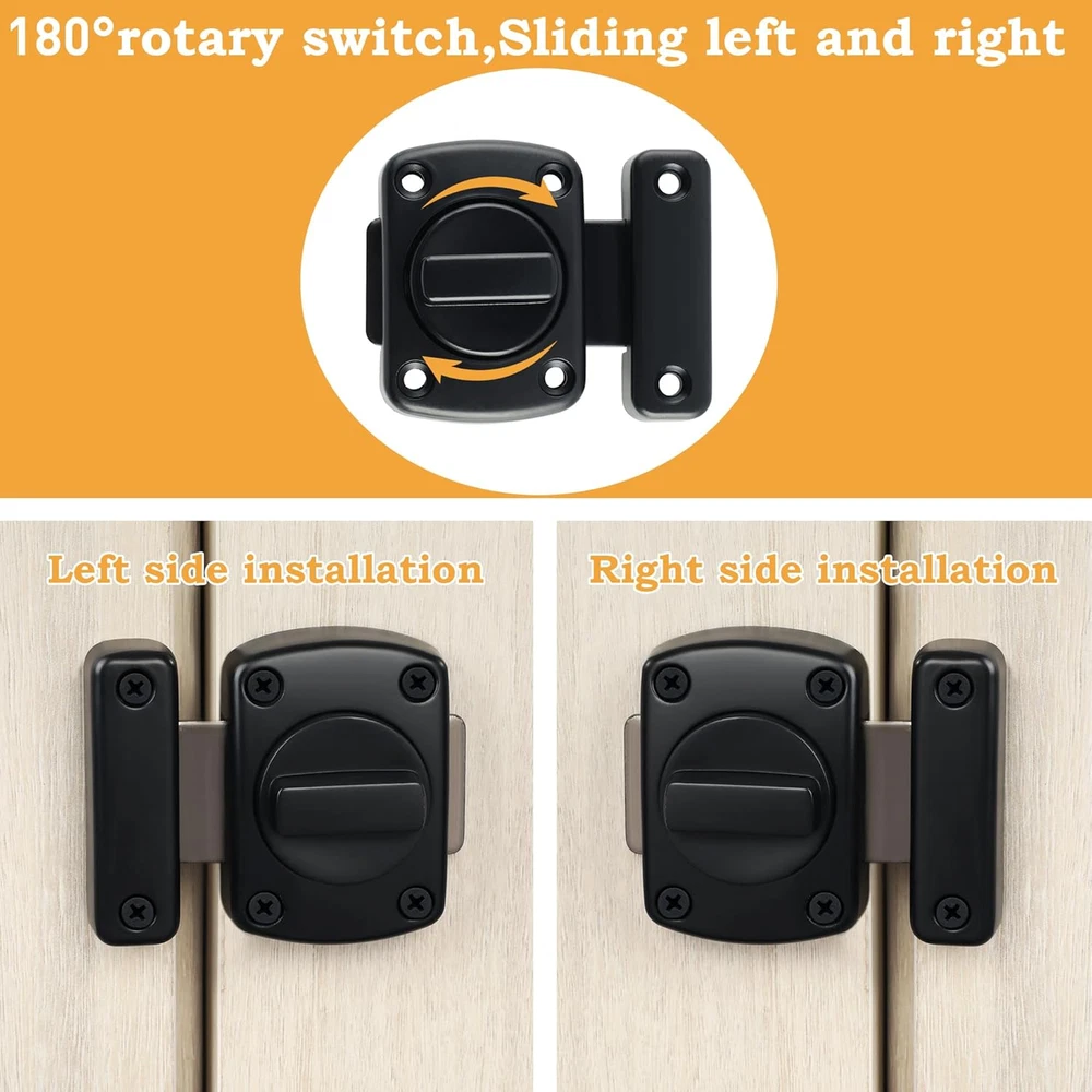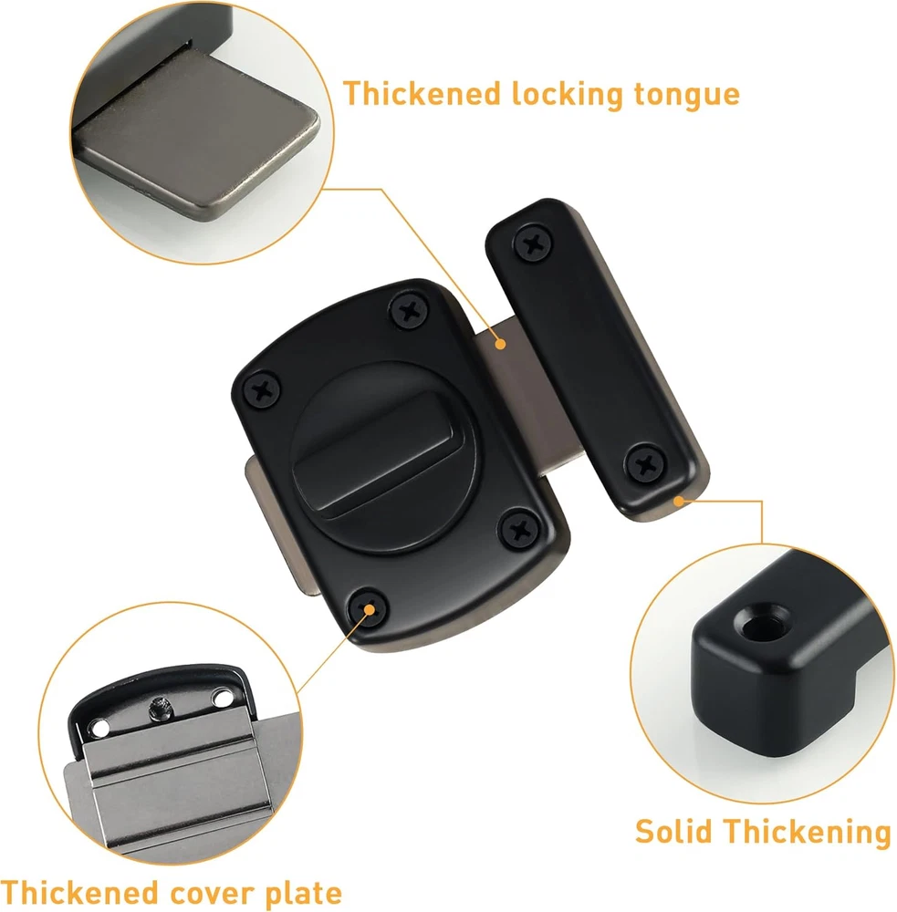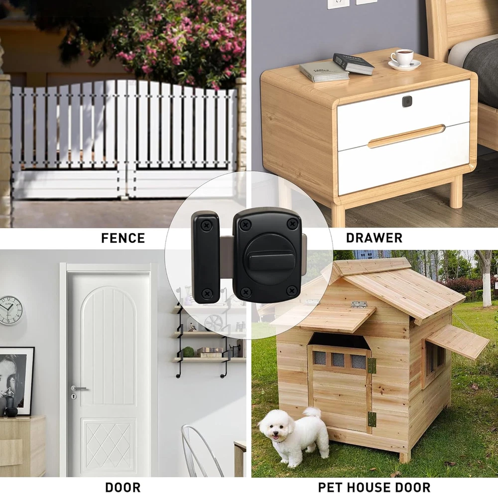 【Zinc Alloy Material】The Alise Double-Sided Gate Latch Slide Bolt Lock is constructed from high-quality zinc alloy, ensuring resistance to daily corrosion and oxidation. This durability guarantees a reliable performance over time. The polished and brushed surface not only enhances its aesthetic appeal but also offers protection against everyday scratches. 【Left And Right Knob Design】This innovative door latch features a unique left and right knob design that supports a smooth 180° rotation. This functionality allows users to effortlessly switch between open and closed positions. The interconnected slide lock mechanism allows for flexible installation, accommodating both left and right orientations for your convenience. 【Heavy Duty Design】Engineered with a robust solid metal structure, this barn door latch is built to withstand significant external impacts. Its thickened design minimizes the risk of bending or breaking, making it an ideal choice for households with elderly individuals or those living alone, providing peace of mind and security. 【Provide Security Measures】Designed for both indoor and outdoor applications, this door latch enhances security by preventing unauthorized access from the opposite side. It is perfect for securing sliding doors, offering additional privacy and safeguarding children or pets from accessing certain areas of the home. 【Easy To Install】Installation is straightforward and hassle-free, as all necessary accessories are included. Simply mark the desired height and mounting holes on your door frame, and secure it with screws. (Please ensure the correct distance of the swivel card for optimal functionality.) Product Description 1 Bedroom 2 Balcony 3 Washroom 4 Fence 5 Wooden Pet Carrier