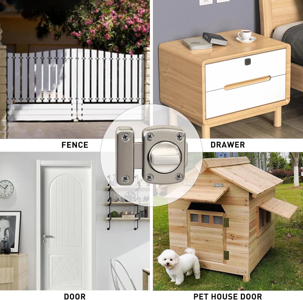 【Zinc Alloy Material】The Alise Double-Sided Gate Latch is expertly crafted from high-quality zinc alloy, providing exceptional resistance to daily corrosion and oxidation. This ensures that the latch remains durable and reliable over time. The polished and brushed surface not only enhances its aesthetic appeal but also offers protection against daily scratches, making it a perfect addition to any door. 【Left And Right Knob Design】This innovative door latch features a unique left and right knob design, allowing for a 180° smooth rotation that simplifies the transition between open and closed states. The interconnected slide lock mechanism grants flexibility during installation, as it can be configured for either side, accommodating various door orientations effortlessly. 【Heavy Duty Design】Constructed from thickened solid metal, this barn door latch is built to withstand strong external impacts, ensuring it remains sturdy and reliable under pressure. Its internally pry-resistant design provides added security, making it an ideal choice for households with elderly members or individuals living alone. 【Provide Security Measures】Designed for both indoor and outdoor use, the Alise gate latch effectively prevents unauthorized access by locking from one side. This feature enhances the safety of your home, allowing you to secure sliding doors for privacy or restrict access to certain areas, such as closets, safeguarding children and pets. 【Easy To Install】Installation is a breeze with the included accessories. Simply mark the desired height and mounting holes on the door frame, and secure the latch using screws. (Note: Ensure the correct distance for the swivel card to guarantee optimal functionality.) Product Description 1 Bedroom 2 Balcony 3 Washroom 4 Fence 5 Wooden Pet Carrier
