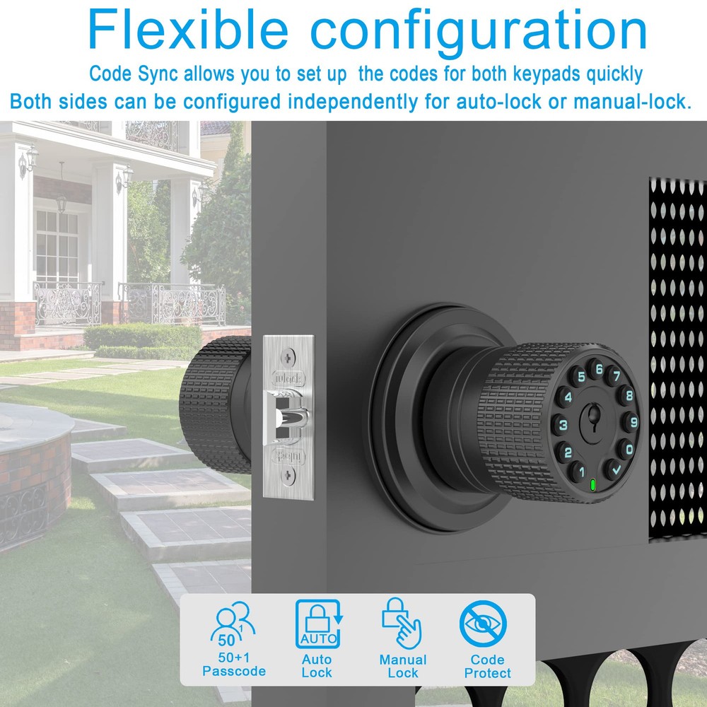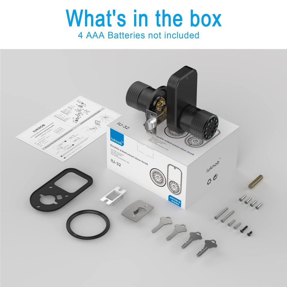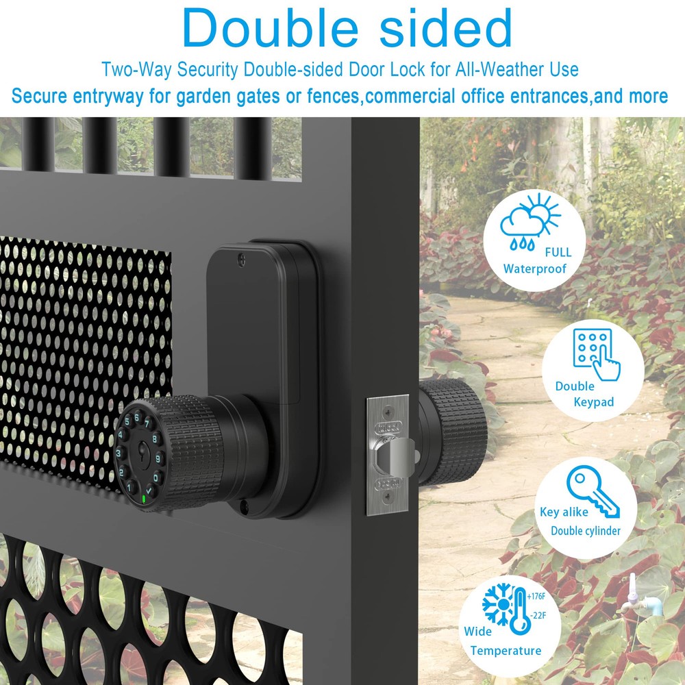 We are dedicated to providing better products and experience for you. Welcome to try the updated version,IU-32 Two-Way Security Double-sided Keypad Door Lock for All-Weather Use.they're designed,crafted and tested to ensure durability. This Keyless Entry Door Knob With Two-Way Security Double-sided Keypad is a reliable and securer option for anyone seeking a stylish high-tech lock for their front or back door,entrance door. Enabling multi-functional control for secure access both in and out. This keypad door knob features keypads and cylinders on both sides,the 4 backup keys are identical, you can rekey them to your other locks, so One key for all your locks.Each side can be set with up to 50 access codes.The backlit keypad makes it easy to operate day or night. With the sync switch turned on,any changes made to the code on one side of the lock will be automatically updated on the other side as well, saving you time and hassle. Anti-peeping user code protection,by touching in up to 40 random digits before and after your correct acess code.Ideal for garden gates or fences door,and exterior or interior doors that require two-way entry control. Plus,this code door lock supports web-based dynamic passwords.You can send temporary codes to guests who require access when you're not at home or office,and you can set the validity period or the number of times that can be used for each code, and they will automatically expire when no longer needed. Suitable for garden gates,fence doors,communityentrance,swimmingpool,publicaccess,church,library,warehouse,etc,where bi-directional control safety is necessary. This combination electronic door knob with key is highly customizable,with options for automatic or manual locking and bi-directional or uni-directional control.Can be set to automatically lock the door 2s to 12hr after closing the door or be set to not lock when there's a lot of coming and going. Perfect for home entrance,commercial offices,medical facilities,departments,etc. This digital keypad door lock is designed with an IPX6 rating, making it waterproof,and can withstand temperatures from -22°F to +176°F,for All-weather use. Crafted from high-quality zinc alloy and electroplated for durability, heavy duty and 2 solid lock cylinders. this Premium Quality lock is robust and sturdy. Exquisite in detail for higher security and long-time use. This keyless entry door lock with handle fits all metal or wooden doors with thickness ranging from 1-3/8" to 2-3/4",with two 2-3/8" or 2-3/4" adjustable latches, Type-C USB charging port for emergency. Low power consumption,4 new AAA batteries available for over a year. Low battery warning, you can also turn on the silent mode if need. has always been responsible for every valued customer.Offers a 1-year warranty,lifetime after-sales customer service and 24/7 online technical support. Two-way security: 👈This Keyless Entry Door Knob features keypads and cylinders on both sides,with the keys being identical.Enabling multi-functional control for secure access both in and out.50 acess codes each keypad,and the backlit keypad makes it easy to operate day or night.For garden gates or fences door,and exterior or interior doors that require two-way entry control. Flexible settings: 👈This electronic keypad door lock is highly customizable,with options for automatic or manual locking and bi-directional or uni-directional control.Can be set to automatically lock the door 2s to 12hr after closing the door or be set to not lock when there's a lot of coming and going.Perfect for home entrance,commercial offices,medical facilities,departments,etc. Password synchronization:👈 With the sync switch turned on,any changes made to the code on one side of the lock will be automatically updated on the other side as well, saving you time and hassle.Plus,anti-peeping user code protection,low battery beep,Low power consumption,4 new AAA batteries available for over a year.Type-C USB charging port for emergency,peace of mind for you. Durable and Special waterproof technology:👈 This keypad code lock with handle is made of high-quality zinc alloy and features an electroplated coating,heavy duty and with 2 solid lock cylinders.This digital keypad door lock is designed with an IPX6 rating, special waterproof technology, making it waterproof,and can withstand temperatures from -22°F to +176°F, so for All-weather use. Versatile use and Satisfaction Guaranteed: 👈 Fits all metal or wooden doors with thickness ranging from 1-3/8" to 2-3/4".Suitable for garden gates,fence doors,community entrance,swimming pool,public access,church,library,warehouse,etc,where bi-directional control safety is necessary.The manufacturer offers a 1-year warranty,lifetime after-sales customer service and 24/7 online technical support.