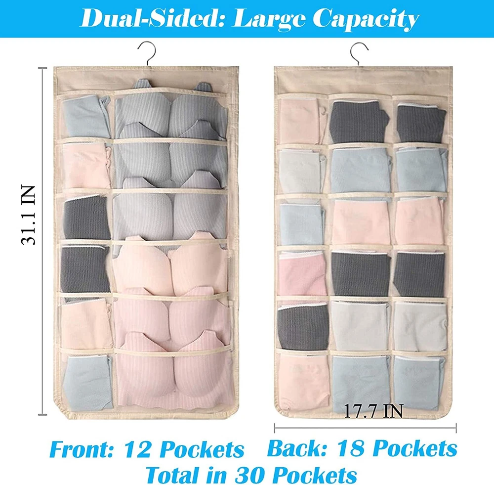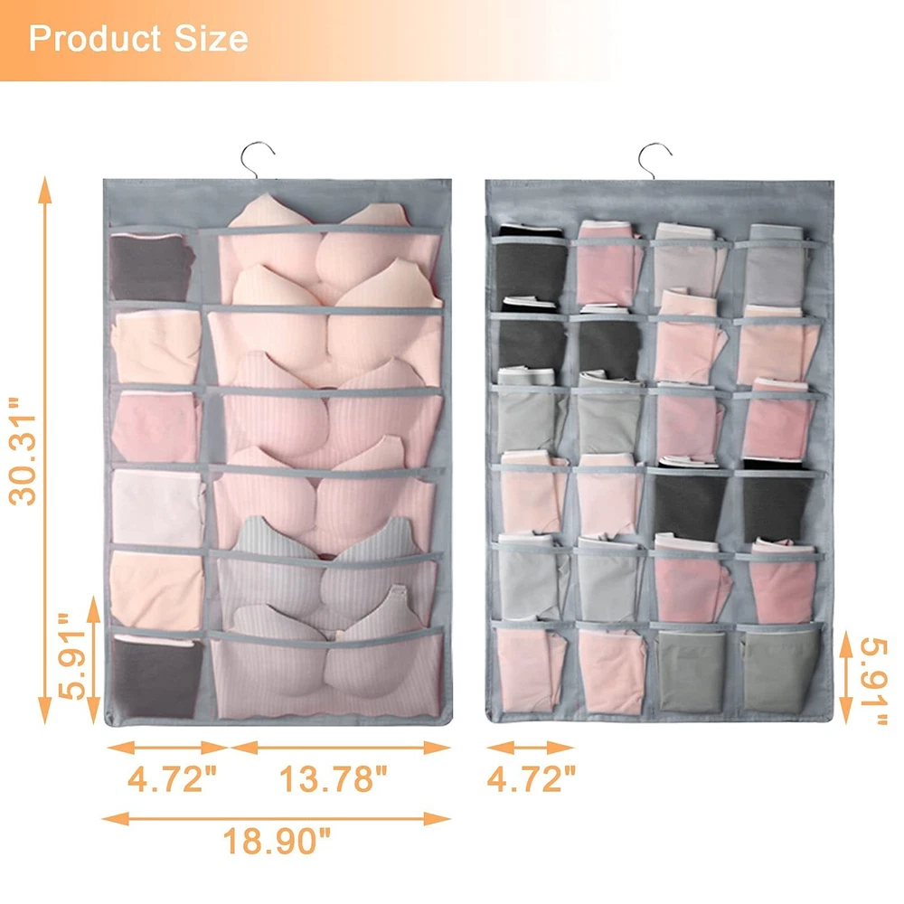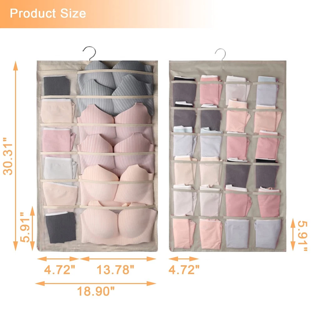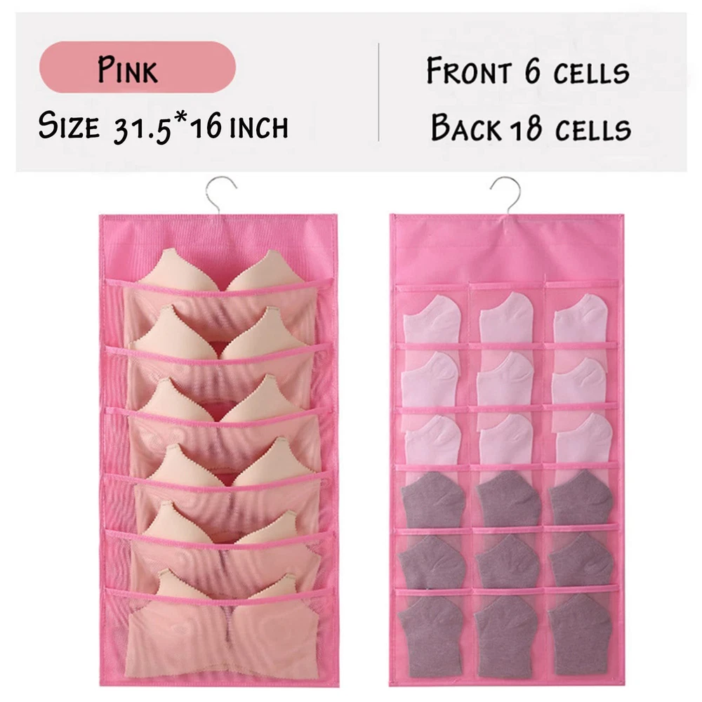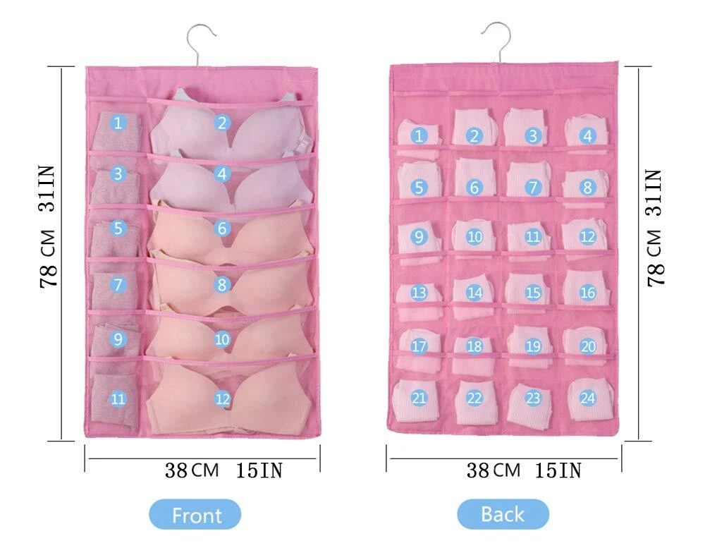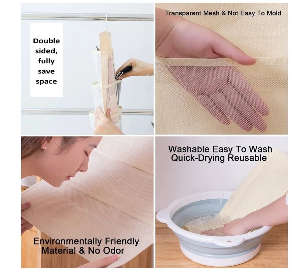 1.Eco-friendly and Durable Material: made of breathable nonwoven mesh cloth 2.Transparent, can make you see and find stuff easily. 3.Two-sided organizer, space saving. 4.Comes with a stainless-steel hanger. Hand wash, and it can dry in air quickly. 5.Versatile usage: you can hang this organizer in closet, laundry room, bedroom, storage room, dorm, travel RV etc. It will give you a cleaner space.