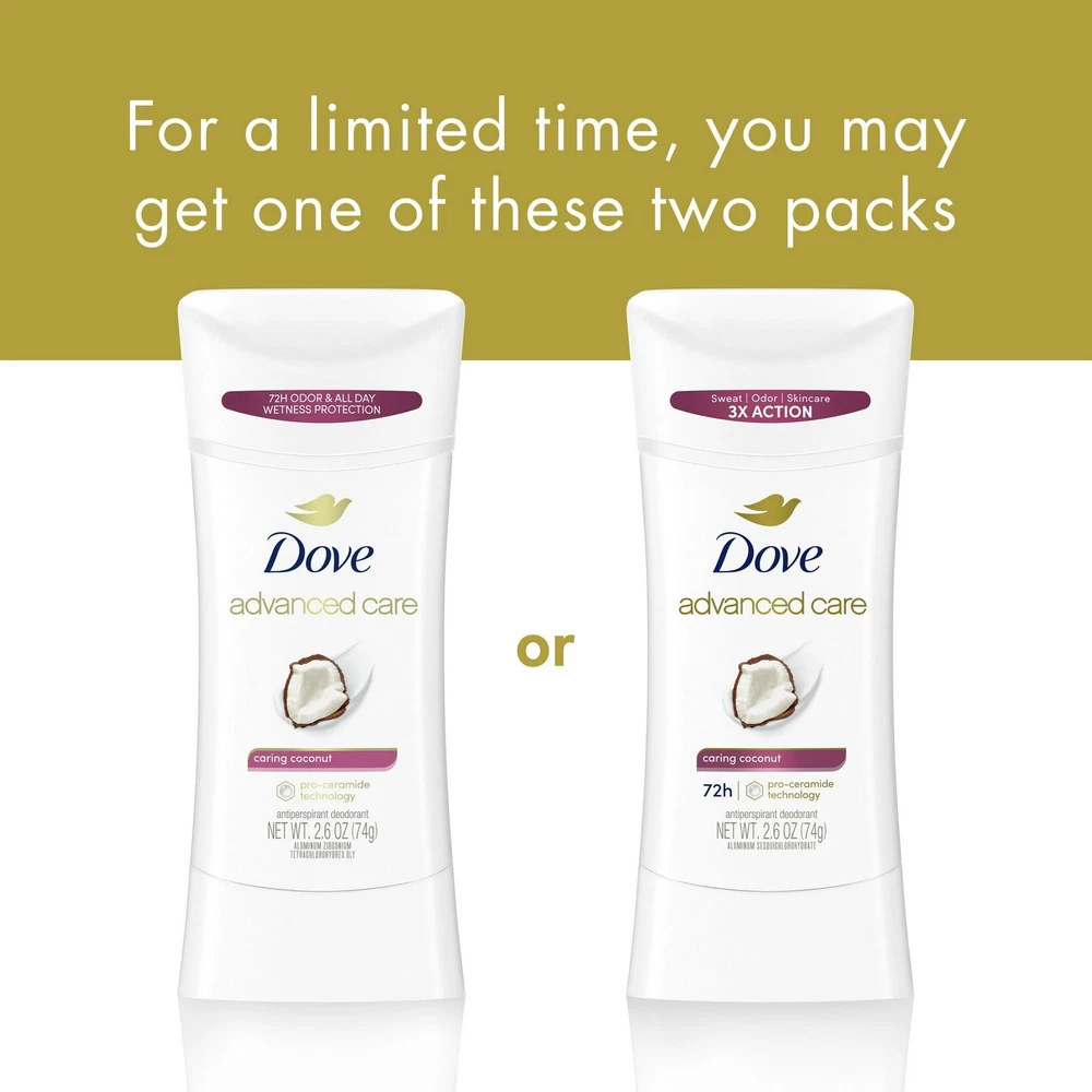 Product Description Dove Advanced Care Antiperspirant Deodorant Caring Coconut 2.6oz Dove Advanced Care Antiperspirant Deodorant Stick for Women Caring Coconut, 2.6 oz. It’s time to show off your underarms with confidence with this antiperspirant hero. Meet Dove Advanced Care Caring Coconut Antiperspirant Deodorant Stick, which works to help your skin barrier repair after shaving with every use, delivering soft, resilient underarms with every use.Once applied, allow the jasmine petal and creamy coconut scent to uplift and energize you throughout the day. Dove Advanced Care Antiperspirant Deodorant Stick for Women Caring Coconut, 2.6 oz CARES & PROTECTS: Dove Advanced Care Caring Coconut Antiperspirant Stick is the kind-to-skin antiperspirant deodorant for beautifully soft, resilient underarms. LONG-LASTING PROTECTION: Antiperspirant deodorant with 72-hour sweat and odor protection. CARING FORMULA: Antiperspirant featuring innovative Pro-Ceramide Technology. REPLENISHES SKIN: Antiperspirant deodorant that helps your skin barrier repair and improve after shaving. DELICATE FRAGRANCE: Antiperspirant deodorant stick with a delicate jasmine and creamy coconut scent. KIND TO SKIN: PETA Approved Vegan, alcohol-free antiperspirant deodorant. For adult use. Ingredients Inactive ingredients Stearyl Alcohol, C12-15 Alkyl Benzoate, Cyclopentasiloxane, Isopropyl Palmitate, PPG-14 Butyl Ether, Hydrogenated Castor Oil, PEG-8, Dimethicone, Helianthus Annuus (Sunflower) Seed Oil, Fragrance (Parfum), Polyethylene, Silica, Steareth-100, BHT, Alpha-Isomethyl Ionone, Benzyl Alcohol, Benzyl Salicylate, Coumarin, Eugenol, Hexyl Cinnamal, Limonene, Linalool