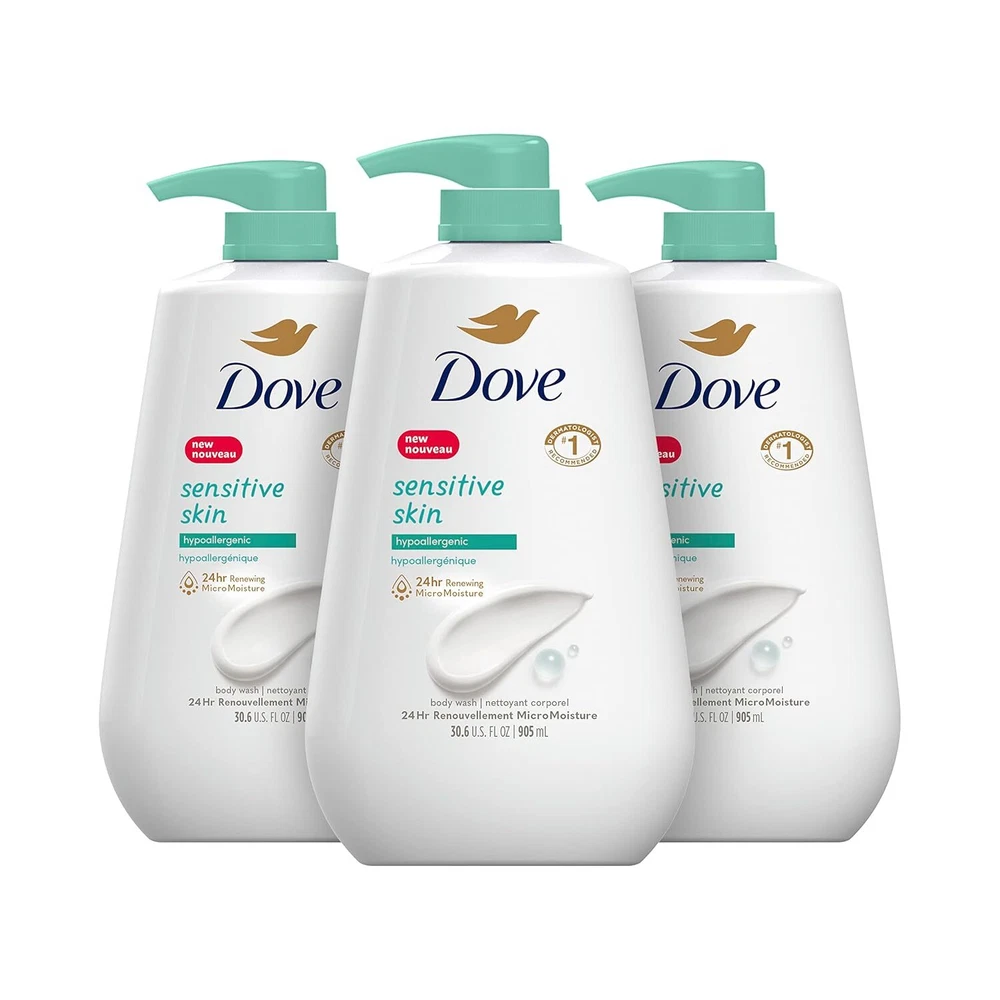 Dove Body Wash 3 Count with Pump Sensitive Skin Hypoallergenic, Paraben-Free, Sulfate-Free, Cruelty-Free, Moisturizing Skin Cleanser Effectively Washes Away Bacteria While Nourishing Skin 30.6 oz 24HR RENEWING MICROMOISTURE: Dove Hypoallergenic Sensitive Skin Body Wash gently cleanses and nourishes the skin, leaving it renewed and healthy-looking for 24 hours FOR SOFT, SMOOTH SKIN: Dove Hypoallergenic Body Wash for sensitive skin is formulated with millions of MicroMoisture droplets, and leaves skin soft as silk HYPOALLERGENIC: This gentle skin cleanser, with a hypoallergenic formula soothes dryness HOW TO USE: Squeeze a generous amount of Dove Hypoallergenic Body Wash into your palms. Massage the nourishing body wash onto your skin, taking a moment to enjoy the rich lather before rinsing off NO.1 DERMATOLOGIST-RECOMMENDED BODY WASH BRAND: From the No.1 dermatologist-recommended body wash brand, this body wash, made with plant-based moisturizers, gently cleanses your skin and nourishes its microbiome