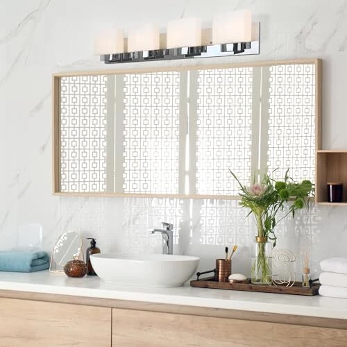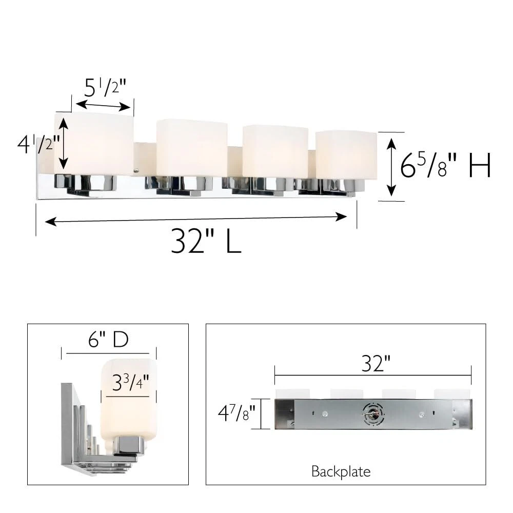 The Dove Creek 4-Light Vanity Light has a rectangular backplate and square shaped glass shades for an updated yet classic look. This renovation-friendly vanity light features a large backplate to minimize paint touchups and drywall repair when replacing an existing vanity light. Constructed of formed steel with a polished chrome finish and frosted glass, this 4-light wall light adds a modern accent to your home. Measuring 6.5-inches (H) by 32-inches (W), this vanity light features steel trim to add elegance in any room or entry way. This fixture uses four maximum 60-watt medium base bulbs (not included). Designed and manufactured by , the trusted source for quality lighting, hardware, plumbing, kitchen, and bath products for every taste and budget. Traditional Style Vanity Light: Stunning polished chrome finish with square frosted glass shades that can be mounted up or down Renovation Friendly: Large rectangular backplate minimizes paint touchups and drywall repairs Four Light Vanity Light: Uses four maximum 60-watt medium base bulbs (not included) Dimmable: Allows you to create the perfect atmosphere when used with a compatible dimmer switch (not included) Sturdy and Durable: Steel construction for long-lasting use; cETL/ETL listed for use in damp locations
