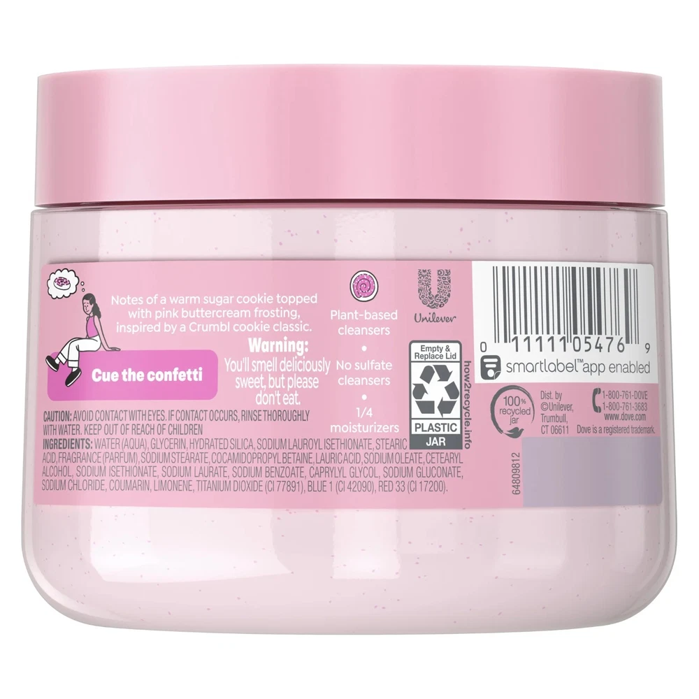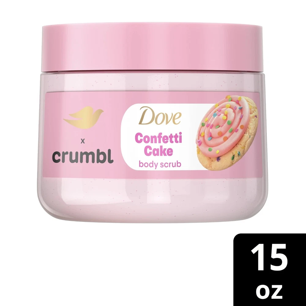 Product details Dove Crumbl Exfoliating Body Scrub Confetti Cake, 15 oz. The next big Crumbl drop is here. And it’s ready for pickup in your shower ASAP. New Limited Edition Dove x Crumbl Confetti Cake Body Scrub will have you throwing the confetti like every day is your birthday. It has the same sweet scent as this Crumbl cookie classic with notes of warm sugar cookie topped with pink buttercream frosting so you can cookie ‘til your heart’s content. While your senses are on a sugar rush - your skin is in for a sweet surprise too. Watch as the plant-based cleansers and ¼ moisturizing cream gently exfoliate for glowing skin. Win-win. But warning: You’ll smell deliciously sweet, but please don’t eat. Dove Crumbl Exfoliating Body Scrub Confetti Cake, 15 oz Crumbl for Confetti Cake cookies…now in a Body Scrub Notes of warm sugar cookie topped with pink buttercream frosting for the shower Plant-based cleansers to deeply nourish and exfoliate your skin No sulfate cleansers pH balanced formula for soft, smooth skin