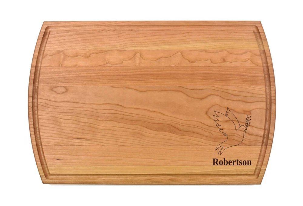 Design: Personalized Dove Cutting Board or Charcuterie Serving Tray All items ship via USPS - please make sure your address is correct :-) Whether used as a charcuterie serving tray for snacks or cutting board, our bamboo, walnut and cherry custom boards are the perfect addition for the home and make the perfect gift for your loved one celebrating a birthday, anniversary, new home, wedding, etc! *** FEATURES *** • SIZES: We have multiple styles and sizes available. To see our current sizes available, click the drop-down menu. The photo slide contains a photo showing each side by side. Please note, the board with the juice groove only has the groove on the front side of the board. • THICKNESS: Bamboo Boards - Approximately 1/2" Thick; Walnut & Cherry Boards - Approximately 3/4” Thick • UNIQUE: Every board is unique with the grain and coloring varying throughout - no board is the same! • CARE INSTRUCTIONS: Hand wash only with warm water. Do not soak. Please apply mineral oil throughout the board’s life. • PERSONALIZATION/CUSTIMIZATION: Do you want the text placed differently on the board? Please don’t hesitate to contact us. All personalization notes can be entered in the personalization box when checking out. • SHIPPING: All cutting boards ship within 2 to 5 business days. • WHOLESALE ORDERS: Please don’t hesitate to contact us for information about wholesale orders. Processing times for larger orders may change. • NOTE: Colors can vary a bit on different monitors and screens. Any props included in photos are not included. Please be sure to double-check your address to make sure it is accurate for USPS delivery. If a package is returned to us due to an invalid address, the buyer is responsible for all additional shipping charges. We appreciate you supporting small business – best wishes! For items ordered with simple edits, we do not send proofs since the layout doesn't change from the example(s). However, in the event there are requests that change the layout from the example(s), we do send proofs for approval before making the product. If you'd like a proof before we make the product, please note so in the personalization box.