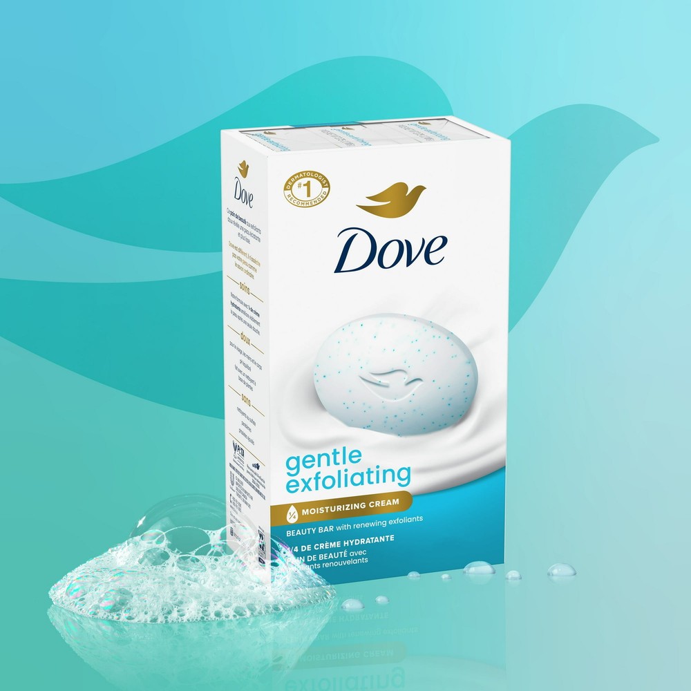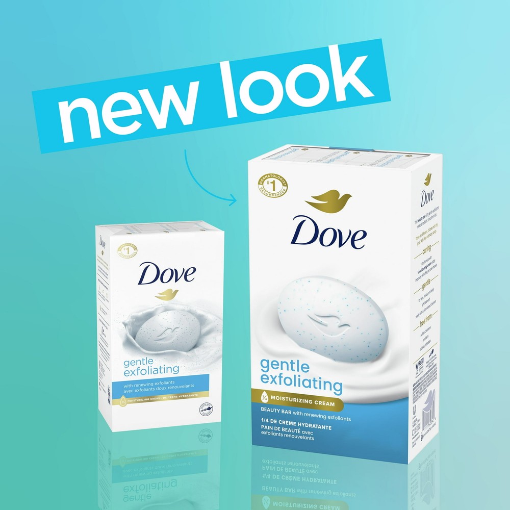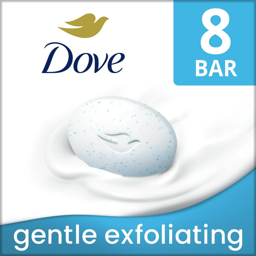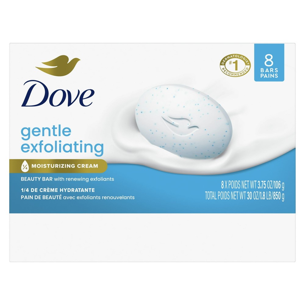 About this item Product details Dove Beauty Bar Soap for Women Gentle Exfoliating All Skin, 3.75 oz 8 Bars. This Dove Beauty Bar offers a gentle exfoliating experience. Unlike ordinary bar soap, the Beauty Bar is made with moisturizing cream to deeply nourish skin and prevent dryness. This cleansing bar is uniquely created with moisturizing cream and a plant-based cleanser for skin care that maintains pH balance and the natural skin barrier. Made with gentle exfoliants, this gentle skin cleanser is multi-purpose: gently washing away dirt and oil while revealing radiant, smooth skin. It is gentle enough for use on hands, and body. To use this Gentle Exfoliating Beauty Bar, wet your hands and gently lather the Beauty Bar between them, then apply the lather to your body and scrub before rinsing thoroughly with water. Dove Beauty Bar Soap for Women Gentle Exfoliating All Skin, 3.75 oz 8 Bars EXFOLIATES & MOISTURIZES: Dove Gentle Exfoliating Beauty Bar with mild exfoliants renews and cleanses without irritating your skin like ordinary bar soap. LOCK IN MOISTURE: Formulated with moisturizing cream, this Beauty Bar and gentle skin cleanser leaves skin instantly soft and smooth with lasting nourishment. DERMATOLOGIST RECOMMENDED: The Dove Beauty Bar formula is pH balanced and free from sulfate cleansers, parabens, and phthalates. Dove is the No.1 bar recommended and used by dermatologists. VISIBLY IMPROVED SKIN: This Beauty Bar leaves skin softer, smoother, and more radiant for visibly improved skin after just one shower with moisturizing bar soap. EFFECTIVE CLEANSER: Scrub away dirt and germs with an all-in-one cleanser for use every day on hands and body. This Dove Beauty Bar creates a luxurious lather and won’t dry your skin like ordinary bar soaps. CARE WITH YOUR CLEANSER: Globally, Dove does not test on animals and is PETA Approved. Our mission is to help the next generation of women develop a positive relationship with the way they look.