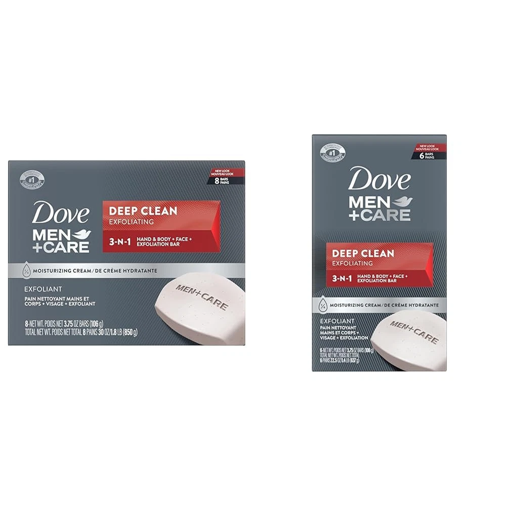 Dove Men+Care Body and Face Bar thoroughly cleanses and hydrates skin for healthier, stronger skin versus regular soap. Deep Clean bar that effectively washes away bacteria, nourishes your skin #1 Dermatologist Recommended soap bar Shower soap that cleans skin without leaving your skin feeling dry or tight Body soap with a patented design with unique technology developed for men's skin Purifying micro grains, 1/4 moisturizing cream in this mens soap Dove Men+Care Body Bar fights skin dryness and feels better than regular soap Product Description Looking for a bar soap for men that cleanses while also helping protect from dry skin? Dove Men+Care Deep Clean Body and Face Bar contains purifying grains and delivers a deep, refreshing clean that leaves skin feeling hydrated and strong. Dove Men+Care Body and Face Bar effectively washes away bacteria, nourishes your skin. Body and face soap bar goes beyond just delivering a deep clean: it helps to protect skin from feeling tight and dry with its unique formula made for men’s skin. With ¼ moisturizing cream, the Dove Men+Care Deep Clean Body and Face Bar nourishes for skin that feels healthy and strong. This #1 Dermatologist Recommended body soap and face soap bar helps to maintain skin’s hydration levels and protect skin against dryness. Regular men’s bar soap can often leave skin feeling tight and dry, but Dove Men+Care Deep Clean Body and Face Bar helps maintain skin’s moisture to provide skin comfort and refreshment. Plus, its formula is non-comedogenic and mild and gentle enough to use on your face. To use Dove Men+Care Deep Clean Body and Face Bar, wet the body bar in the shower and massage into your face and body to create a light foam before rinsing thoroughly. The lather rinses cleanly away without leaving behind a greasy feel. Dove Men+Care Deep Clean Body and Face Bar has a classic scent, and is clinically proven to fight skin dryness. This body bar not only cleanses, but also leaves your skin feeling healthy and strong. Brand Story By Dove