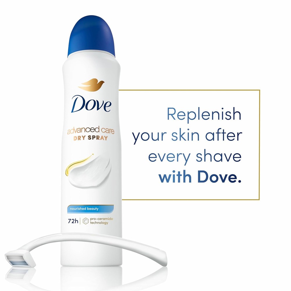 Dove Dry Spray Antiperspirant Deodorant Nourished Beauty 3.8 oz (1 Pack) Dove Advanced Care Long Lasting Women's Antiperspirant Deodorant Dry Spray Floral, the everyday essential that helps repair your skin barrier after shaving with every use. Indulge in the crisp apple, zesty citrus and soft powder fragrance in this antiperspirant, which refresh and soothe your senses as you go about your day. Did you know that when you shave About this item Dove Advanced Care Nourished Beauty Antiperspirant Deodorant Spray for beautifully soft, resilient skin 72-hour antiperspirant deodorant with sweat protection and underarm odor control CARING FORMULA: Featuring Pro-Ceramide Technology Antiperspirant deodorant spray that helps skin barrier repair, recover and improve from shaving Antiperspirant infused with a crisp apple and zesty citrus scent PETA Approved Vegan, alcohol-free antiperspirant All Day Protection: Provides long-lasting protection from sweat and odor Nourishing Formula: Contains moisturizing ingredients to leave skin feeling soft Fresh Scent: Light, refreshing fragrance leaves skin smelling clean Spray Application: Easy to apply with a quick, light mist Suitable for All Skin Types: Gentle formula is formulated for sensitive skin Ingredients Active ingredient: Aluminum Chlorohydrate (20.2%). Inactive ingredients: Butane, Hydrofluorocarbon 152a, Cyclopentasiloxane, Isobutane, PPG-14 Butyl Ether, Fragrance (Parfum), Helianthus Annus (Sunflower) Seed Oil, Disteardimonium Hectorite, C12-15 Alkyl Benxoate, Propane, BHT, Octyldodecanol, Propylene Carbonate, Dimethiconol, Tocopheryl acetate