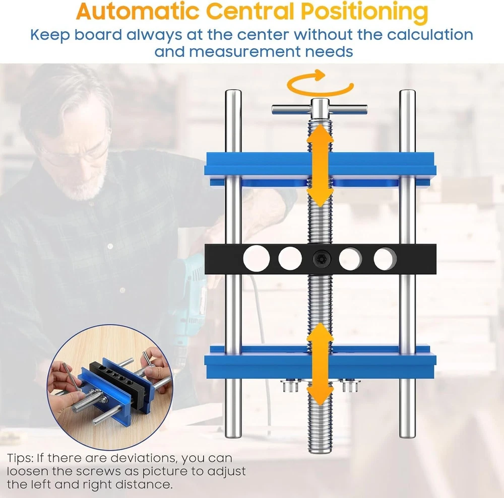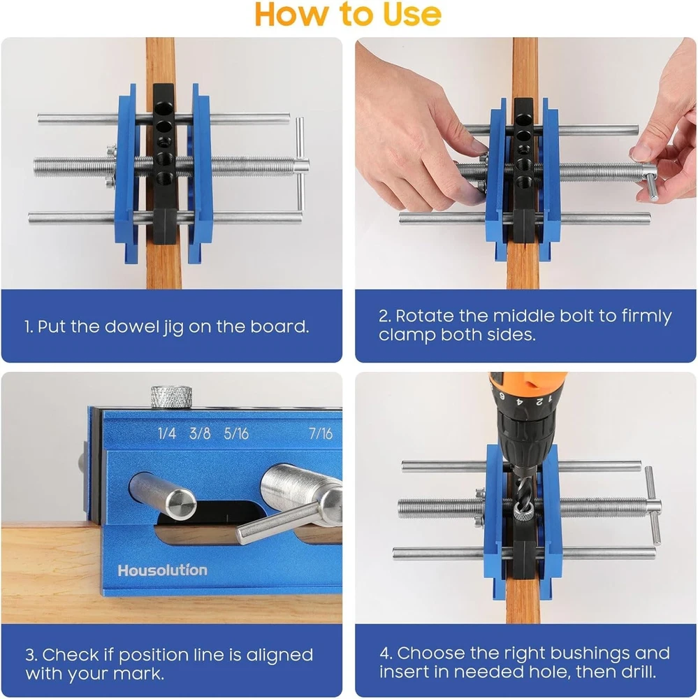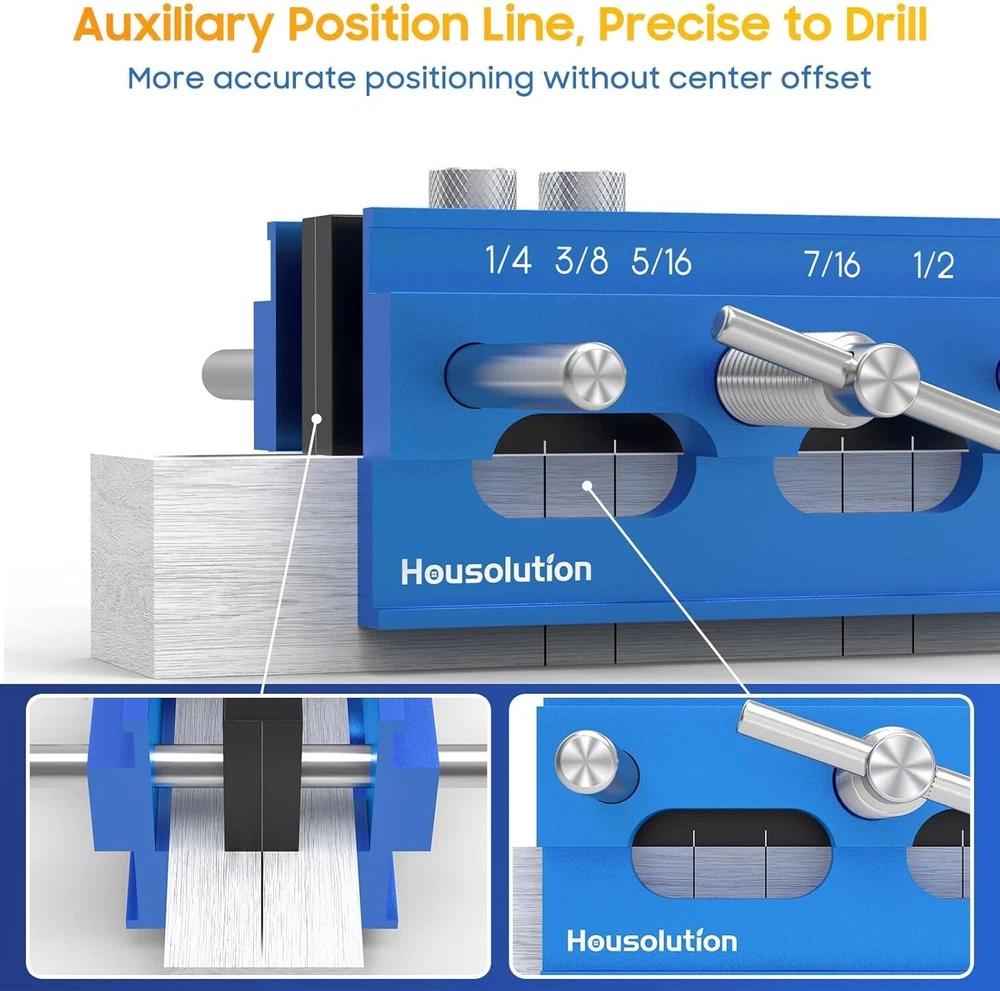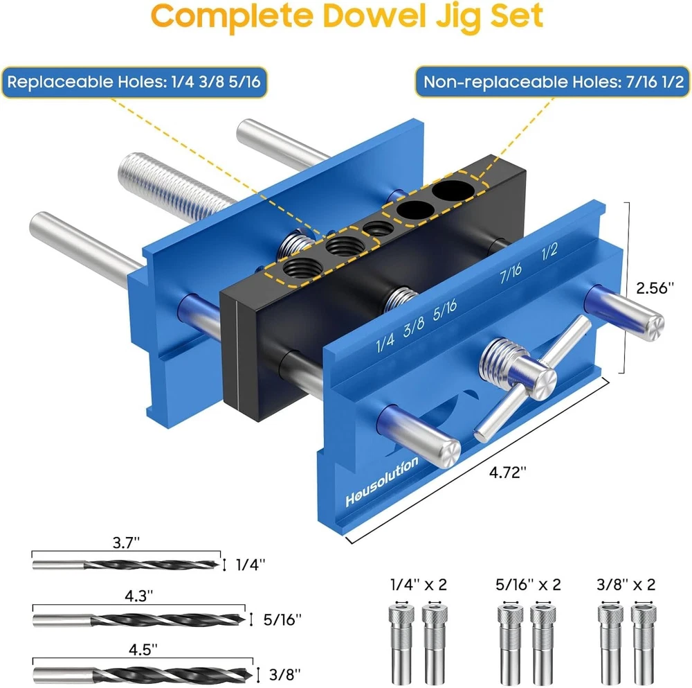 Dowel Jig 6 Extra Length Self Centering Dowel Jig Kit With 6 Drill Guide Blue Item dimensions L x W x H: 7.87 x 4.72 x 2.56 inches Color: Blue Style: Self-centering dowel jig Item Weight: 52.91 Ounces The Housolution self centering dowel jig kit has been upgraded, more accurate positioning without center offset (most other jigs on the market will have center offset), which will not leaving any gaps. Precise drilling can be easily achieved. Made of aluminum alloy for aviation, doweling jig for woodworking is sturdy and durable, which can be used for a long time without worrying about wear and tear. When rotating the middle bolt, the aluminum clips on both sides of the self centering dowel jig will be tightened simultaneously, providing uniform and stable clamping pressure for clamping the workpiece, achieving automatic centering without the need for measurement or calculation. The drill jig is easy to adjust and can hold boards of different thicknesses from 3/8 inch to 6 inch. Suitable for creating different wooden pin joints and can be used to make precise butt joints, miter joints, and edge joints, as well as for mortise joints. Dowel jig is designed specifically for drilling and wooden joints, with 5 standard SAE drill bit sizes which are named 1/4 inch, 3/8 inch, 5/16 inch, 7/16 inch, and 1/2 inch. Easily apply it to mortise and tenon joints, build furniture and repair tables, making it an ideal tool for panel furniture. The package includes 1*6'' woodworking doweling jig, 6*hardened steel bushings (2 each for 1/4 inch, 5/16 inch and 3/8 inch), 3*drills (each for 1/4 inch , 5/16 inch and 3/8 inch drill), 3*positioning rings. The complete dowel jig set makes it easier for you to position and punch holes on the board. Return Policy: We offer a 30 day return policy from the receiving date. Please contact us for a Free Return Label. Please use our return label so it will go back to our supplier and we can do a refund or replacement afterwards. Feedback: Your satisfaction is very important to us! If you have any problem with your order, please contact us and we will do our very best to make you satisfied. As long as you are happy with your purchase, please leave a positive feedback for us. We will always leave you a positive feedback in return. If you have any problem with your purchase, please do not leave a negative feedback. Please Contact us ... and your issue will be solved quickly and positively We are a small family-owned business trying to make a living, not a huge company that does not care ... We will ALWAYS do our best for you!