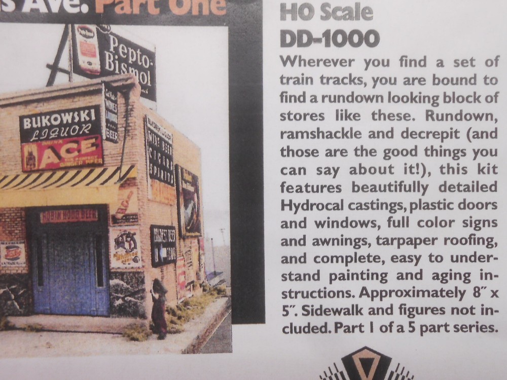 Special this week! Special pricing + will also send a set of our extremely deteriorated concrete sidewalks (a $25 value) at no extra charge! Save $35! The best kits you can buy for 3 reasons!! One. Attention to detail & realism. All of the original pattern work is hand carved by an artisan for maximum realism. This allows Downtown Deco kits to include details you'll never find in other kits. Missing and chipped bricks, "ghost' staircases and walls, crumbling stucco and cracked and weathered concrete. If you can find it in real life you'll see it in a Downtown Deco kit! Two. Ease of construction. We try & keep the kits simple so you can get to the fun part (painting & weathering the buildings) in about 30 minutes. Our instructions are second to none, with complete, easy to understand instructions that walk you through each and every step along the way, from basic assembly to painting & weathering the model. Three. Customer service. Got a question about weathering your model? Give us a call. End up with a broken part somehow? We'll replace the parts for free. Paint your first hydrocal kit & you're unhappy with the way it came out? Drop us an email & we'll send you a second set of castings so that you can try again. Why do we do this? Because we want you to have fun with our kits and to be happy with your finished results. If you need anything at all touch base with us & we'll help you out. Our customer service is second to none. 100% positive feedback! This model kit Addams Ave Part One features hydrocal castings chock full of the funky detail we're known for, full color signs, a laser cut stencil, plastic doors & windows & complete, easy to understand instructions. This kit is bound to generate more comments from your guests than a boxcar full of quaint little depots! Look at the detail in the stucco, stone & brickwork 8" x 5" footprint. Cheers!