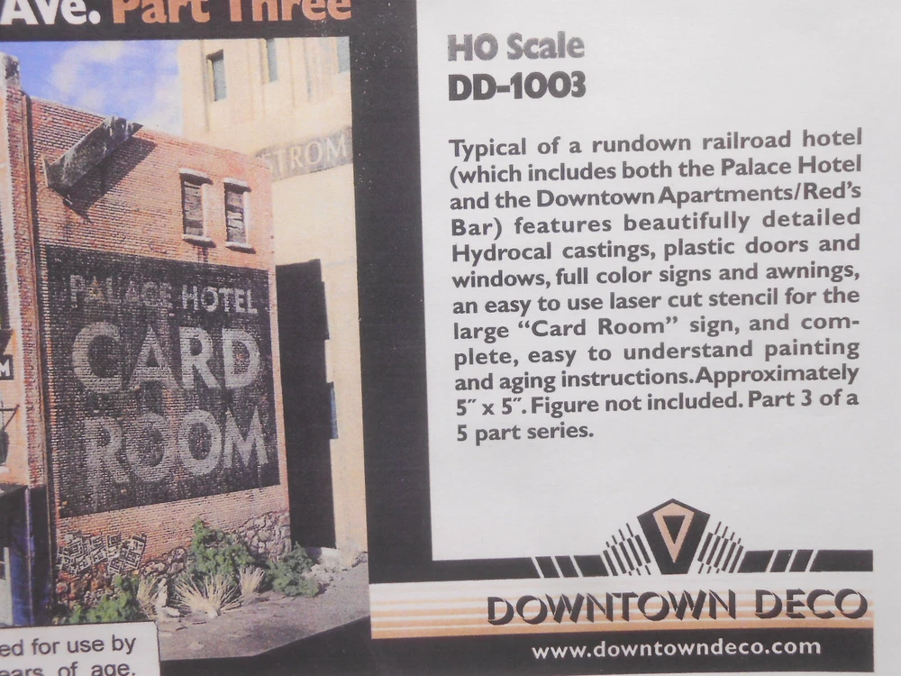 Special this week! Special pricing + will also send one of our roof top detail sets (a $25 value) at no extra charge! Save $35! The best kits you can buy for 3 reasons!! One. Attention to detail & realism. All of the original pattern work is hand carved by an artisan for maximum realism. This allows Downtown Deco kits to include details you'll never find in other kits. Missing and chipped bricks, "ghost' staircases and walls, crumbling stucco and cracked and weathered concrete. If you can find it in real life you'll see it in a Downtown Deco kit! Two. Ease of construction. We try & keep the kits simple so you can get to the fun part (painting & weathering the buildings) in about 30 minutes. Our instructions are second to none, with complete, easy to understand instructions that walk you through each and every step along the way, from basic assembly to painting & weathering the model. Three. Customer service. Got a question about weathering your model? Give us a call. End up with a broken part somehow? We'll replace the parts for free. Paint your first hydrocal kit & you're unhappy with the way it came out? Drop us an email & we'll send you a second set of castings so that you can try again. Why do we do this? Because we want you to have fun with our kits and to be happy with your finished results. If you need anything at all touch base with us & we'll help you out. Our customer service is second to none. 100% positive feedback! This model kit Addams Ave Part Three features hydrocal castings chock full of the funky detail we're known for, full color signs, a laser cut stencil, plastic doors & windows & complete, easy to understand instructions. This kit is bound to generate more comments from your guests than a boxcar full of quaint little depots! Look at the detail in the stucco, stone & brickwork 5" x 5" footprint. Cheers!