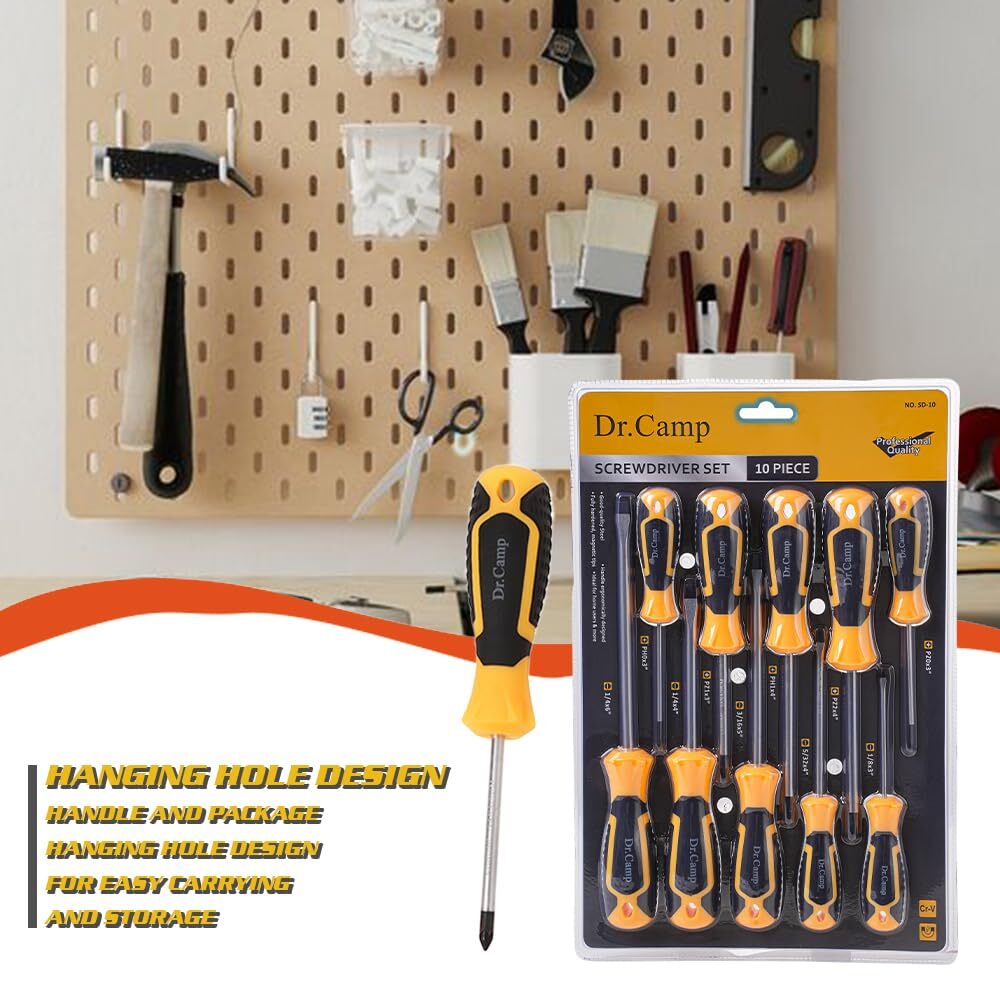 Tackle all your home repair and DIY projects with ease using this comprehensive 10-piece screwdriver set from . Crafted with durable materials, these screwdrivers offer a secure grip and precise control for effortless tightening and loosening of screws. The set includes a variety of flat-head and Phillips-head screwdrivers in assorted sizes, ensuring you have the right tool for every job. Whether you're assembling furniture, fixing appliances, or working on minor home improvements, this versatile set has you covered. With its compact design, it's easy to store and transport, making it an essential addition to any toolbox or household toolkit. Upgrade your DIY arsenal with this reliable and practical screwdriver set. Professional-Grade Durability: Crafted from high-quality CR-V (Chrome Vanadium) steel, these screwdrivers are designed for long-lasting strength and corrosion resistance, making them perfect for daily use and heavy-duty tasks. Versatile 10-Piece Set: Includes a variety of screwdriver types—slotted, Phillips, and Pozidriv—offering comprehensive solutions for a wide range of household and professional projects. Ergonomic Design: Each screwdriver features a non-slip, soft-grip handle that ensures maximum comfort and precision during use, reducing hand fatigue even during extended work sessions. Hanging Hole for Easy Storage: The handle and packaging are designed with a convenient hanging hole, allowing for easy organization and storage, keeping your workspace neat and tools easily accessible. Precision Tips for Accuracy: The precisely machined tips provide a perfect fit for screws, reducing the risk of cam-out and stripping, ensuring your work is done efficiently and effectively.