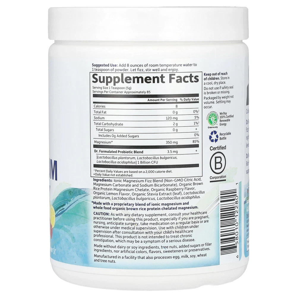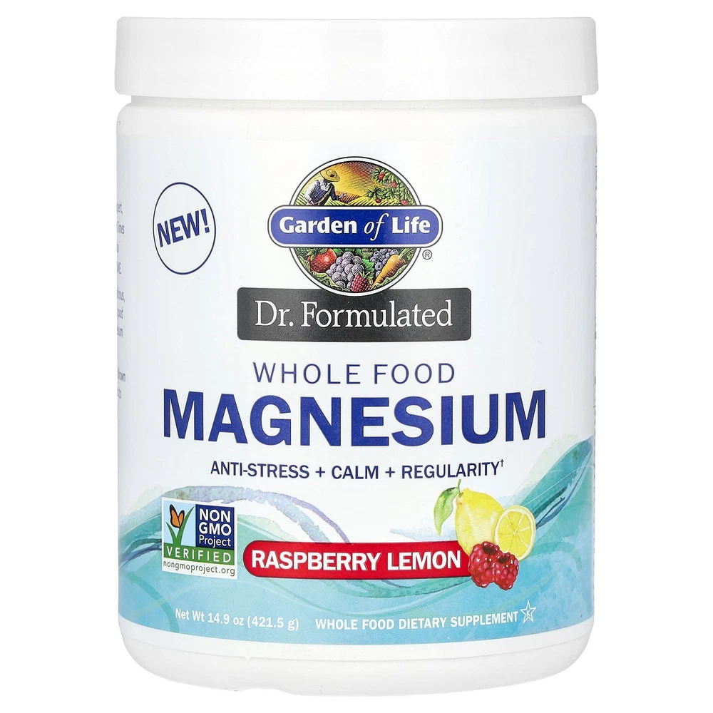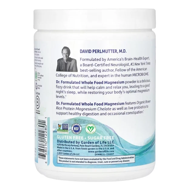 Anti-Stress + Calm + Regularity Non-GMO Project Verified Whole Food Dietary Supplement Kosher Certified B Corporation NSF Certified Gluten-Free Certified Vegan Sugar Free David Perlmutter, M.D. Formulated by America's Brain-Health Expert, a Board-Certified Neurologist, #1 New York Times best-selling author, Fellow of the American College of Nutrition, and expert in the human Microbiome. Dr. Formulated Whole Food Magnesium powder is a delicious, fizzy drink that will help calm and relax you, leading to a good night's sleep, while restoring your body's optimal magnesium levels. Dr. Formulated Whole Food Magnesium features Organic Brown Rice Protein Magnesium Chelate as well as live probiotics to support healthy digestion and occasional constipation. Our eBay Store About Us Contact Us Add to Favorite Sellers Supplement Facts Serving Size: 1 Teaspoon (5 g) Serving Per Container: Approximately 85 Amount Per Serving %Daily Value Calories 8 Total Fat 0 g 0%¹ Sodium 120 mg 5% Total Carbohydrate 2 g 1%¹ Total Sugars 0 g + Includes 0 g Added Sugars 0% Magnesium* 350 mg 85% Dr. Formulated Probiotic Blend [Lactobacillus plantarum. Lactobacillus bulgaricus, Lactobacillus acidophilus] 1 Billion CFU 3.5 mg + ¹Percent Daily Values are based on a 2,000 calorie diet. + Daily Value not established. *Made with a proprietary blend of ionic magnesium and whole food organic brown rice protein chelated magnesium. Expiration Date: 08/01/2026 Disclaimer: Our receiving department does its best to verify and then enter the correct expiration dates for all incoming products. However, discrepancies do occur from time to time. This being said, the exceptionally high turnover at iHerb ensures that our inventory is among the freshest in the industry. Garden of Life, Dr. Formulated, Whole Food Magnesium, Raspberry Lemon, 14.9 oz (421.5 g) DESCRIPTION: Anti-Stress + Calm + Regularity Non-GMO Project Verified Whole Food Dietary Supplement Kosher Certified B Corporation NSF Certified Gluten-Free Certified Vegan Sugar Free David Perlmutter, M.D. Formulated by America's Brain-Health Expert, a Board-Certified Neurologist, #1 New York Times best-selling author, Fellow of the American College of Nutrition, and expert in the human Microbiome. Dr. Formulated Whole Food Magnesium powder is a delicious, fizzy drink that will help calm and relax you, leading to a good night's sleep, while restoring your body's optimal magnesium levels. Dr. Formulated Whole Food Magnesium features Organic Brown Rice Protein Magnesium Chelate as well as live probiotics to support healthy digestion and occasional constipation. SUGGESTED USE: Add 8 ounces of room temperature water to 1 teaspoon of powder. Let fizz, stir well and enjoy. INGREDIENTS: Ionic magnesium fizz blend (non-gmo citric acid, magnesium carbonate and sodium bicarbonate), organic brown rice protein magnesium chelate, organic raspberry flavor, organic lemon flavor, organic stevia extract (leaf), lactobacillus plantarum, lactobacillus bulgaricus, lactobacillus acidophilus. Made without dairy or soy ingredients, tree nuts, added sugars or filler ingredients, nor artificial colors, flavors, sweeteners or preservatives. Manufactured in a facility that also processes egg, milk, soy, wheat and tree nuts. WARNINGS: As with any dietary supplement, consult your healthcare practitioner before using this product, especially if you are pregnant, nursing, anticipate surgery, take medication on a regular basis or are otherwise under medical supervision. Use with children under supervision after consultation with your child's healthcare professional. This product is not intended to treat chronic constipation, which may be a symptom of a serious disease. Keep out of reach of children. Store in a cool, dry place. Do not use if safety seal is broken or missing. Packaged by weight not volume. Settling may occur.