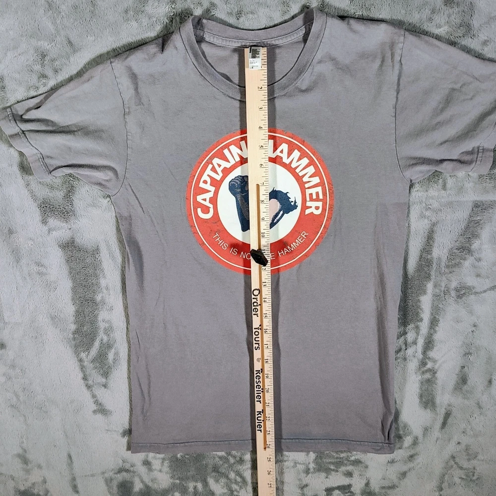 Condition Notes: Good overall condition. Moderate wear and slight fading. See photos. Product Notes: • Made in USA by American Apparel • Purchased new in 2008 • Short sleeve crewneck • Distressed Captain Hammer "Arm & Hammer" Parody graphic • 100% Combed Cotton Measurements: Pit to Pit: 16.875 Chest: 33.5 inches Hem to Collar: 24.75 front hem, 24.875 back hem Please check photos and measurements carefully.