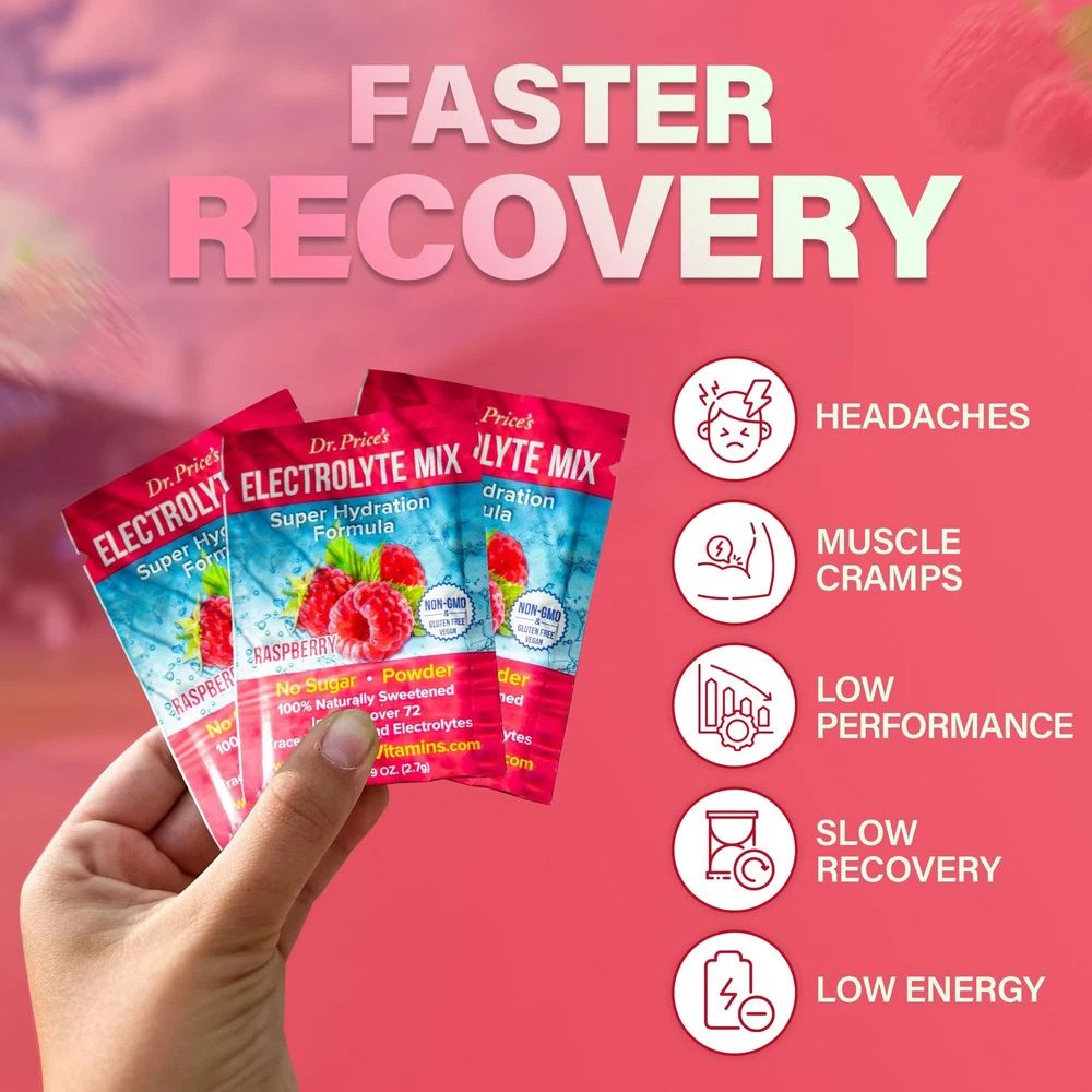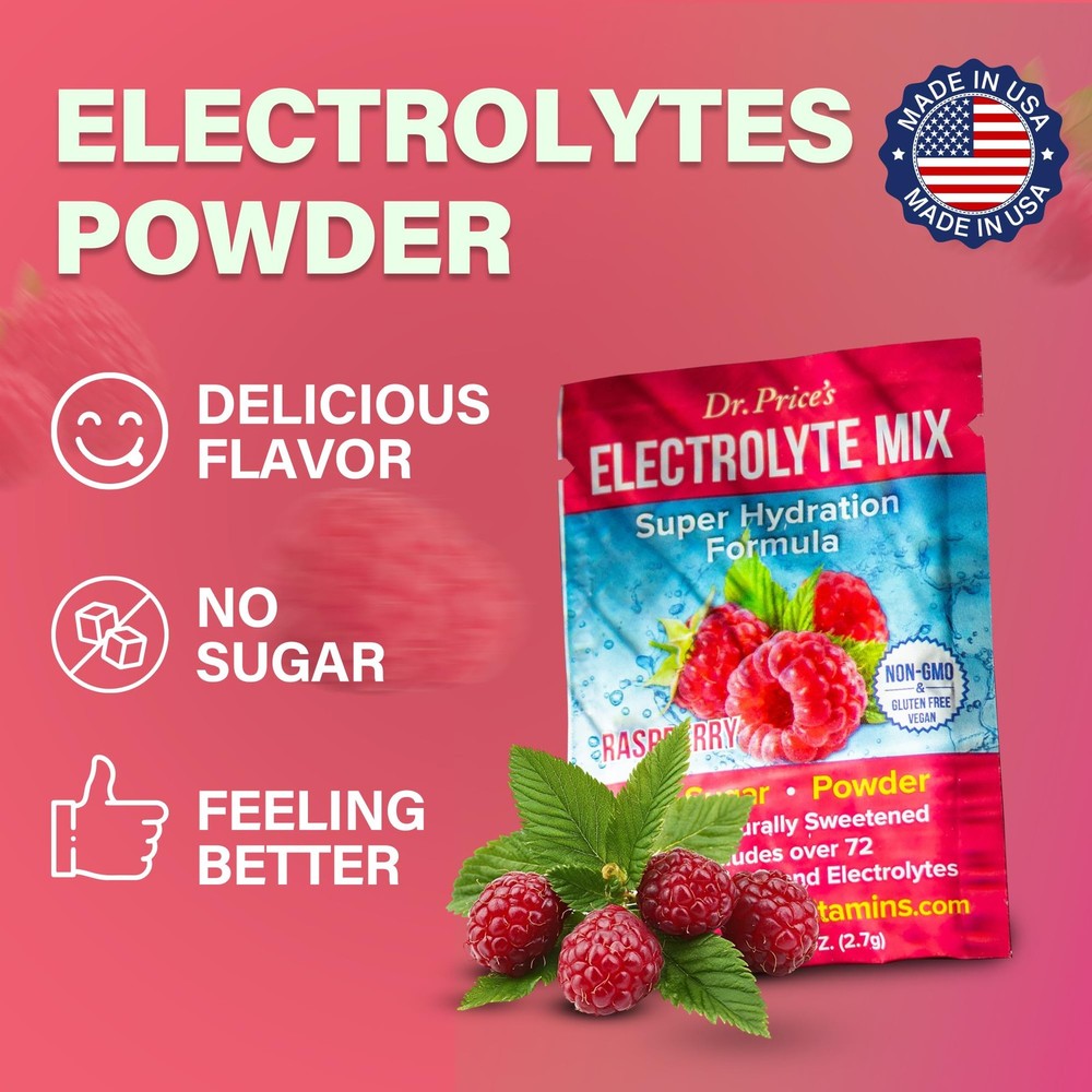 Dr. Price’s Electrolyte Mix is a blend of over 72 Trace Minerals and Electrolytes. We have created a formula that will benefit all types of people ranging from the elite athlete to your personal hydration needs. A great tasting and convenient way of hydrating properly and naturally! Whether you are a beginner or elite athlete or just someone living in a hot and humid environment, proper hydration and electrolyte consumption is essential for health and performance. If the body has a lack of hydration (water) WITH electrolytes (minerals like salt, potassium and calcium), it causes an imbalance and a loss of minerals that should flow through the joints; this can cause inflammation, pain and arthritis. Water alone without electrolytes, will not properly hydrate the body. The joints and cells in the body need a perfect balance of minerals to work properly. Dr. Price’s electrolyte powder has achieved this perfect balance. Rapid Hydration & Electrolyte Balance – Dehydration can leave you feeling drained, sluggish, and unfocused. Our electrolytes powder replenishes sodium, potassium, magnesium, and 72+ trace minerals to support hydration, energy, and recovery. Ideal for daily wellness, workouts, travel, and active lifestyles. Sugar-Free Formula with Clean Ingredients – No added sugars, artificial sweeteners, or unnecessary fillers—just a refreshing cherry lemonade hydration powder with ingredients that support your body’s natural balance. Great for those following low-carb, keto, or fasting-friendly routines while maintaining optimal hydration. Support Muscle Function & Endurance – Fatigue, cramps, and soreness can be signs of electrolyte depletion. This electrolyte drink mix helps maintain muscle function, nerve communication, and fluid balance, keeping you feeling strong, whether you’re exercising, working, or recovering from heat and activity. Mixes Instantly & Tastes Great – No chalky texture, no clumping—just smooth, hydration packets that dissolve quickly in 16 oz of water for a clean, refreshing drink. With 90 servings per container, it's an easy, cost-effective way to stay hydrated at home, in the gym, or on the go. Smart Hydration for Everyday Use – Designed for all ages and activity levels, our sugar-free electrolytes powder delivers the essential minerals your body needs to stay balanced. Whether you need a boost during busy days or post-workout recovery, this hydration mix keeps you going strong. Proudly made in the USA to ensure premium quality. Stay refreshed, stay ready. 💧