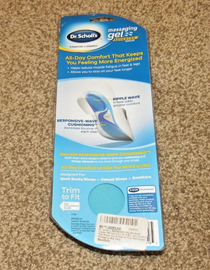 Dr. Scholl's Massaging Gel Advanced Insoles Women's 6-10 1 pair (2 insoles) New in Packaging Purchased, but never used We designed Dr. Scholl's Massaging Gel Insoles especially for people with foot discomfort and foot and leg fatigue. Made with Massaging Gel Technology, they double the comfort in your shoes, for those with foot discomfort, so you can feel comfortable and more energized all day. Helps reduce muscle fatigue in the feet and legs Ultra-Soft Blue Gel Waves Cushion Feet All-Day Long, Fits Work Boots, Casual Shoes And Sneakers, Firmer Purple Gel Provides Added Support Please check out my eBay store - I'll gladly combine shipping!