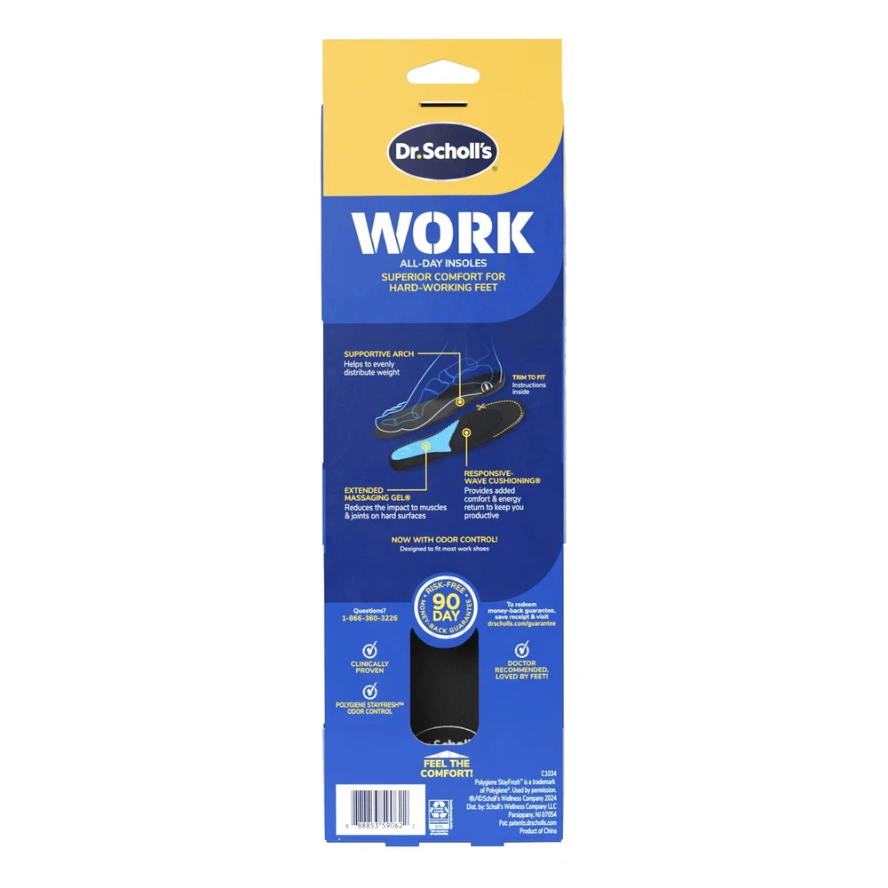 Product Page Dr Scholls Work Insoles for Men All Day Comfort Gel Inserts for Tired Feet Description: Dr. Scholl’s® Work Insoles with Massaging Gel® are specially designed for people who work on their feet all day and experience discomfort and fatigue in their feet and legs. These insoles provide relief to tired achy feet & legs to stay energized. All-day superior comfort for hard-working feet! Features: ALL-DAY SUPERIOR COMFORT FOR HARD-WORKING FEET: Dr. Scholl’s WORK All-Day Shoe Insoles for Men provide comfort throughout the day, specially designed for those with demanding, active lifestyles. HELPS RELIEVE TIRED, ACHY FEET & LEGS TO HELP YOU FEEL MORE ENERGIZED: These shoe inserts help eliminate fatigue in feet and legs from standing or working all day, distributing foot pressure to reduce muscle and joint strain, supporting you to feel energized and productive. MASSAGING GEL TECHNOLOGY: Featuring patented gel wave technology with extended massaging gel cushioning, these shoe insoles help absorb shocks and impacts, reducing stress on muscles and joints when working on hard surfaces. RESPONSIVE CUSHIONING FOR ENHANCED ENERGY RETURN: Adaptive and responsive, these insoles help to provide energy return that revitalizes your every step, encouraging comfort and productivity. ADVANCED ODOR CONTROL FOR FRESHNESS: Integrated with Polygiene StayFresh Technology, these insoles not only provide superior comfort but also help control odors, keeping your feet feeling fresh all day. These trim-to-fit insoles can be customized for a perfect fit in any shoe.