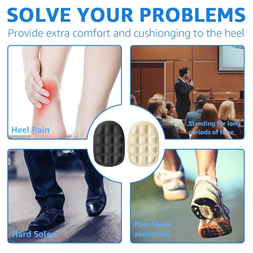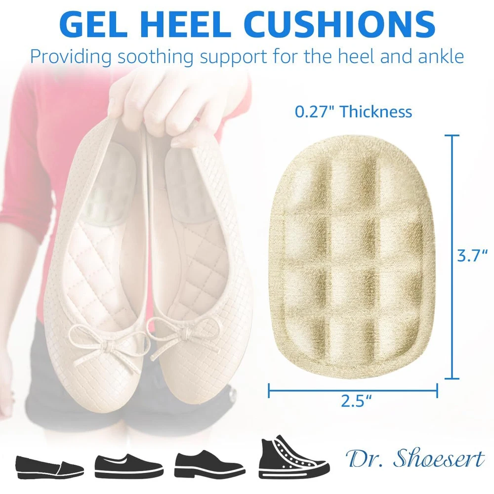 Dr. Shoesert 2 Pairs Heel Pads for Shoes, Heel Cushion Inserts for Shock Absorption, Heel Pain Relief and Plantar Fasciitis, Heel Inserts for Women and Men PACKAGE INCLUDES: 2 pair of comfortable heel pads for shoes. Soft Cushioning Material - This heel lift is designed for people who have heel pain and want extra cushioning. Made of soft gel material that provides all-day shock absorption and cushioning. The gel heel cups effectively reduce foot pain caused by heel spurs, bone spurs tendonitis, and plantar fasciitis. Strong Self-Adhesive - The heel pads virtually invisible design provides comfort while remaining discreet. Strong adhesive keeps the heel cup in place and won't slip around in the shoe. Great for people who always standing or walking. Reusable & Washable - Dr. Shoesert heel inserts are reusable & washable. Simply remove the sticky backing, then place the heel cushion inserts to make shoes fit. If you found it get dirty or without sticky, just wash in water and let it dry, then you will get a new one with stickiness. Fits Most Shoes - Available to be used in most types of shoes, such as work shoes, boots, flats, pumps. Add comfort and cushioning to the heel of your favorite shoes, and provides effective relief to heel area due to heel pain. Trusted Quality Assurance - We do not suggest customer return opened products to Amazon warehouse in case used products being resold to other customers. If you are not satisfied with our heel cushion pads, please feel free to reach us with your order ID and tell us how would you like us to help. We are ready to help you here and appreciate your kind understanding. PACKAGE INCLUDES: 2 pair of comfortable heel pads for shoes. Soft Cushioning Material - This heel lift is designed for people who have heel pain and want extra cushioning. Made of soft gel material that provides all-day shock absorption and cushioning. The gel heel cups effectively reduce foot pain caused by heel spurs, bone spurs tendonitis, and plantar fasciitis. Strong Self-Adhesive - The heel pads virtually invisible design provides comfort while remaining discreet. Strong adhesive keeps the heel cup in place and won't slip around in the shoe. Great for people who always standing or walking. Reusable & Washable - Dr. Shoesert heel inserts are reusable & washable. Simply remove the sticky backing, then place the heel cushion inserts to make shoes fit. If you found it get dirty or without sticky, just wash in water and let it dry, then you will get a new one with stickiness. Fits Most Shoes - Available to be used in most types of shoes, such as work shoes, boots, flats, pumps. Add comfort and cushioning to the heel of your favorite shoes, and provides effective relief to heel area due to heel pain. Trusted Quality Assurance - We do not suggest customer return opened products to Amazon warehouse in case used products being resold to other customers. If you are not satisfied with our heel cushion pads, please feel free to reach us with your order ID and tell us how would you like us to help. We are ready to help you here and appreciate your kind understanding. Shipping from the USA All of our products are shipped from the USA, ensuring quick delivery to your destination. Payment We offer the following payment methods: PayPal, credit card, bank transfer, and eBay's secure payment system. Free Shipping & Free Returns Shipping within the USA is FREE. Additionally, any return is absolutely free for you. Risk-Free Purchase You have the option to return an item within 30 days without any justification. We cover the return shipping costs! Fast Shipping We ship immediately upon receipt of payment. Generally, the package is delivered within 2-3 days in the USA. If it takes longer, we will contact you. Quality and Costs Made in Europe, USA, China No customs fees or additional charges Total satisfaction guarantee Invoice with declared VAT available upon request in .pdf format Feedback Your feedback is very important to us. After you pay for your purchase, you will automatically receive positive feedback from us.