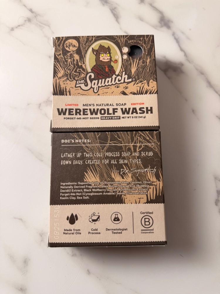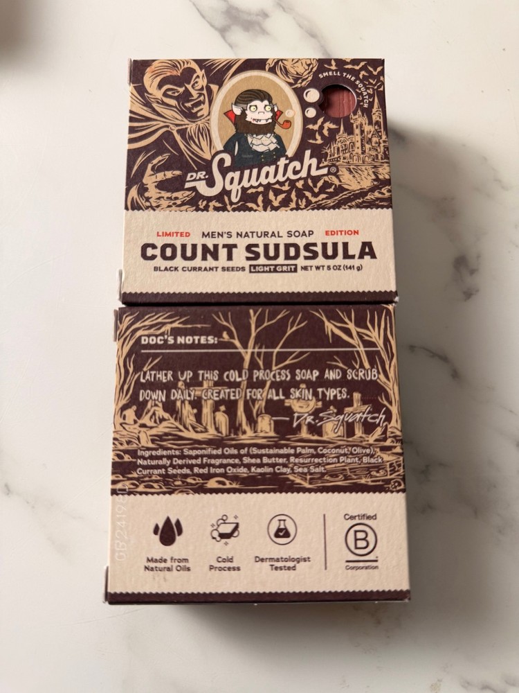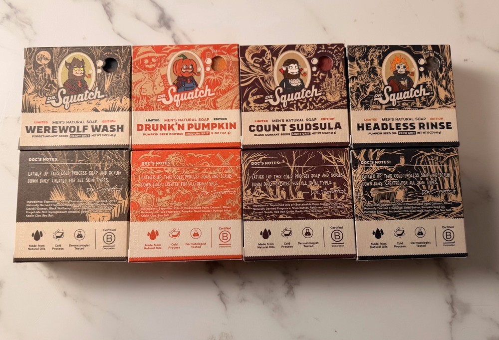 The Dr. Squatch Limited Edition Soap Bundle (8-Pack) delivers a full lineup of limited-edition spooky scents made with natural ingredients and zero harsh chemicals. Stock up for the season with bold, masculine bars that keep you fresh. 8 full-size Dr. Squatch bars - 2 Zero Grit bars (no exfoliation) - 2 Light Grit bars - 2 Medium Grit bars - 2 Heavy Grit bars