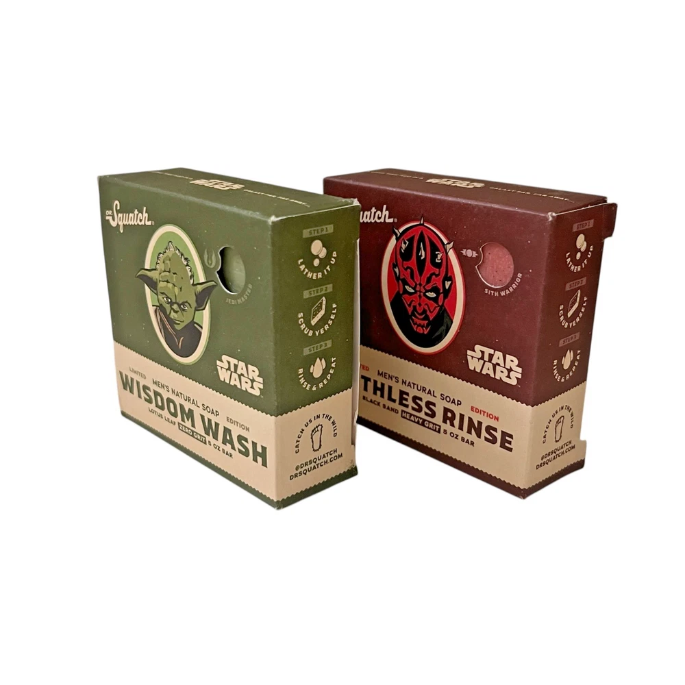 Limited edition Dr Squatch Star Wars men’s natural soap set. Includes two themed bars from the Star Wars collection. Both bars are new and sealed in original retail packaging. Included in this set: • Wisdom Wash. Yoda edition • Ruthless Rinse. Darth Maul edition Product details: • Brand. Dr Squatch • Collection. Star Wars Limited Edition • Bar size. 5 oz each • Cold process soap • Made from natural oils • No harsh chemicals Scent and grit: • Wisdom Wash. Lotus Leaf scent. Zero grit • Ruthless Rinse. Black Sand and Dragon Fruit scent. Heavy grit Condition New. Unused. Boxes show minor shelf wear from storage.