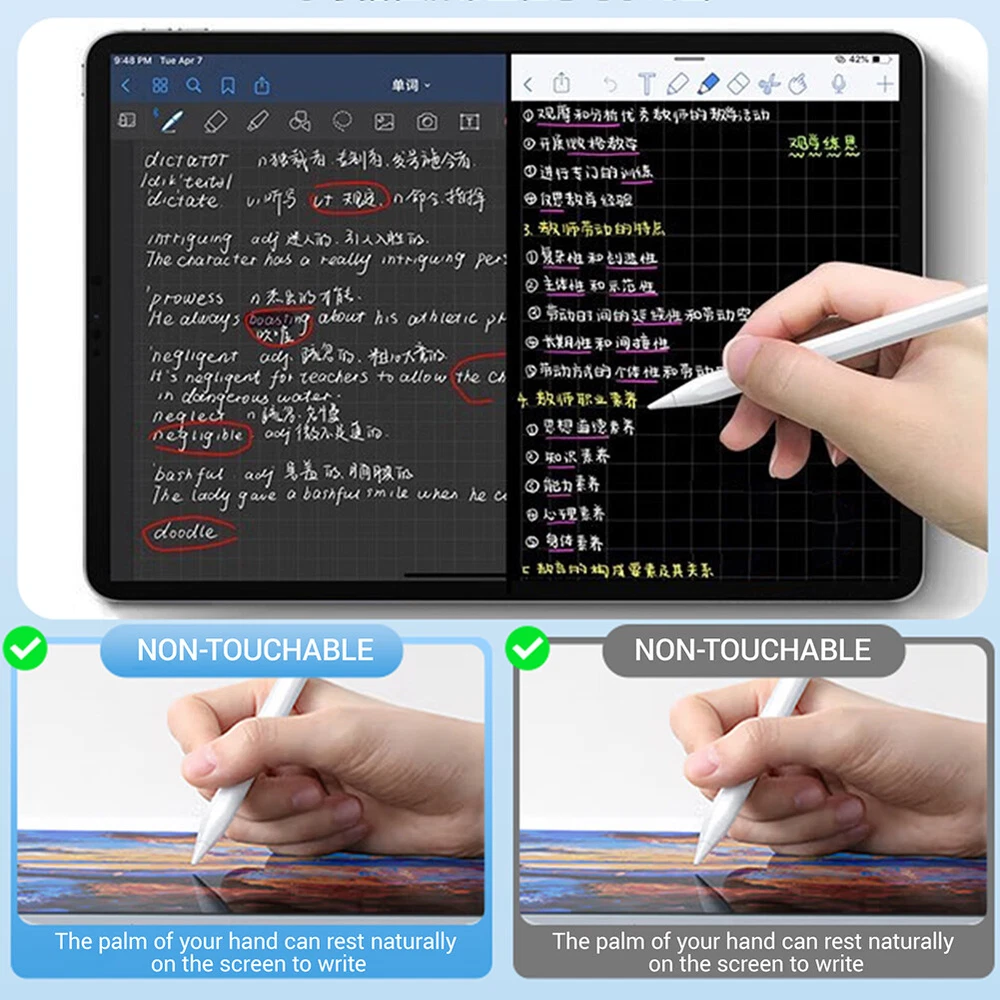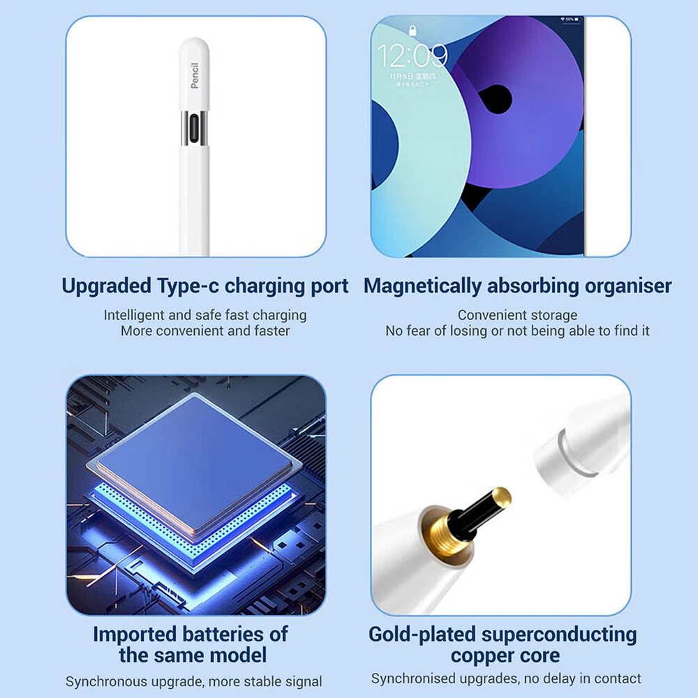 Product Description Features: -Bluetooth display: Through Bluetooth connection, the battery level is displayed in real-time, allowing you to keep track of usage and no longer worry about low battery. -Magnetic charging: It adopts a magnetic charging design, which is convenient and fast. With just a gentle suction, you can start charging. Say goodbye to tedious insertion and removal operations, and make your use more efficient. -Full screen anti accidental touch: The specially designed anti accidental touch function allows you to no longer be troubled by accidental touch during full screen operation, ensuring that every operation is accurate and error free. -Sensitive without delay: A highly sensitive touch experience with no delay response, allowing you to enjoy a smooth and smooth experience while drawing, taking notes, or any touch operation. Specifications: -Type: Writing pen -Quantity: 1 piece -Color: White -Applicable:fit for iPad Pro / Air 11" 13" 2024 for iPad 5/6/7/8/9/10th Gen 2017-2022 for iPad Pro 1/2/3/4th Gen 11" 2018-2022 for iPad Pro 3/4/5/6th Gen 12.9" 2018-2022 for iPad Mini 5/6th Gen 2019/2021 for iPad Air 3/4/5th Gen 2019-2022 Packaging included: 1 * Writing pen 1 * Product manual